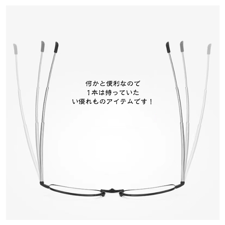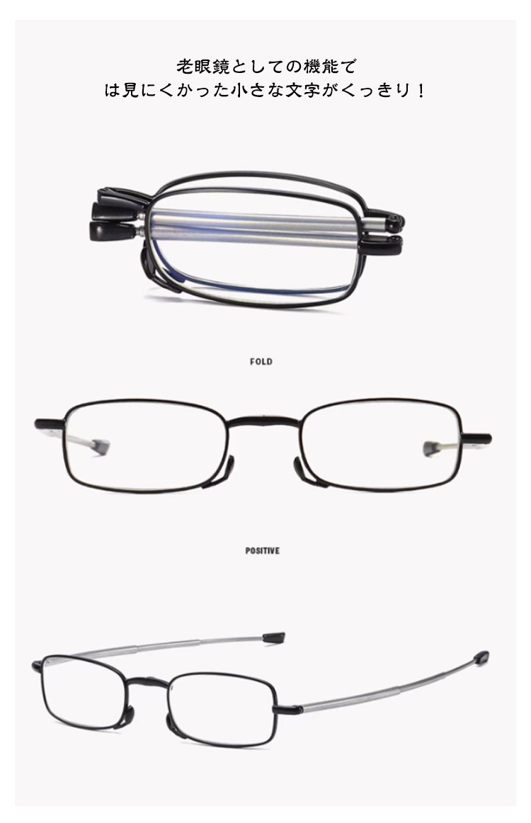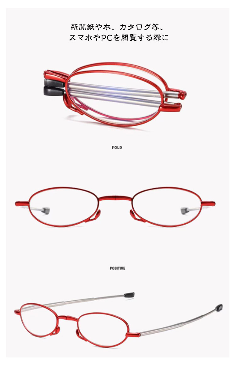 | 【折り畳み老眼鏡】【専用ケース付き】【ブルーライトカット】 老眼鏡もおしゃれに使いたい! 専用ケース付きで持ち運びも楽ちん。 胸ポケットに入るコンパクトサイズ オシャレなデザインのファッションシニアグラスです。 眼にやさしいブルーライトカットレンズが、 PCやスマートフォンからの刺激の強い光をカット。 老眼鏡としての機能では見にくかった小さな文字がくっきり! 新聞紙や本、カタログ等、スマホやPCを閲覧する際に 何かと便利なので1本は持っていたい優れものアイテムです! | |