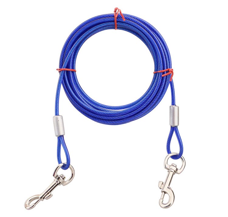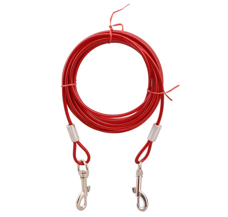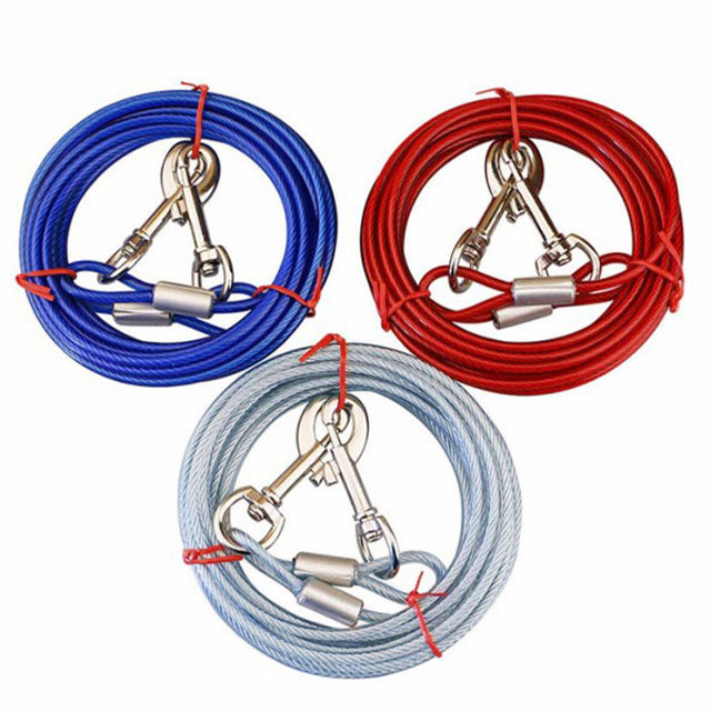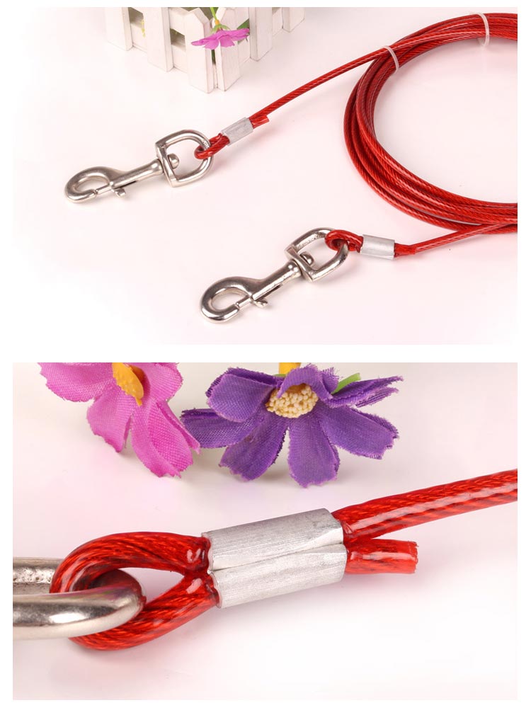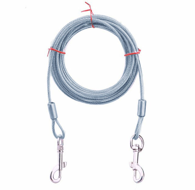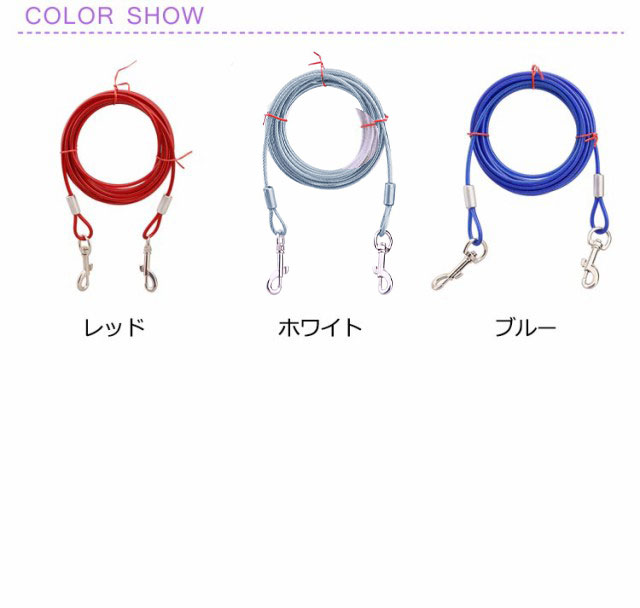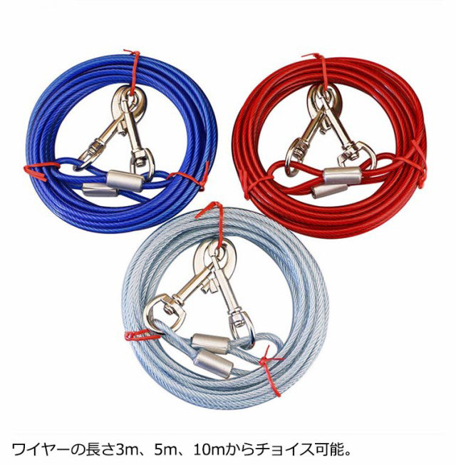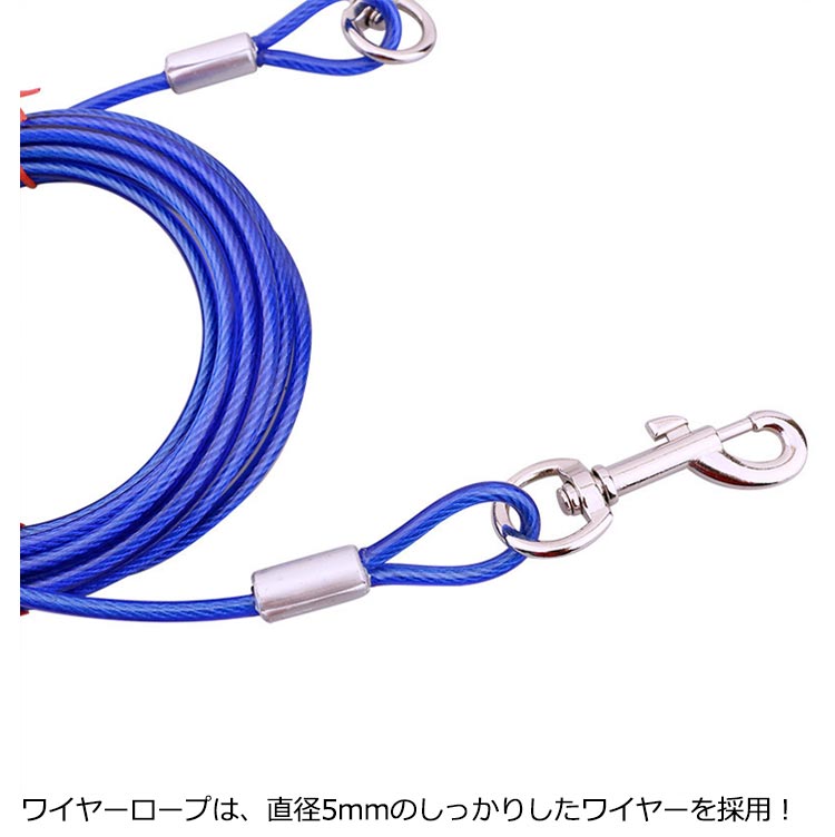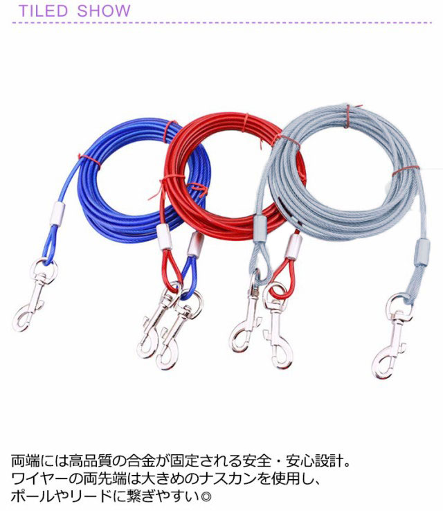 | 高張力強度?高耐久性のワイヤーリード。 両端には高品質の合金が固定される安全?安心設計。ワイヤーの両先端は大きめのナスカンを使用し、ポールやリードに繋ぎやすい◎ ワイヤーロープは、直径5mmのしっかりしたワイヤーを採用! ワイヤーの長さ3m、5m、10mからチョイス可能。 | |