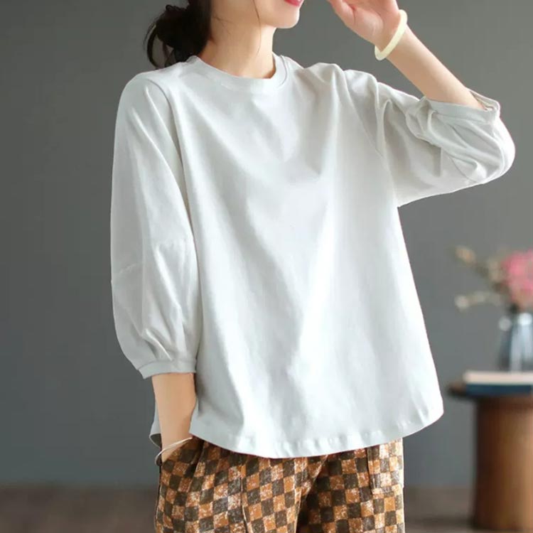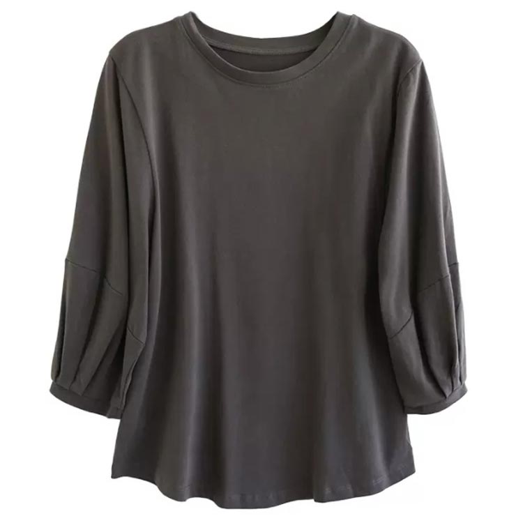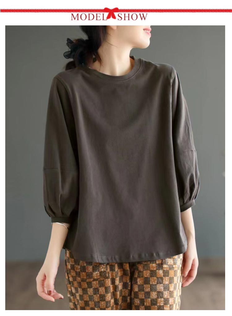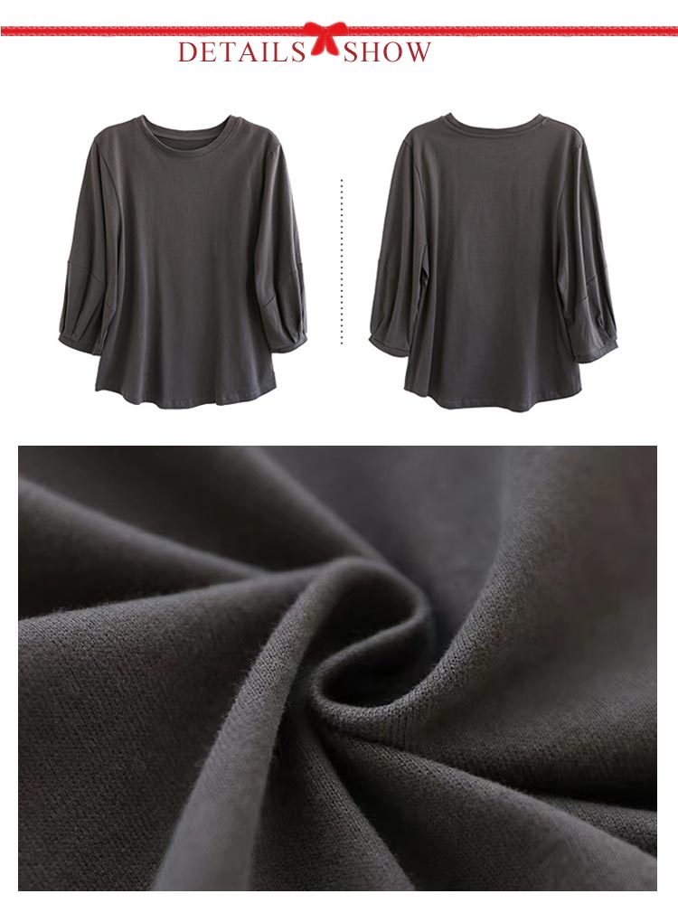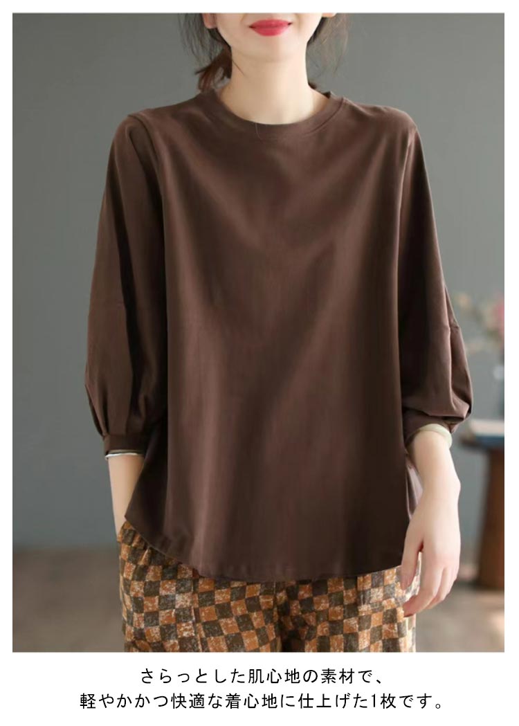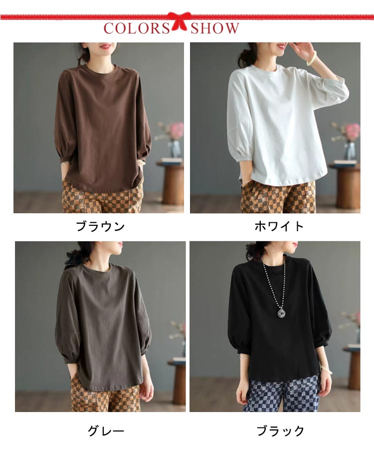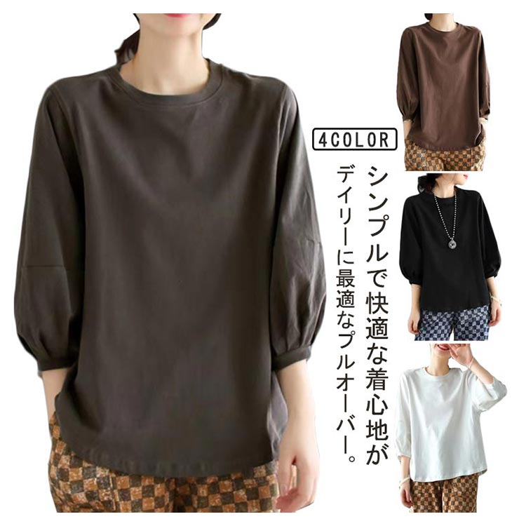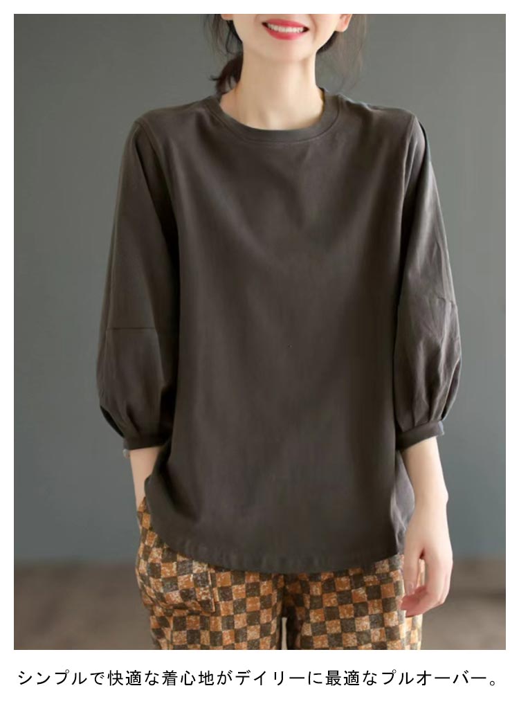 プルオーバー 7分袖 レディース カットソー トップス Tシャツ パフ袖 ボリュームスリーブ ぽわん袖 七分袖 クルーネック 無地 シンプル ゆったり 長袖tシャツ 春 夏 秋 カジュアル 大きいサイズ 送料無料