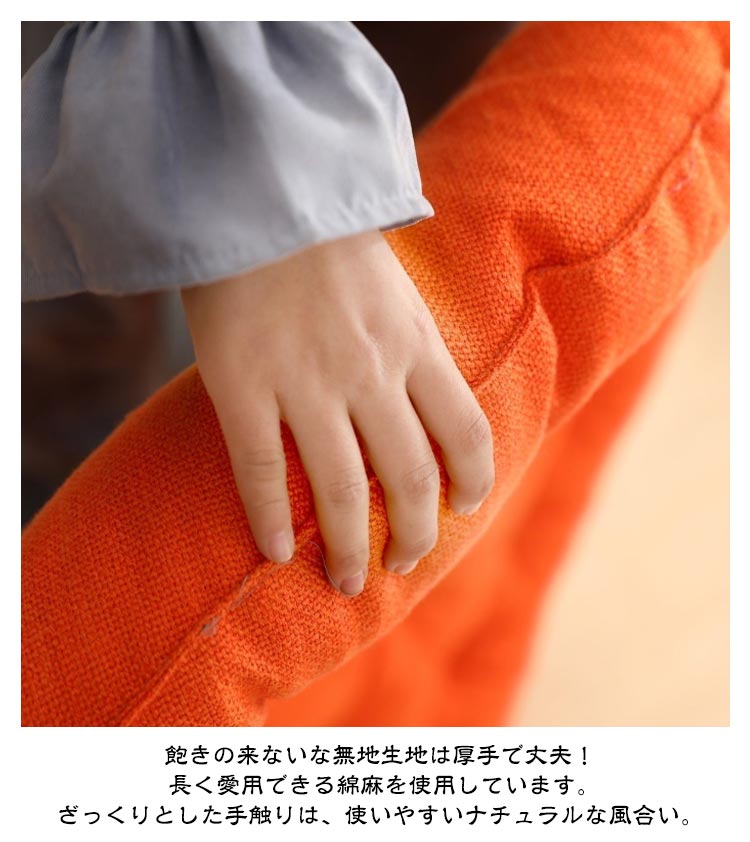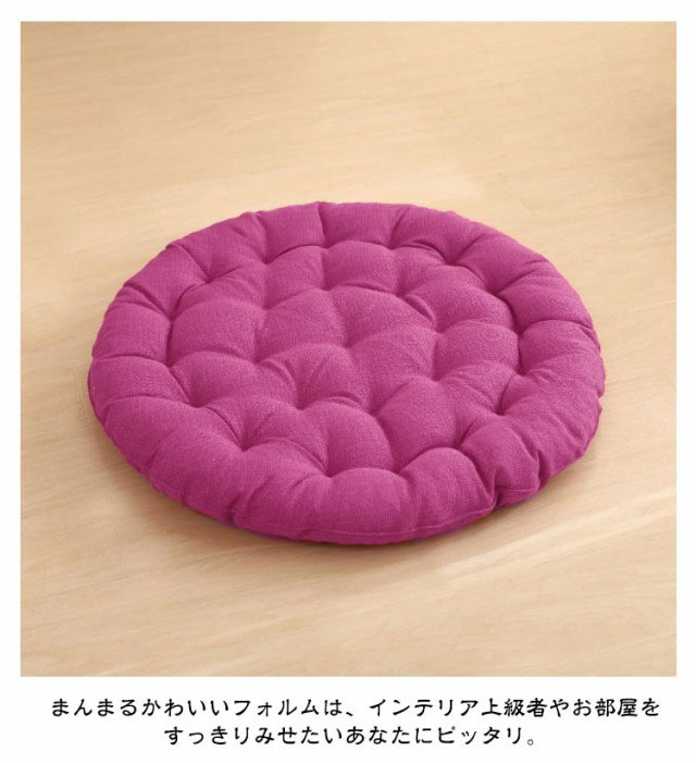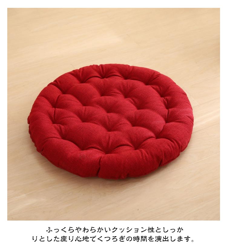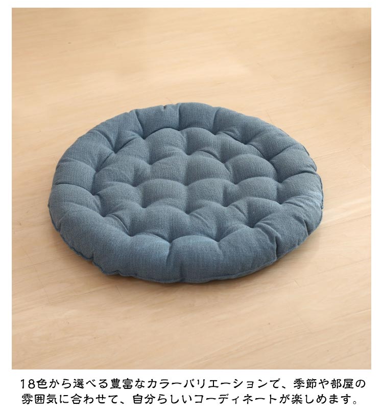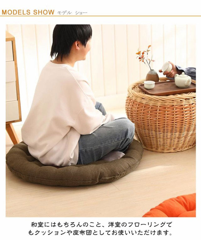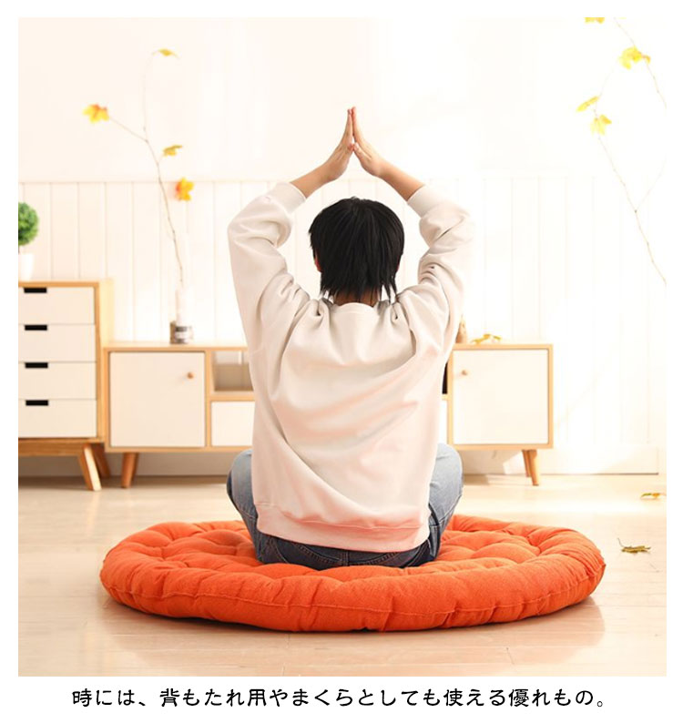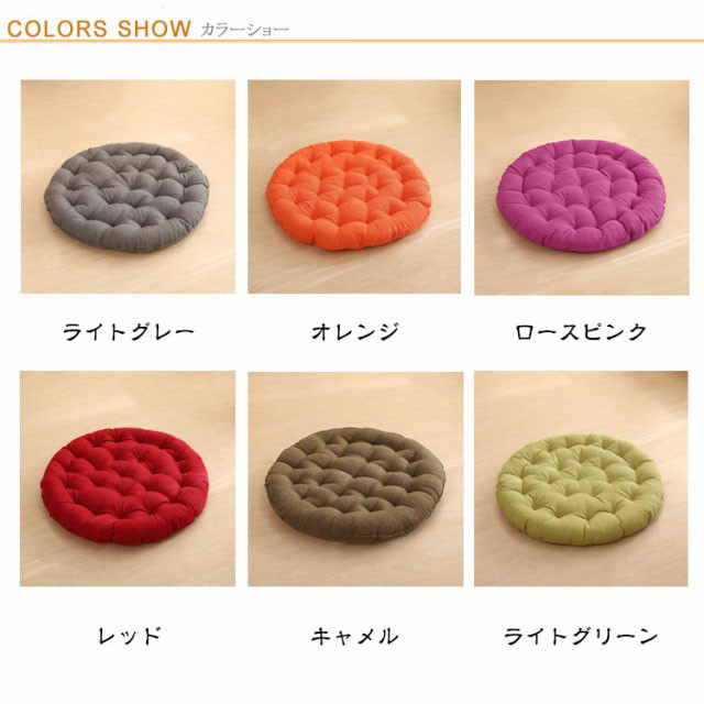 | 大きいサイズの丸型綿麻座布団! 直径65cm 和室にはもちろんのこと、洋室のフローリングでもクッションや座布団としてお使いいただけます。 時には、背もたれ用やまくらとしても使える優れもの。 直径65cm、厚さ10cm、大きなラウンド型クッションは胡坐をかいても、ゆったりボリュームのある大きいサイズです? まんまるかわいいフォルムは、インテリア上級者やお部屋をすっきりみせたいあなたにピッタリ。 ふっくらやわらかいクッション性としっかりとした座り心地でくつろぎの時間を演出します。 飽きの来ないな無地生地は厚手で丈夫! 長く愛用できる綿麻を使用しています。 ざっくりとした手触りは、使いやすいナチュラルな風合い。 11色から選べる豊富なカラーバリエーションで、季節や部屋の雰囲気に合わせて、自分らしいコーディネートが楽しめます。 | |