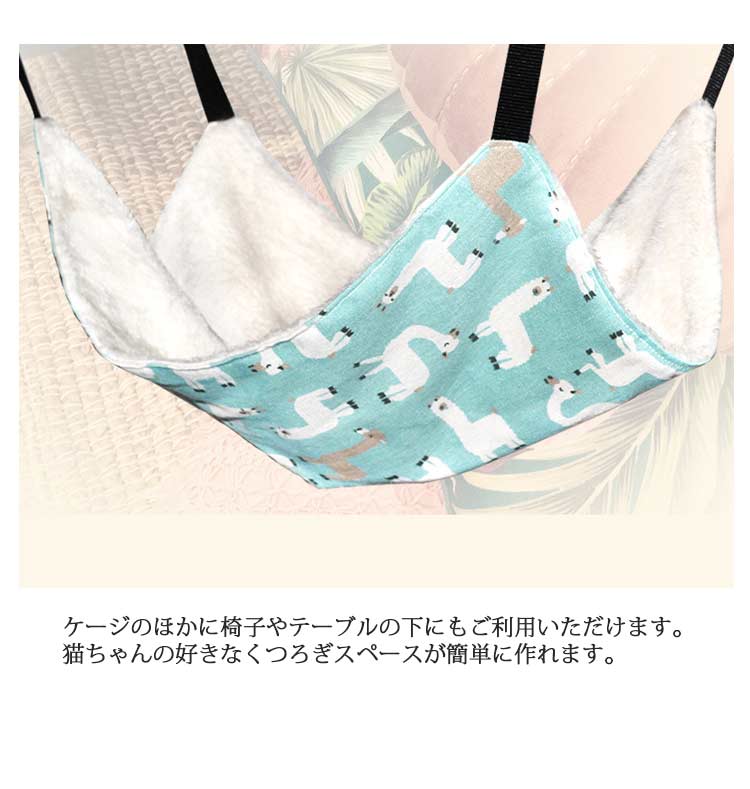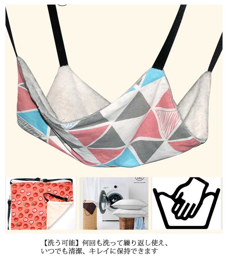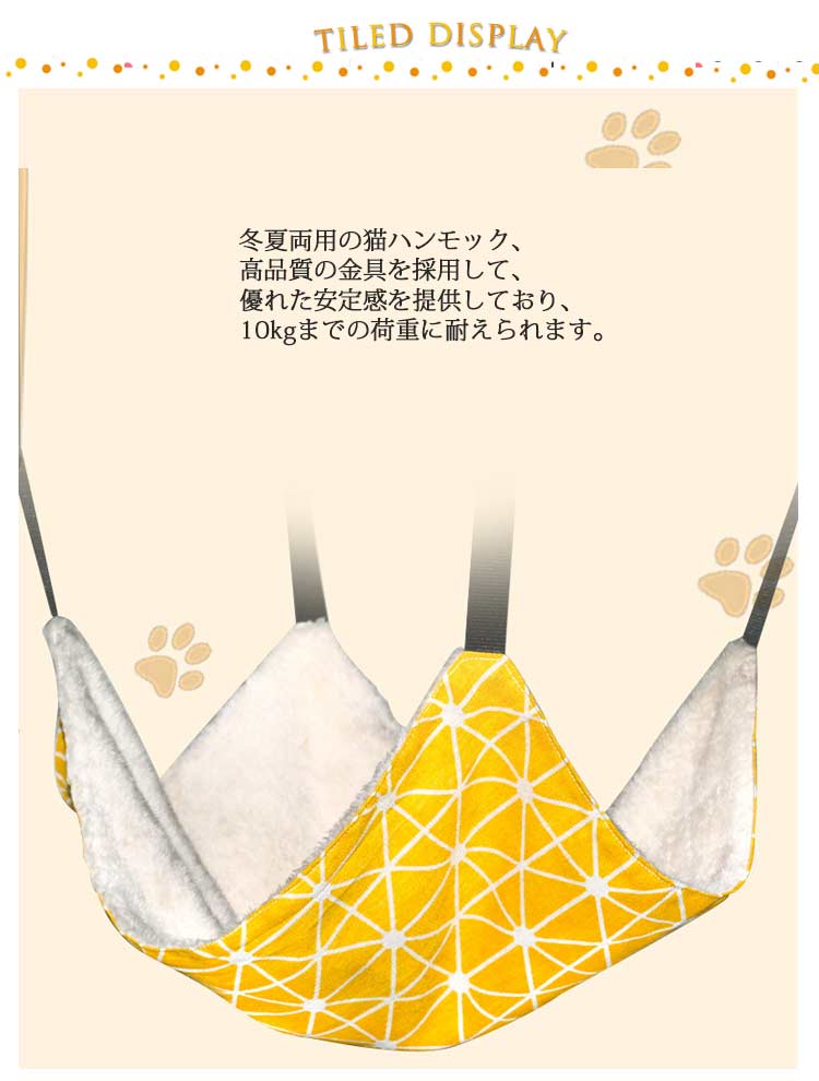 【冬夏両用】冬夏両用の猫ハンモック、高品質の金具を採用して、優れた安定感を提供しており、10kgまでの荷重に耐えられます。【優れた素材】このハンモックは一面が柔らかい素材で暖かい肌触りで、ふわふわの暖かい冬用です。もう一面がキャンバス生地で、通気性に優れていて、暑い夏用です。丈夫で猫の引っかきを耐えられます。猫はもちろん、小型犬、ウサギなどにも適用します。【調節可能】 四つのストラップにベルトバックルが採用されています。ベルトの長さが取り付け場所やケージのサイズにより調節可能です。【取り付簡単】 フックで簡単にケージに取り付けられます。ケージのほかに椅子やテーブルの下にもご利用いただけます。猫ちゃんの好きなくつろぎスペースが簡単に作れます。【洗う可能】何回も洗って繰り返し使え、いつでも清潔、キレイに保持できます