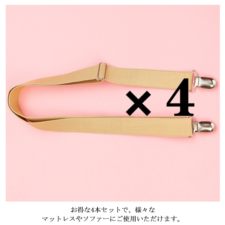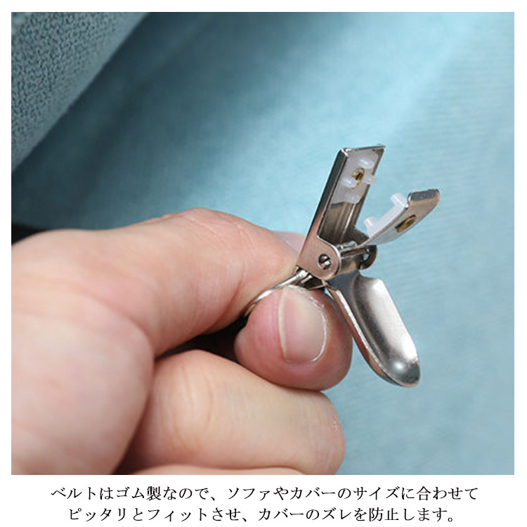 | マルチカバーをソファーの底部から背面でしっかり固定できるサスペンダー。 ソファーシーツのずれを防止する、シーツクリップ同色4本セットです。 金具で長さ調節ができ、強力クリップでがっちり挟むので、外れにくく安心です。 ベルトはゴム製なので、ソファやカバーのサイズに合わせてピッタリとフィットさせ、カバーのズレを防止します。 お得な4本セットで、様々なマットレスやソファーにご使用いただけます。 | |
