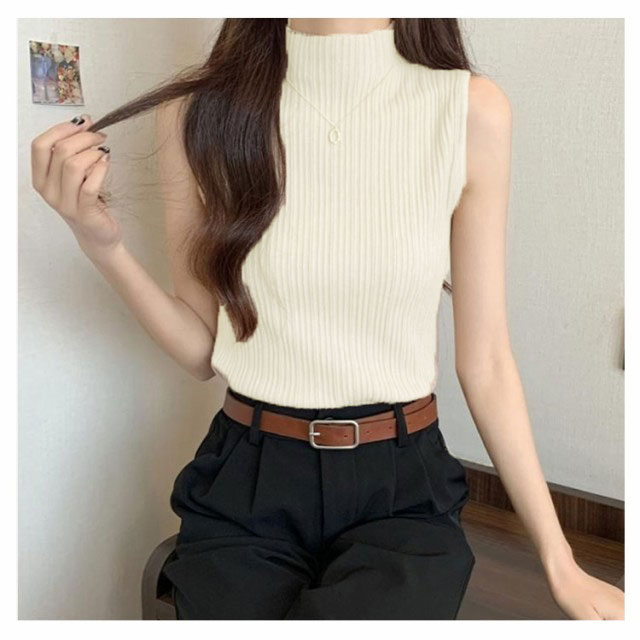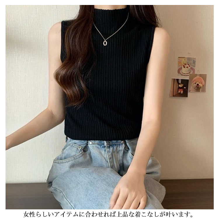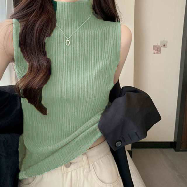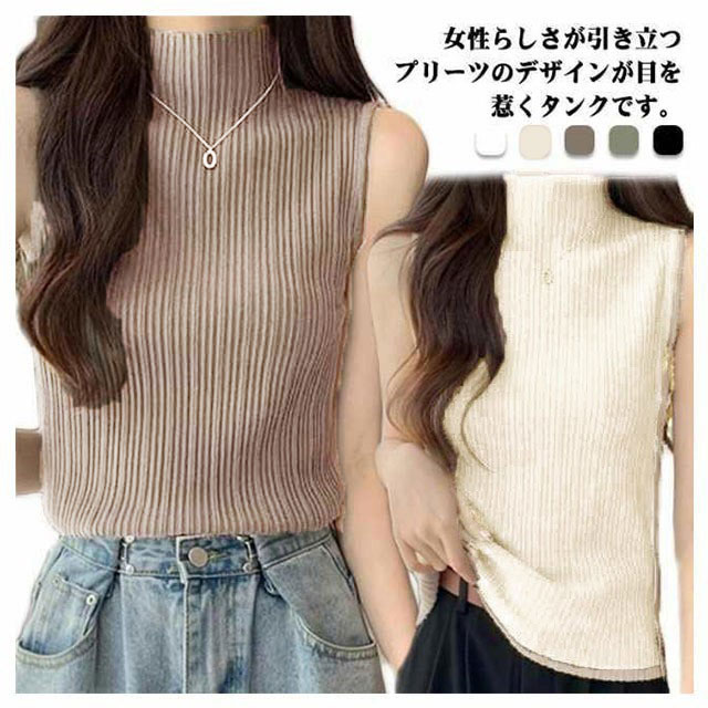 プリーツ タンクトップ レディース ハイネック ノースリーブ Tシャツ ニットトップス ストレッチ トップス ハイネックニット レイヤード シンプル 春 夏 全5色 サマーニット XS S M L XL