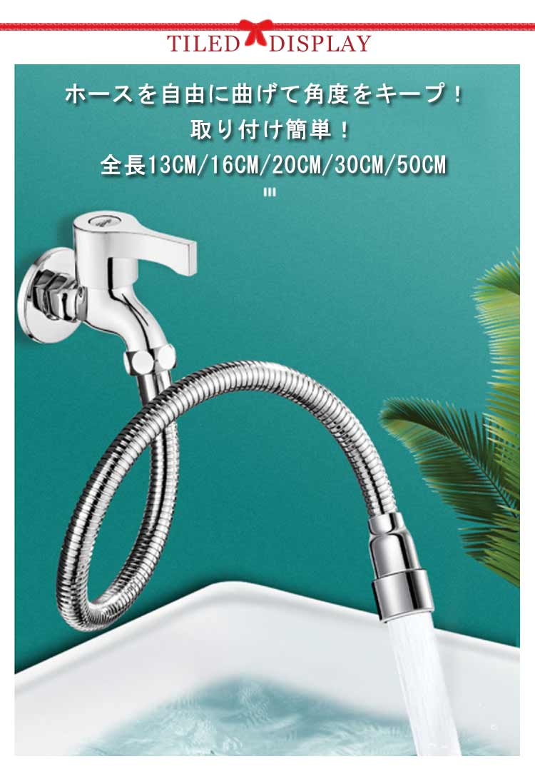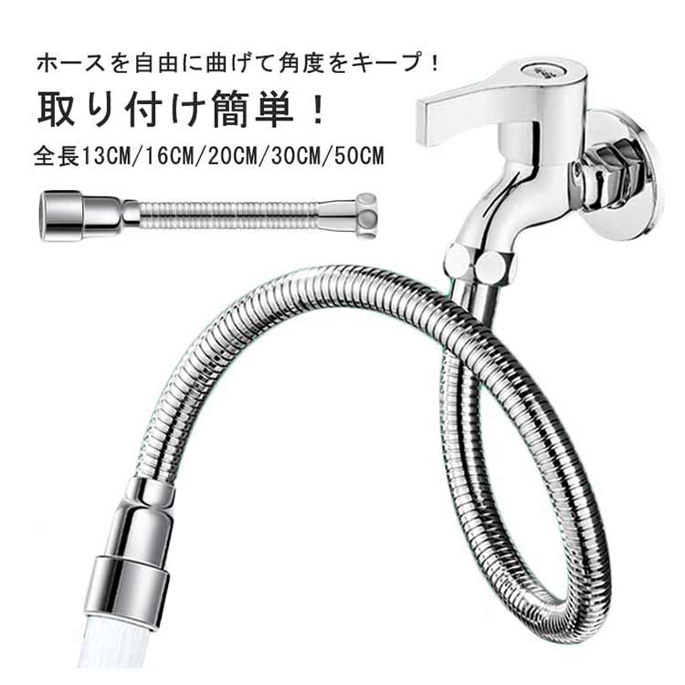 ホースを自由に曲げて角度をキープ! 取り付け簡単!全長13cm/16cm/20cm/30cm/50cm角度が自在の蛇口ホース。工事不要で取り付け簡単!泡沫タイプのシャワー口で水が飛び跳ねにくい。節水効果あり。横水栓・万能ホーム水栓・自在水栓対応。