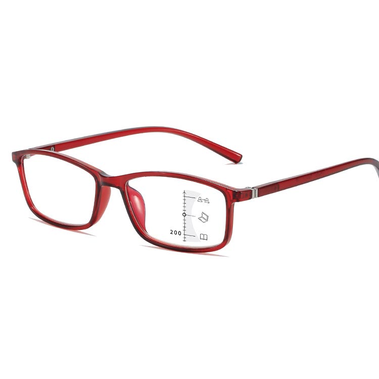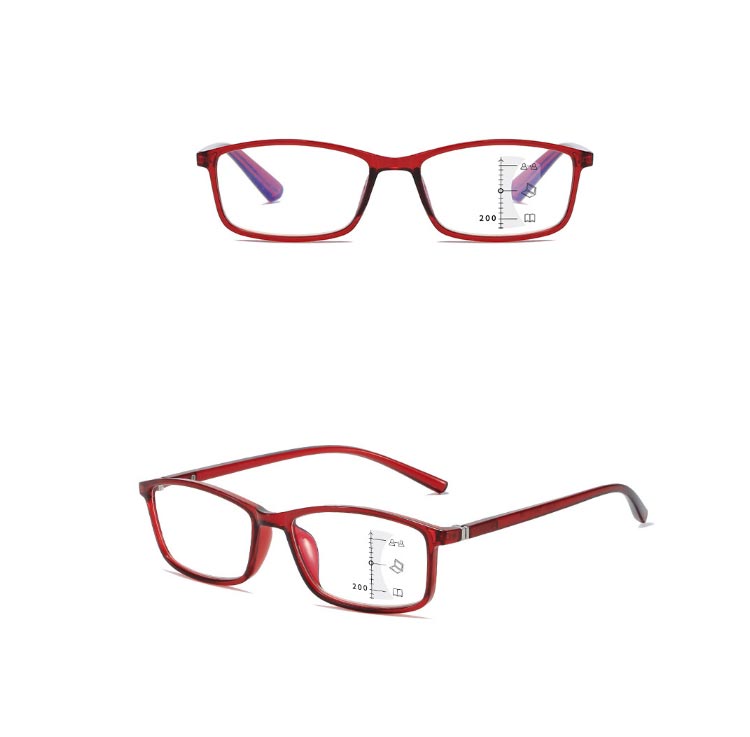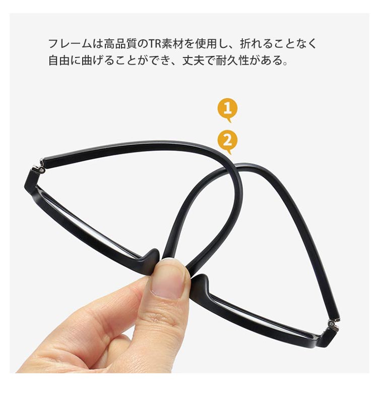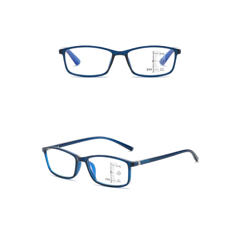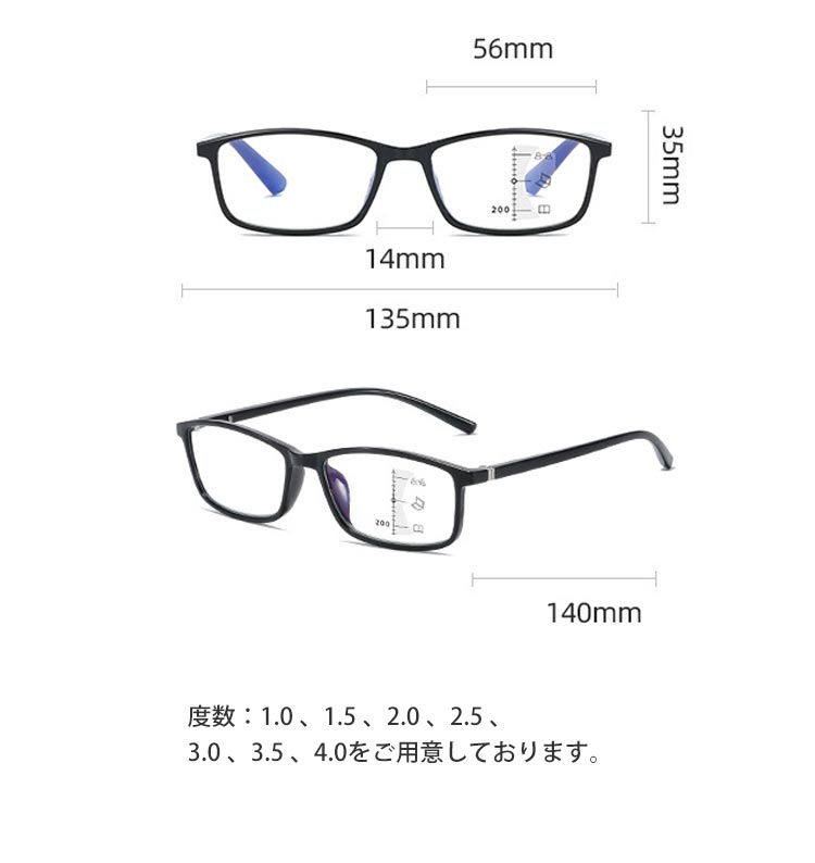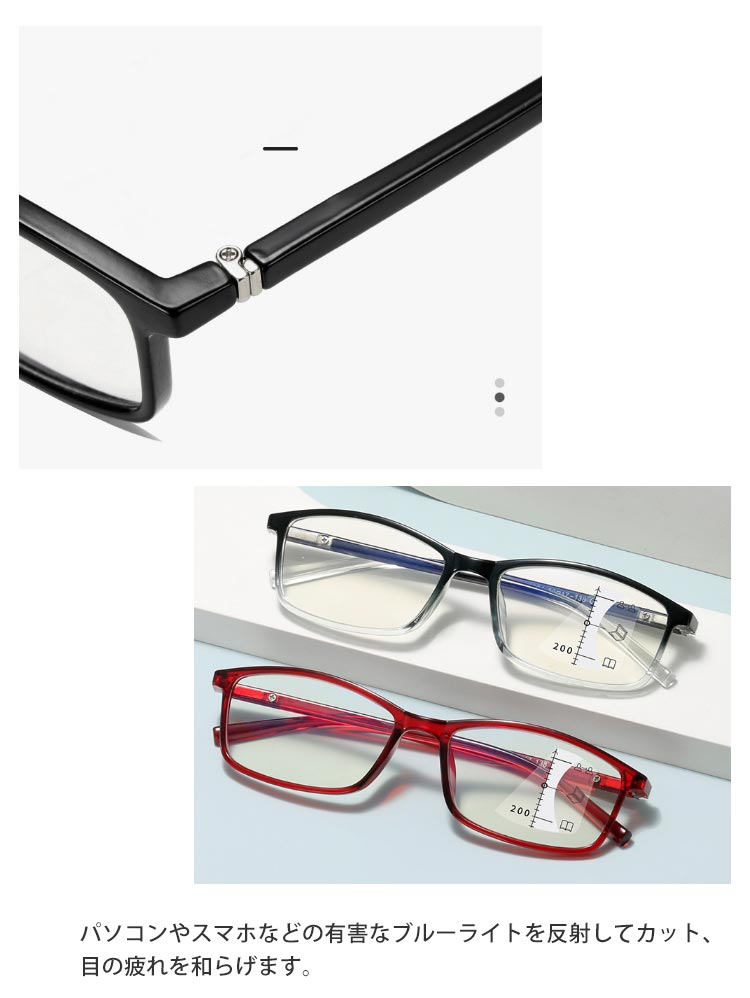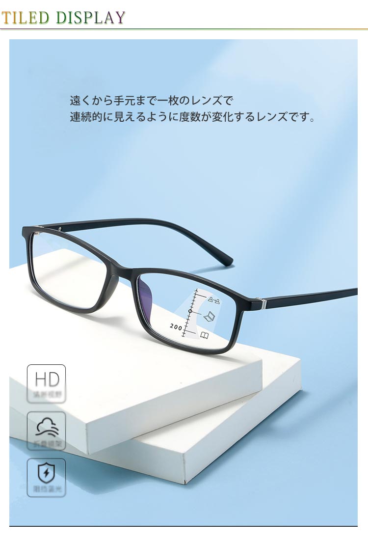 【遠近両用メガネ】【ブルーライトカット】【累進多焦点レンズ】遠くから手元まで一枚のレンズで連続的に見えるように度数が変化するレンズです。レンズ上部の遠くを見る部分から、下部の近くを見る部分まで徐々に度数が変化し、遠く、中間、近くに視線を上下することにより、快適な視界を得ることができます。パソコンやスマホなどの有害なブルーライトを反射してカット、目の疲れを和らげます。フレームは高品質のTR素材を使用し、折れることなく自由に曲げることができ、丈夫で耐久性がある。光の反射や映り込みを防止するため物が見やすく、細かい文字を見るパソコンやスマートフォン操作等に最適な老眼鏡です。度数:1.0 、1.5 、2.0 、2.5 、3.0 、3.5 、4.0をご用意しております。