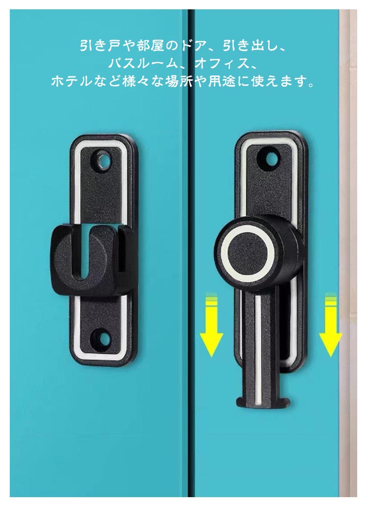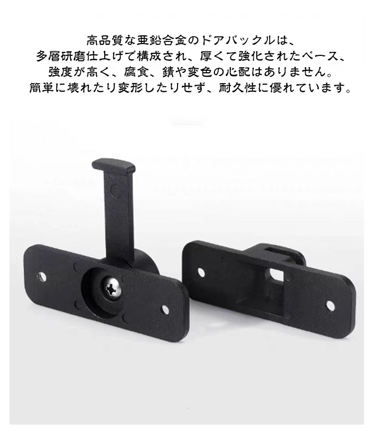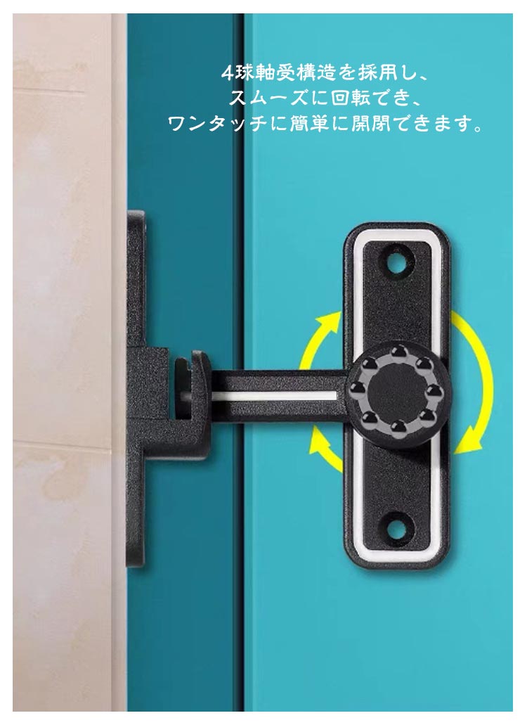 【90度・180度2WAY仕様】90度も180度も取り付けられるから、開き戸も引き戸も様々なドアに対応できます。【高品質素材】高品質な亜鉛合金のドアバックルは、多層研磨仕上げで構成され、厚くて強化されたベース、強度が高く、腐食、錆や変色の心配はありません。簡単に壊れたり変形したりせず、耐久性に優れています。4球軸受構造を採用し、スムーズに回転でき、ワンタッチに簡単に開閉できます。【便利でシンプル】便利なフリップデザイン、プライバシーロック、フラップは、より快適な生活環境のためにさらなるセキュリティを提供します。【取付けも簡単】取り付け用のネジが付属しているため、留め具をすぐに設置する事ができます。左または右にインストールすることを選択できます。ドアや窓の安全を確保するために使用できます。【安全保護】子供ケガ防止だけでなく、部屋の外に出ていかないようにしたり、様々な危険を防止できます。簡単施錠でスライドドアの防犯対策ができます。猫の脱走防止用としてもお使いいただけます。【幅広い用途】引き戸や部屋のドア、引き出し、バスルーム、オフィス、ホテルなど様々な場所や用途に使えます。ネジの設置手順設置位置をあらかじめ設定し、 マークを付けます。記号に従ってネジを締めます。距離を左右に調整し、 写真のように端に寄せます。位置を繰り返し調整します。同じように穴の位置を合わせ、 ネジを締めて固定します。使用しないときは、写真のように垂直に吊るしてください。釘なし接着剤の設置手順:設置位置をあらかじめ設定し、 マークを付けます。台座に釘なし接着剤を塗ります。留め具をしぼって接着し、 脱落防止の補助シールを 貼ります。位置を繰り返し調整します。同様に接着剤を塗ります。 (ネジは塗布しない)補助シールを貼った後、 72時間静置します。 (冬はもっと長い)
