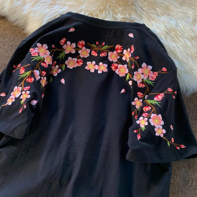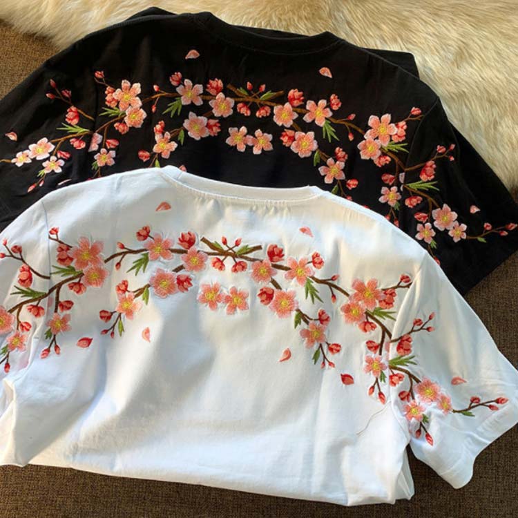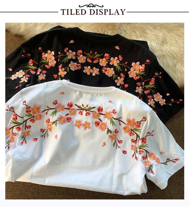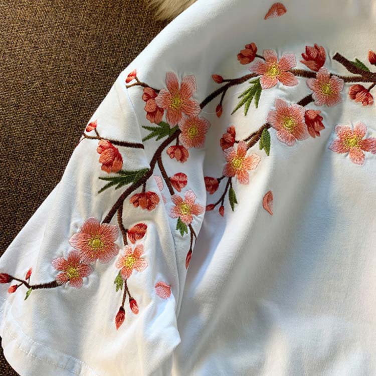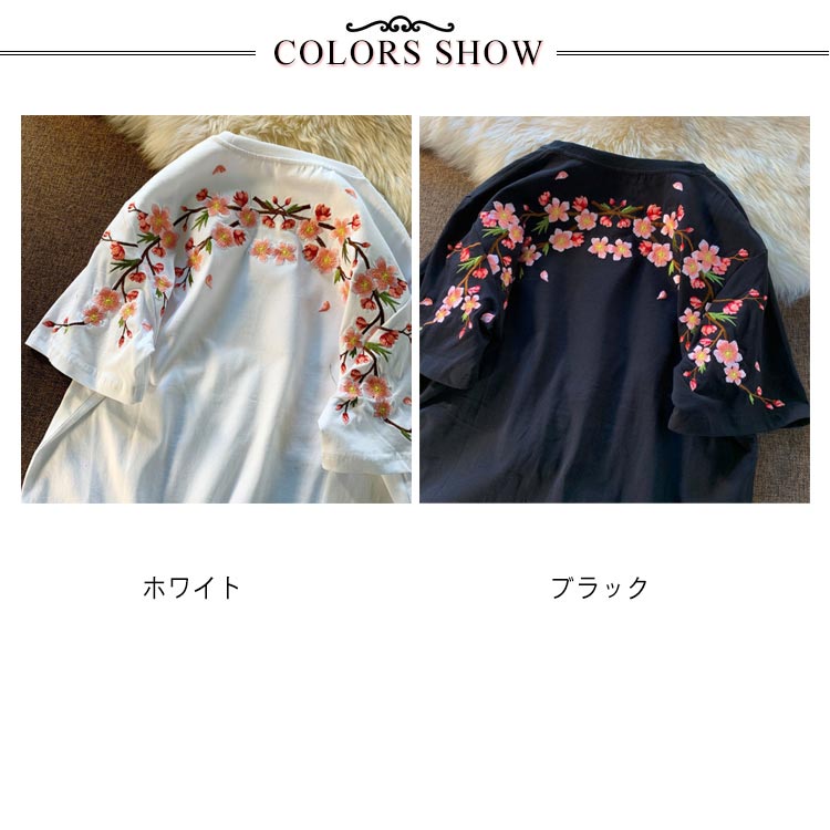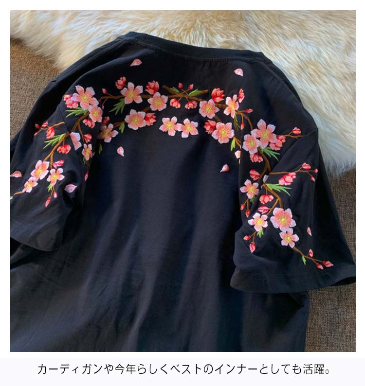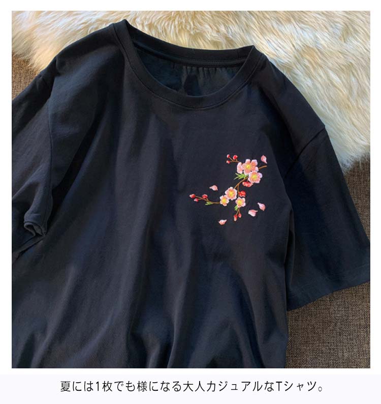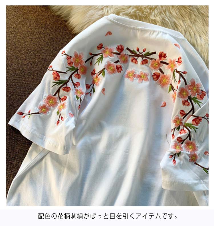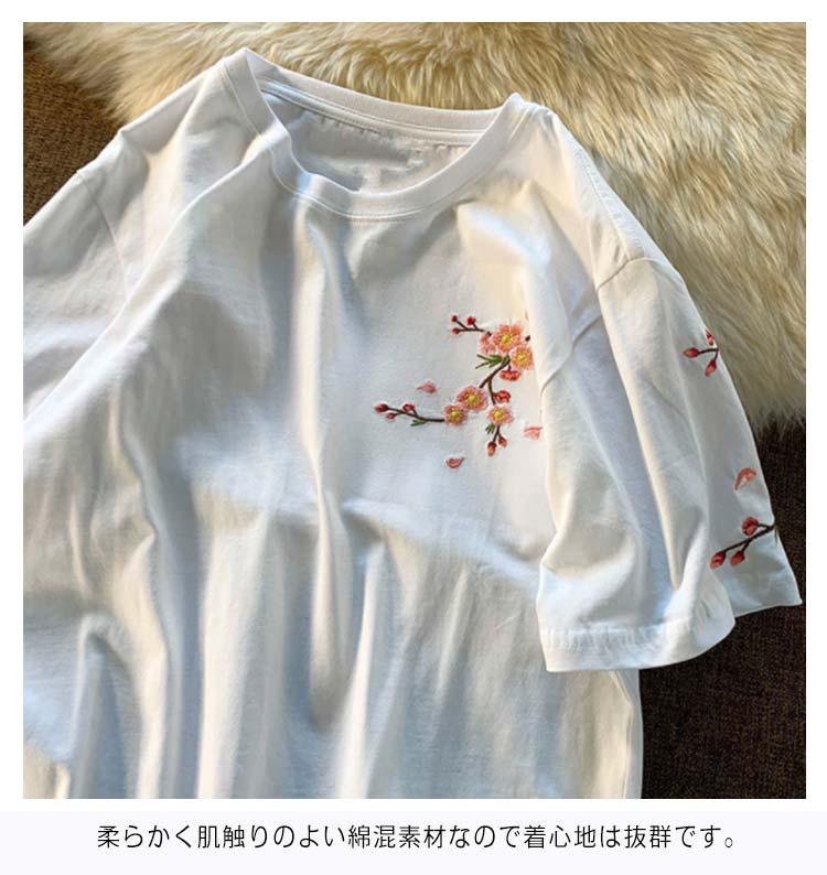Tシャツ レディース 半袖 花柄 刺繍 tシャツ カットソー 春 夏 Uネック クルーネック トップス 薄手 綿混 コットン混 カジュアル きれいめ おしゃれ 夏服 夏物 送料無料