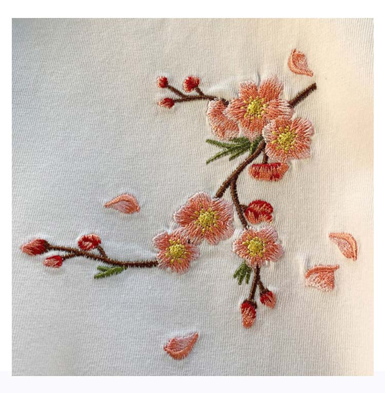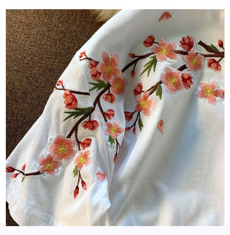 花柄刺繍を施した半袖です。柔らかく肌触りのよい綿混素材なので着心地は抜群です。配色の花柄刺繍がぱっと目を引くアイテムです。カーディガンや今年らしくベストのインナーとしても活躍。夏には1枚でも様になる大人カジュアルなTシャツ。
