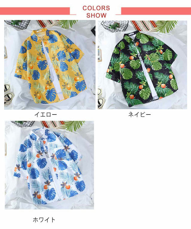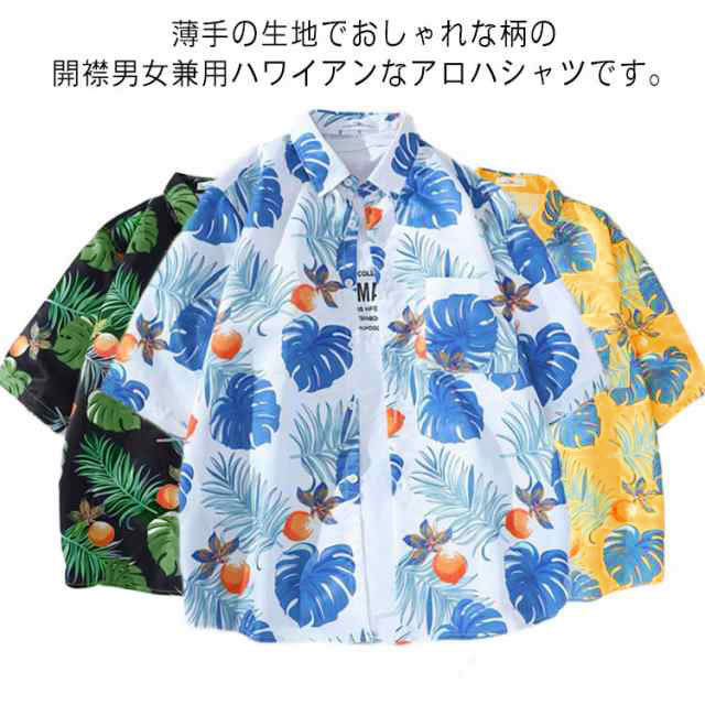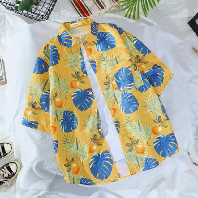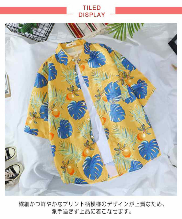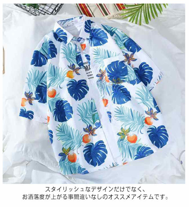通気性と速乾性を持つ上質ポリエステル生地を採用し、肌に優しいです。絶妙な仕立てと縫製、しっかりとした生地で丈夫なのです。薄手の生地でおしゃれな柄の開襟男女兼用ハワイアンなアロハシャツです。繊細かつ鮮やかなプリント柄模様のデザインが上質なため、派手過ぎず上品に着こなせます。スタイリッシュなデザインだけでなく、お洒落度が上がる事間違いなしのオススメアイテムです。大きめのビッグシルエットですので、Tシャツと重ね着スタイルで、さわやかな印象です。羽織としても日焼け止めできて、冷房の中に保温もできて、簡単におしゃれを楽しめる便利なメンズシャツです!シャツ1枚で着用はもちろん、ボタンを開けて、カーディガンシャツとして重ね着用も抜群です。デニムパンツやスキニーパンツ、ワイドパンツ、イージーパンツ、ショートパンツなどどんなボトムスとも相性が良く、アウトドアなど様々なシーンで活躍に間違いないです。