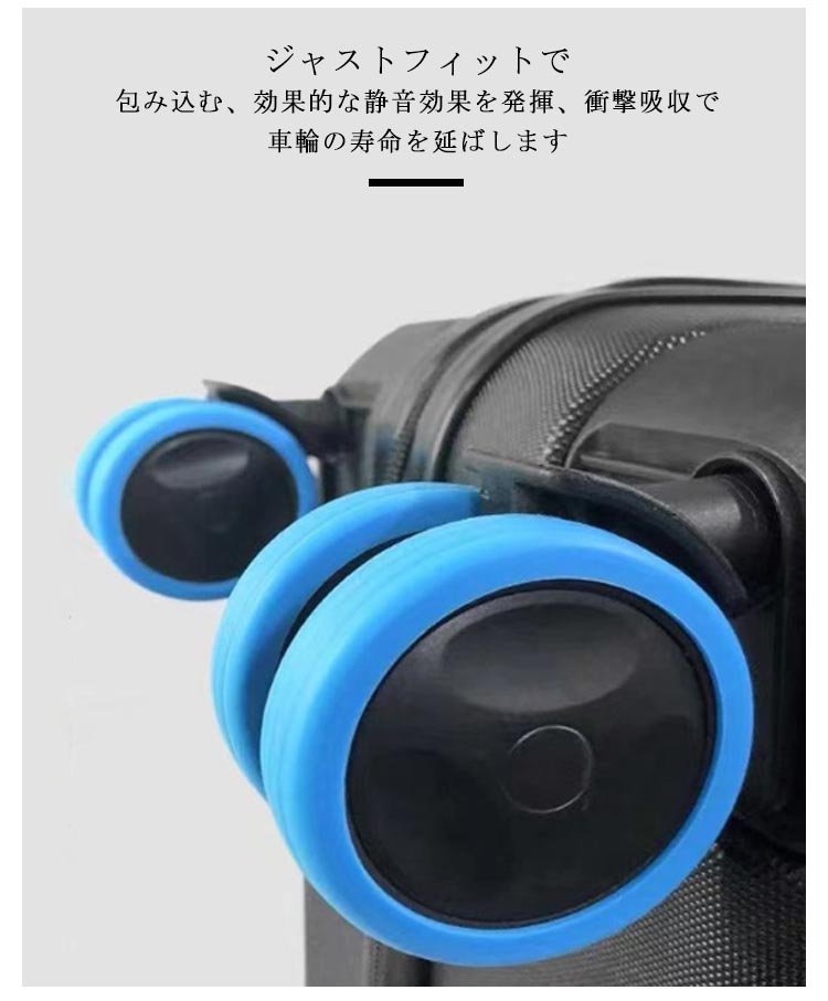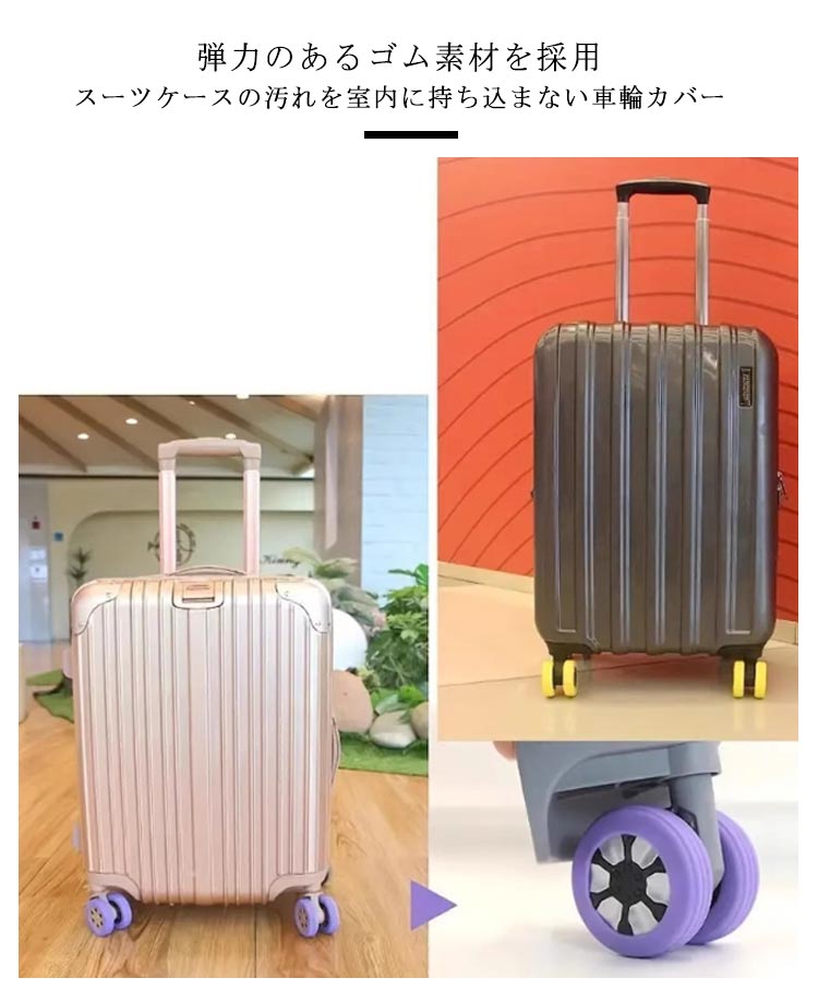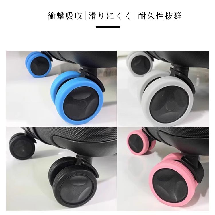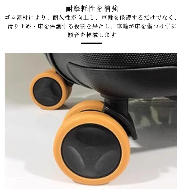 ジャストフィットで包み込む、効果的な静音効果を発揮、衝撃吸収で車輪の寿命を延ばします弾力のあるゴム素材を採用スーツケースの汚れを室内に持ち込まない車輪カバー衝撃吸収|滑りにくく|耐久性抜群耐摩耗性を補強ゴム素材により、耐久性が向上し、車輪を保護するだけでなく、滑り止め・床を保護する役割を果たし、車輪が床を傷つけずに騒音を軽減します様々なシーンに対応・幅広い用途で活用できるノイズを軽減し、さまざまな路面状態に対応できる