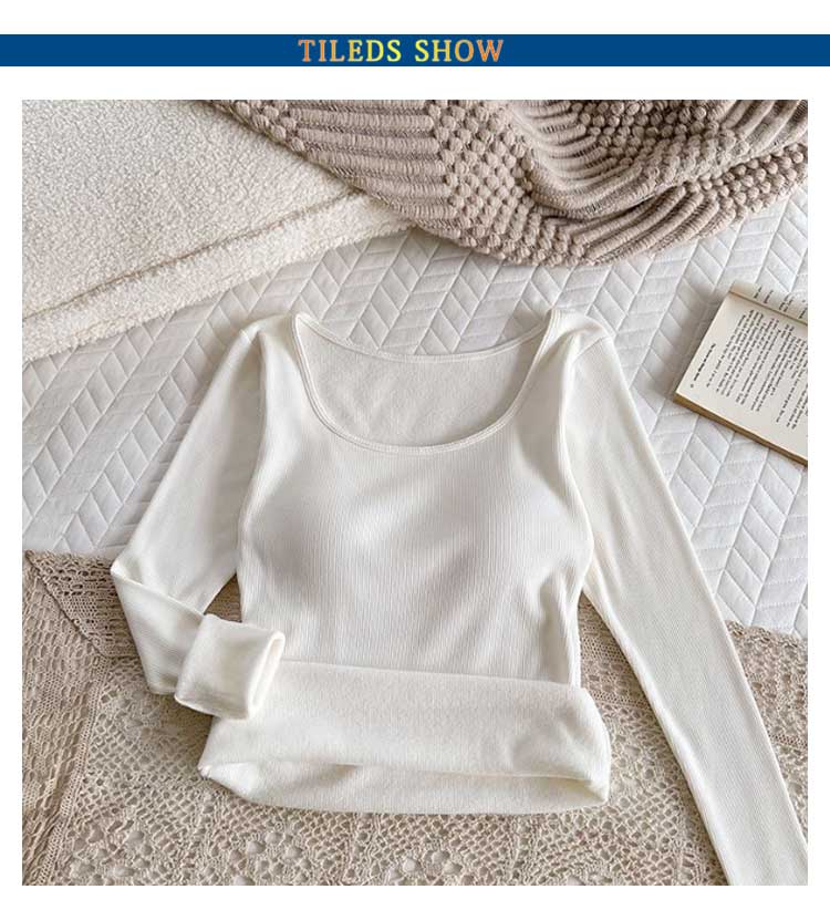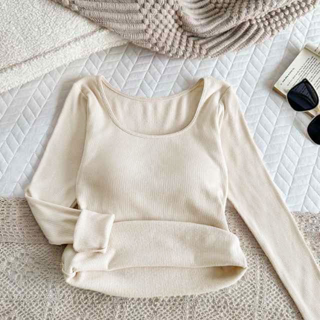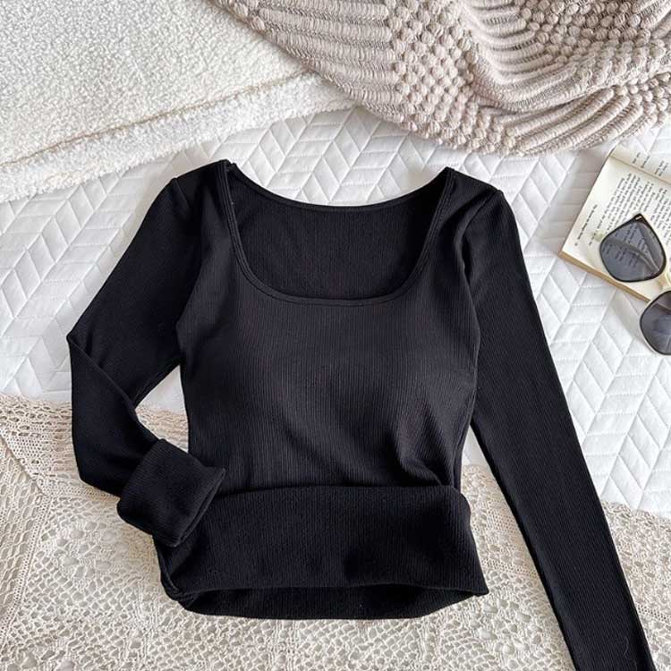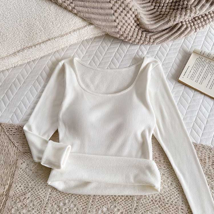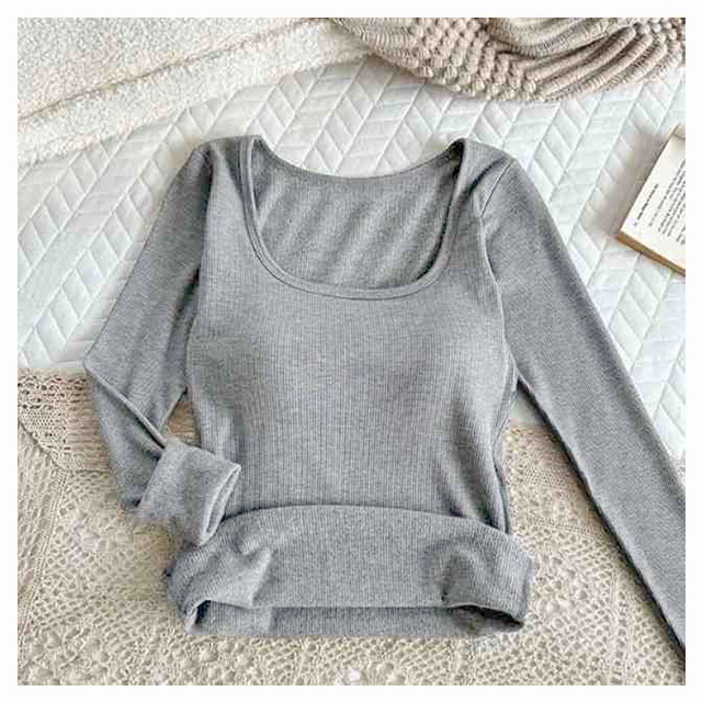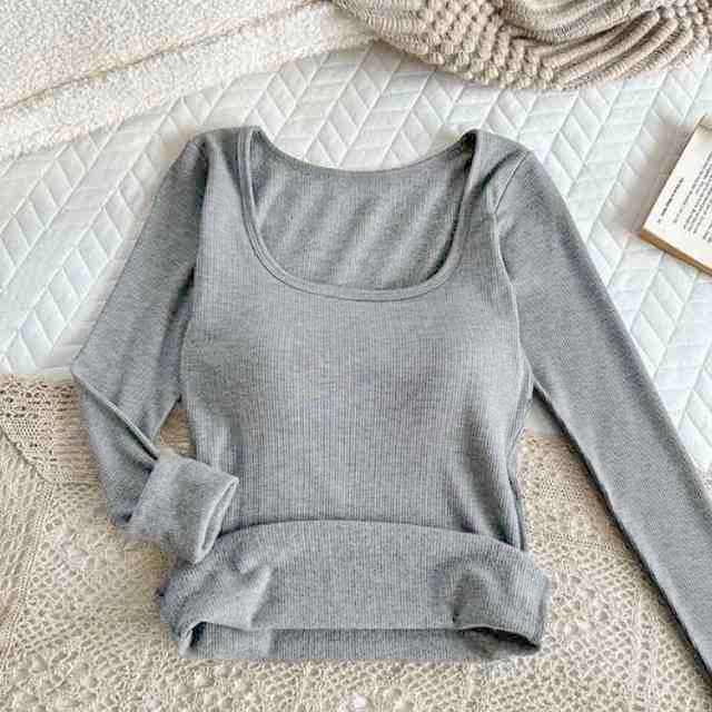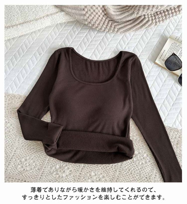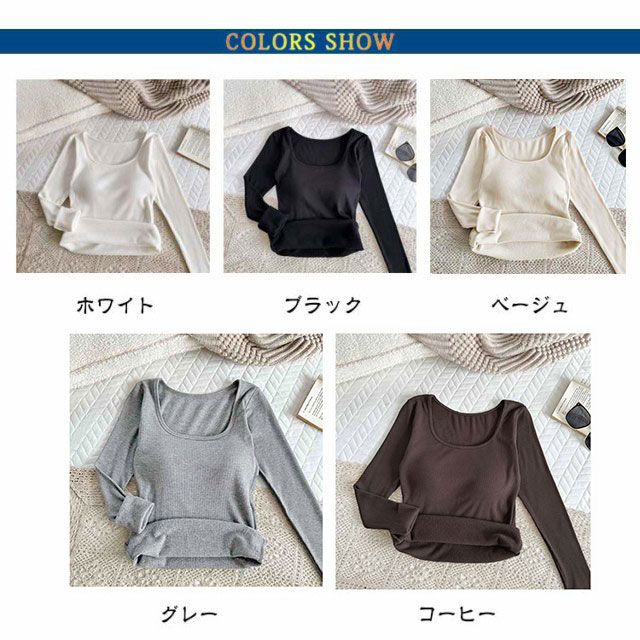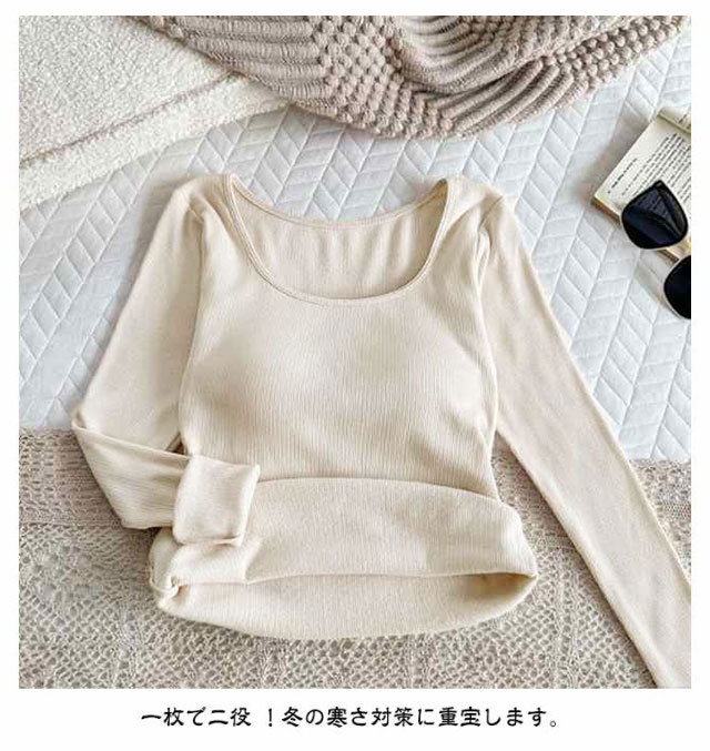 【カップ付き】リブ トップス レディース カットソー 長袖 ブラトップ 暖かい スクエアネック Tシャツ 秋冬 防寒 肌着 下着 婦人 女性 保温 ブラジャー ヒートテック あったか