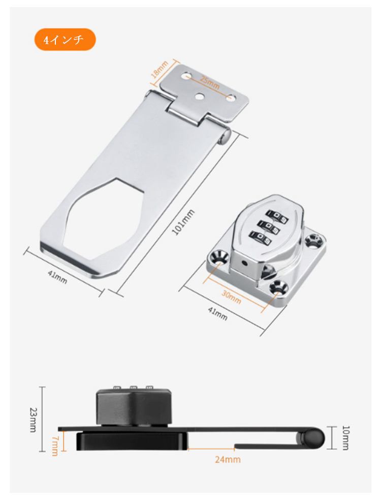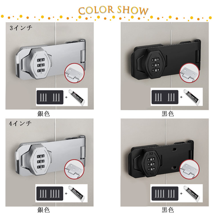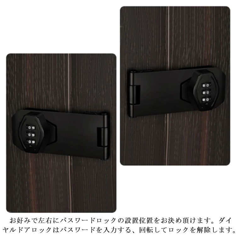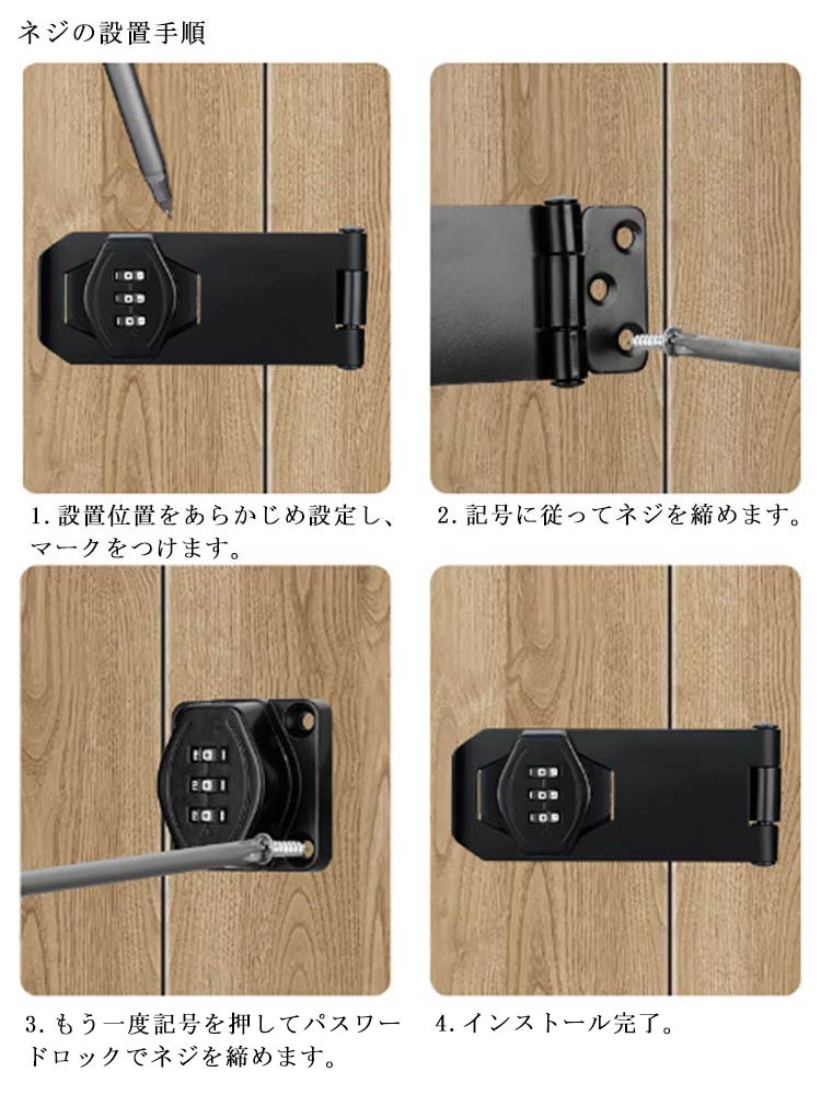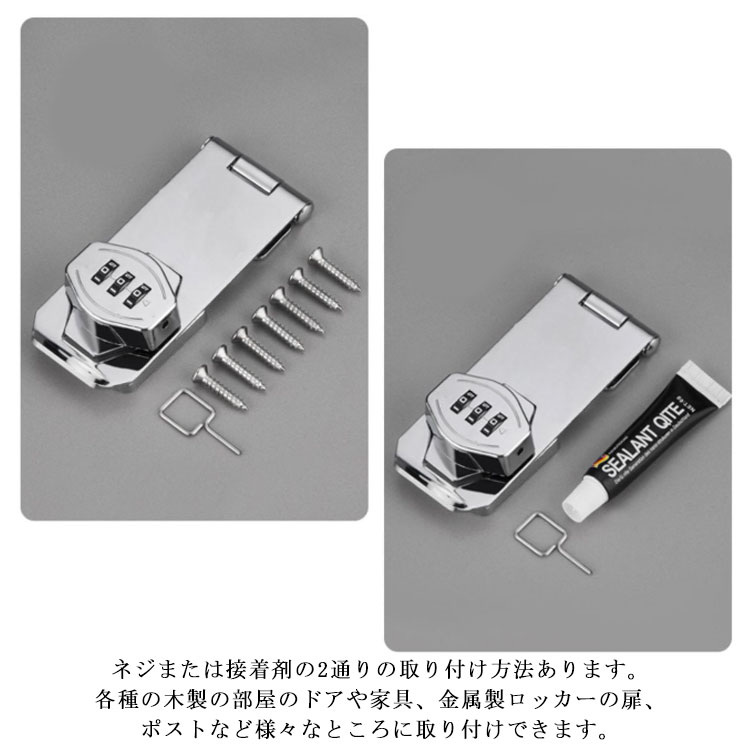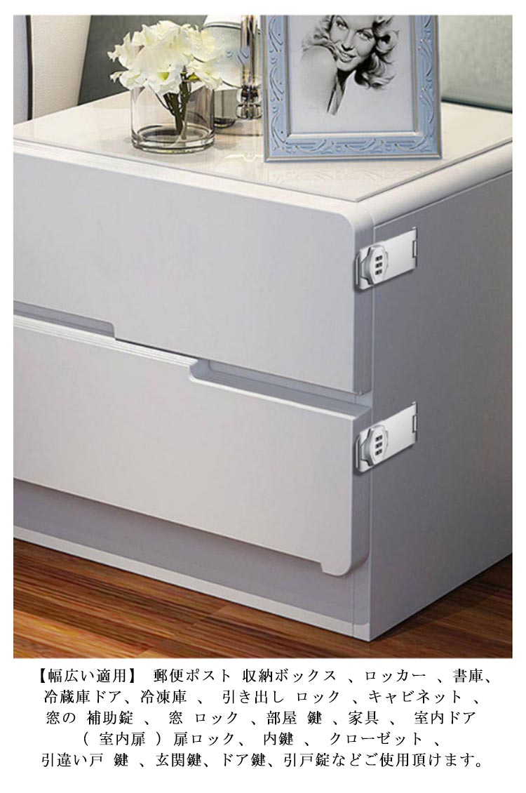 【鍵の持ち歩きの煩わしさから解放】この補助錠は3桁ダイヤル式でカギ不要、 キーの紛失心配もありません。 後付け鍵は取り付け簡単、キーレスセキュリティには大量の鍵の管理やロックの交換が含まれる事必要はないです。後付け 鍵 は指紋認証と違い、パスワード管理なのでいざという時に家族にもシェアできます。【高品質素材】後付け ドアロック は耐久性に優れた頑丈な亜鉛合金製で 防錆 仕様のメッキ表面。他のロックとは異なりコンビネーション ロック は高価なキットや交換用ディスクを必要としません、耐久性と防錆性に優れで室内や屋外湿った環境でも品質と寿命を長く持ちできるロックです。【使いやすい】お好みで左右にパスワードロックの設置位置をお決め頂けます。ダイヤルドアロックはパスワードを入力する、回転してロックを解除します。ネジまたは接着剤の2通りの取り付け方法あります。各種の木製の部屋のドアや家具、金属製ロッカーの扉、ポストなど様々なところに取り付けできます。【幅広い適用】 郵便ポスト 収納ボックス 、ロッカー 、書庫、冷蔵庫ドア、冷凍庫 、 引き出し ロック 、キャビネット 、窓の 補助錠 、 窓 ロック 、部屋 鍵 、家具 、 室内ドア ( 室内扉 ) 扉ロック、 内鍵 、 クローゼット 、 引違い戸 鍵 、玄関鍵、ドア鍵、引戸錠などご使用頂けます。