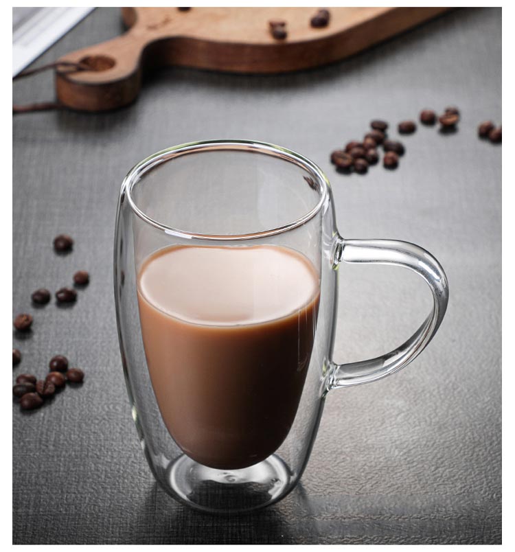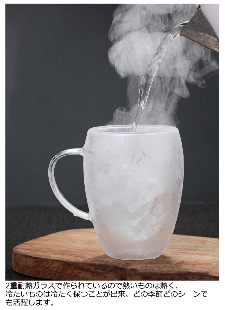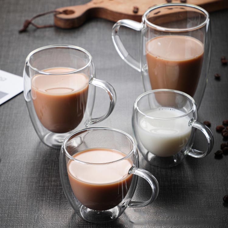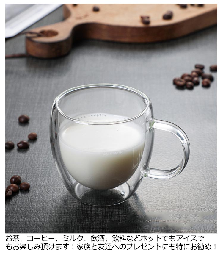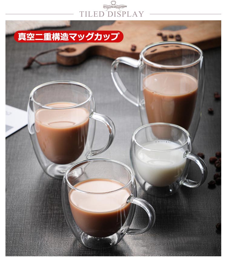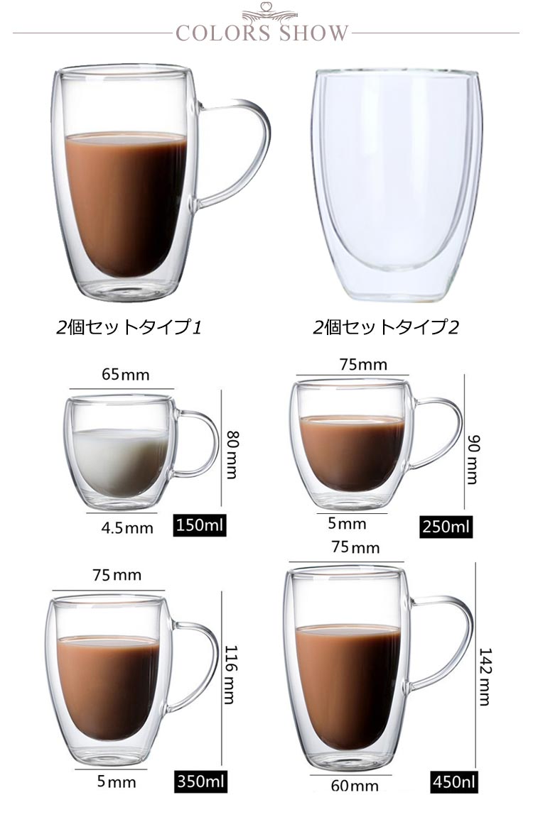 | 2個セット×2タイプ 80ml 150ml 250ml 350ml 450ml 真空二重構造マッグカップ 2重耐熱ガラスで作られているので熱いものは熱く、冷たいものは冷たく保つことが出来、どの季節どのシーンでも活躍します。 ハンドルつき、耐熱ガラス製マグのお洒落さはそのままに「持った時の熱さ」を解消しています。 お茶、コーヒー、ミルク、飲酒、飲料などホットでもアイスでもお楽しみ頂けます!家族と友達へのプレゼントにも特にお勧め! | |