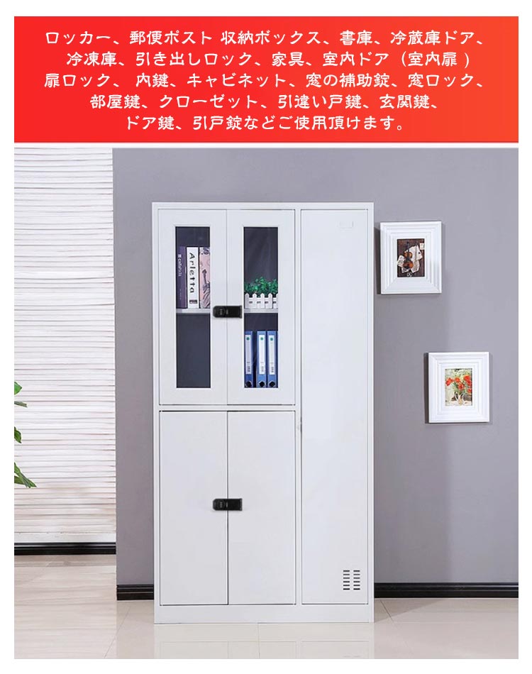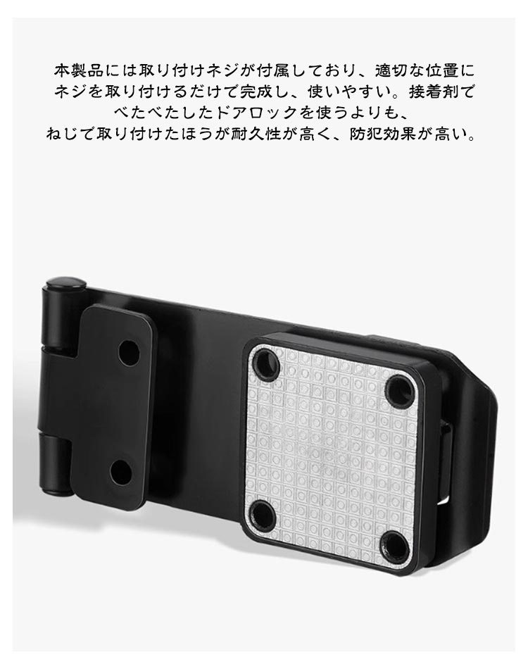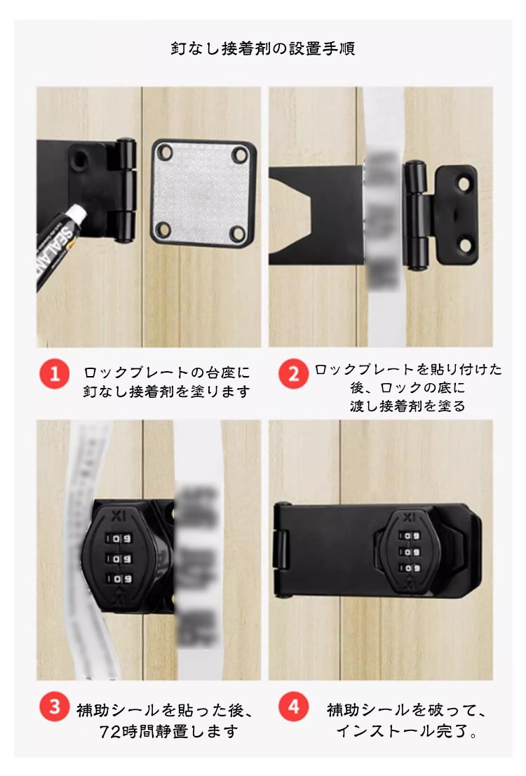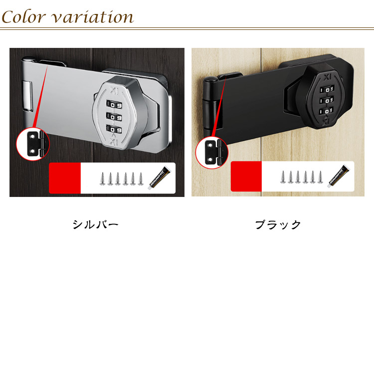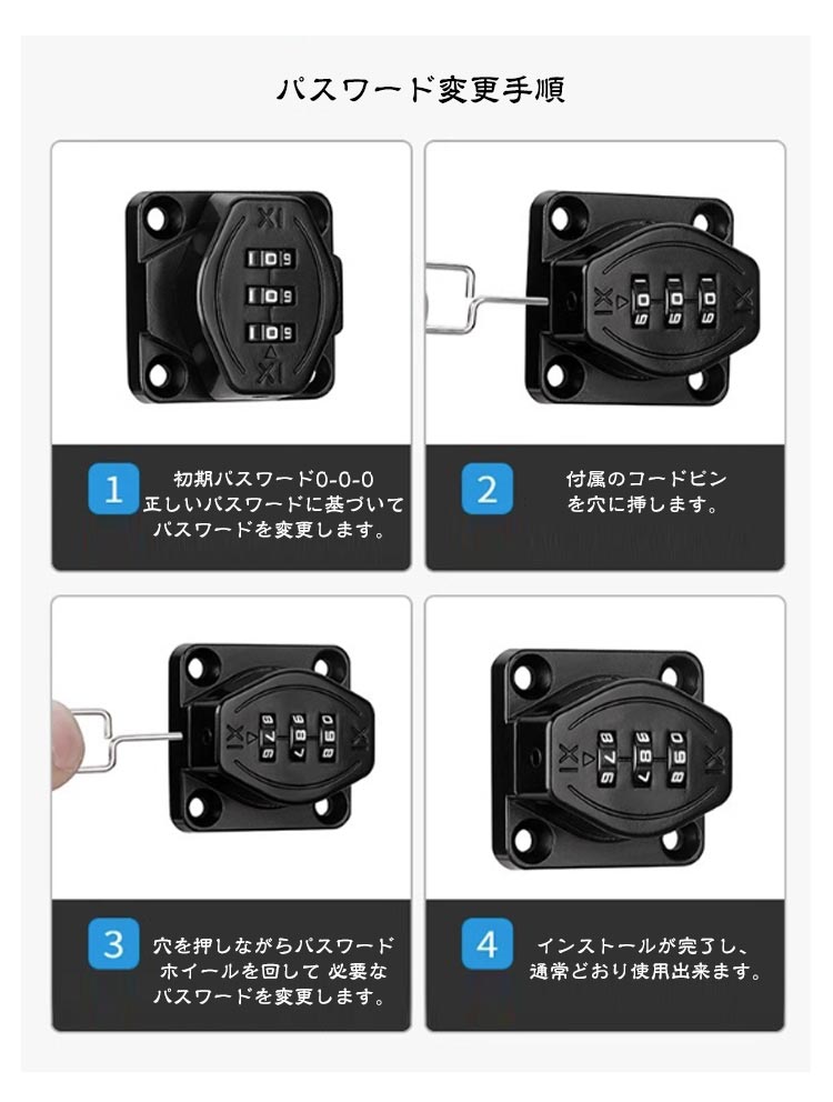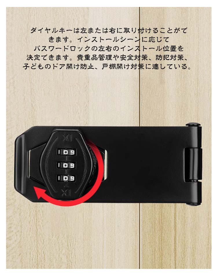 【高品質材質】丈夫で耐久性のある亜鉛合金で作られ、防錆仕様のめっき表面。耐久性と防錆性に優れ、室内や屋外の濡れた環境でも品質と寿命を長く保つことができる金属ロックです。【製品特徴】3ビットダイヤル式補助錠で、鍵を必要とせず、鍵の紛失を防止し、鍵を持ち歩いたり、鍵を紛失したりする悩みを解消します。ダイヤルのパスワードは可変で、初期パスワードは0-0-0で、ピンで穴に挿入すればパスワードを変更できます。【使いやすい】ダイヤルキーは左または右に取り付けることができます。インストールシーンに応じてパスワードロックの左右のインストール位置を決定できます。貴重品管理や安全対策、防犯対策、子どものドア開け防止、戸棚開け対策に適している。【取り付け簡単】本製品には取り付けネジが付属しており、適切な位置にネジを取り付けるだけで完成し、使いやすい。接着剤でべたべたしたドアロックを使うよりも、ねじで取り付けたほうが耐久性が高く、防犯効果が高い。【幅広い適用】ロッカー、郵便ポスト 収納ボックス、書庫、冷蔵庫ドア、冷凍庫、引き出しロック、家具、室内ドア(室内扉 ) 扉ロック、 内鍵、キャビネット、窓の補助錠、窓ロック、部屋鍵、クローゼット、引違い戸鍵、玄関鍵、ドア鍵、引戸錠などご使用頂けます。パスワード変更手順初期パスワード0-0-0正しいパスワードに基づいてパスワードを変更します。付属のコードピンを穴に挿します。穴を押しながらパスワードホイールを回して 必要なパスワードを変更します。インストールが完了し、 通常どおり使用出来ます。2つのインストール方法ネジの設置手順1、設置位置をあらかじめ設定し、マークを付けます2、記号に従ってネジを締めます3、もう一度記号を押してパスワードロックでネジを締めます4、インストール完了、正常使用釘なし接着剤の設置手順1、ロックプレートの台座に釘なし接着剤を塗ります2、ロックプレートを貼り付けた後、ロックの底に渡し接着剤を塗る3、補助シールを貼った後、72時間静置します4、補助シールを破って、インストール完了。