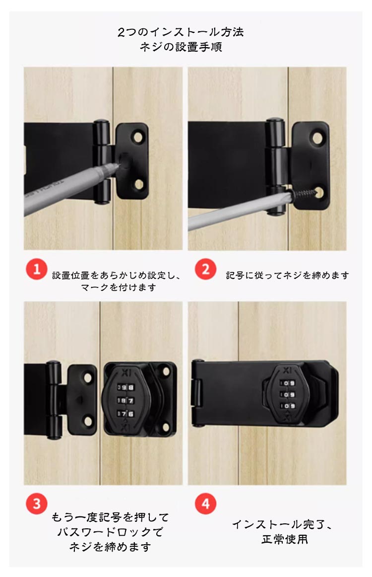 | 【高品質材質】丈夫で耐久性のある亜鉛合金で作られ、防錆仕様のめっき表面。耐久性と防錆性に優れ、室内や屋外の濡れた環境でも品質と寿命を長く保つことができる金属ロックです。 【製品特徴】3ビットダイヤル式補助錠で、鍵を必要とせず、鍵の紛失を防止し、鍵を持ち歩いたり、鍵を紛失したりする悩みを解消します。ダイヤルのパスワードは可変で、初期パスワードは0-0-0で、ピンで穴に挿入すればパスワードを変更できます。 【使いやすい】ダイヤルキーは左または右に取り付けることができます。インストールシーンに応じてパスワードロックの左右のインストール位置を決定できます。貴重品管理や安全対策、防犯対策、子どものドア開け防止、戸棚開け対策に適している。 【取り付け簡単】本製品には取り付けネジが付属しており、適切な位置にネジを取り付けるだけで完成し、使いやすい。接着剤でべたべたしたドアロックを使うよりも、ねじで取り付けたほうが耐久性が高く、防犯効果が高い。 【幅広い適用】ロッカー、郵便ポスト 収納ボックス、書庫、冷蔵庫ドア、冷凍庫、引き出しロック、家具、室内ドア(室内扉 ) 扉ロック、 内鍵、キャビネット、窓の補助錠、窓ロック、部屋鍵、クローゼット、引違い戸鍵、玄関鍵、ドア鍵、引戸錠などご使用頂けます。 パスワード変更手順 初期パスワード0-0-0正しいパスワードに基づいてパスワードを変更します。 付属のコードピンを穴に挿します。 穴を押しながらパスワードホイールを回して 必要なパスワードを変更します。 インストールが完了し、 通常どおり使用出来ます。 2つのインストール方法 ネジの設置手順 1、設置位置をあらかじめ設定し、マークを付けます 2、記号に従ってネジを締めます 3、もう一度記号を押してパスワードロックでネジを締めます 4、インストール完了、正常使用 釘なし接着剤の設置手順 1、ロックプレートの台座に釘なし接着剤を塗ります 2、ロックプレートを貼り付けた後、ロックの底に渡し接着剤を塗る 3、補助シールを貼った後、72時間静置します 4、補助シールを破って、インストール完了。 | |