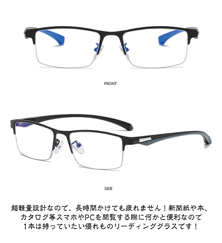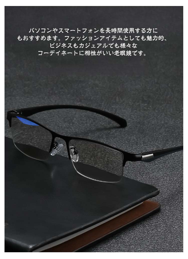 スマホ・パソコン用老眼鏡。変色機能搭載!サングラスとしても使える!ブルーライトカット!パソコンやスマートフォンを長時間使用する方にもおすすめます。ファッションアイテムとしても魅力的、ビジネスもカジュアルでも様々なコーデイネートに相性がいい老眼鏡です。遠近両用!パソコン・スマホなどのブルーライトにも ブルーライトが強く放射されています。ブルーライトを抑えることで、まぶしさ・ちらつきを軽減することが可能となります。サングラス老眼鏡+ブルーライトカット。これひとつにまとめてご使用いただけます。自然に変色可能!室内では太陽光があまりないのでほぼ透明のカラーが保てます。(室外)アウトドアの場合は太陽光が強い からレンズが灰色へ変色します。紫外線の強さにより色が違っています。人間工学に基づいたデザイン、 快適なメガネフレーム、レンズの光透過率は非常に良いです。超軽量設計なので、長時間かけても疲れません!新聞紙や本、カタログ等スマホやPCを閲覧する際に何かと便利なので1本は持っていたい優れものリーディンググラスです!父親・母親・祖父・祖母に最適のプレゼントを贈ります!