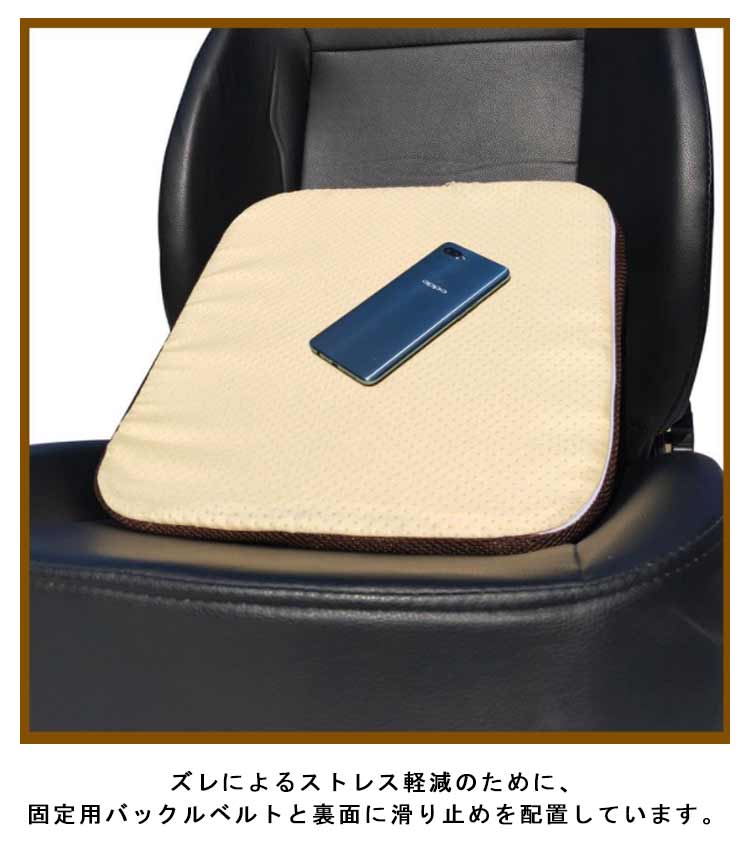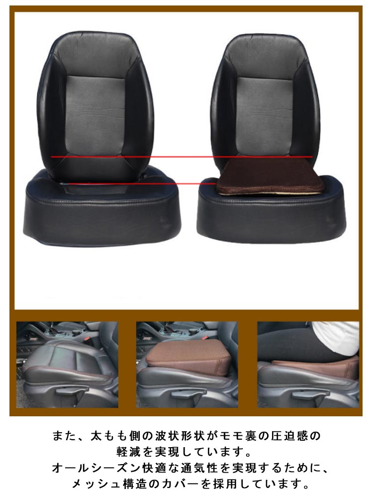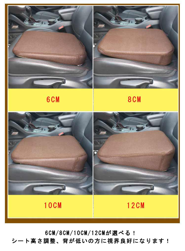 6cm/8cm/10cm/12cmが選べる!シート高さ調整、背が低いの方に視界良好になります!車専用に設計された傾斜形状が、正しい運転姿勢に導き、運転疲れをサポートします。また、太もも側の波状形状がモモ裏の圧迫感の軽減を実現しています。ズレによるストレス軽減のために、固定用バックルベルトと裏面に滑り止めを配置しています。オールシーズン快適な通気性を実現するために、メッシュ構造のカバーを採用しています。