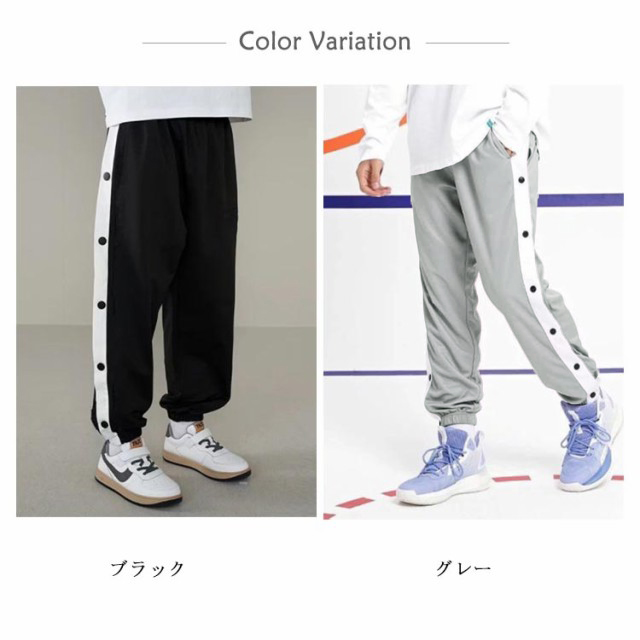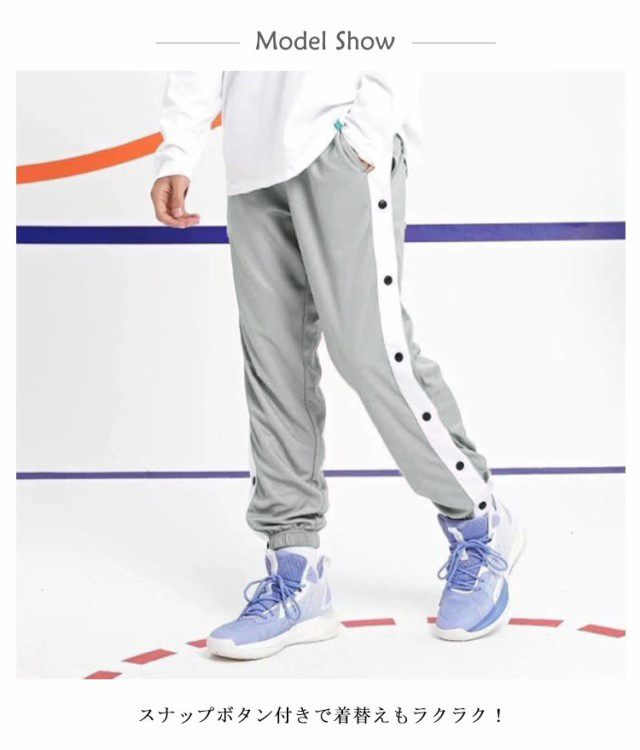 110cm~170cm!サイドのラインがポイントのバスケットパンツ。スナップボタン付きで着替えもラクラク!柔らかく、通気性も良いスウェット素材を使用。一日中快適に着用できます。ゆったりとしたシルエットとウエストのゴムがリラックスした履き心地。バスケットボール・ミニバスケットボールの練習着から、ジムやトレーニングウエアとしても使えます。休日のカジュアルスタイルにも大活躍してくれます。