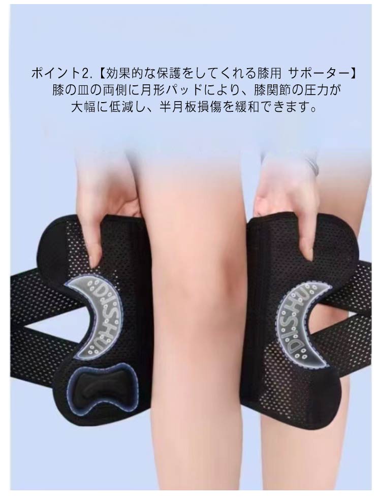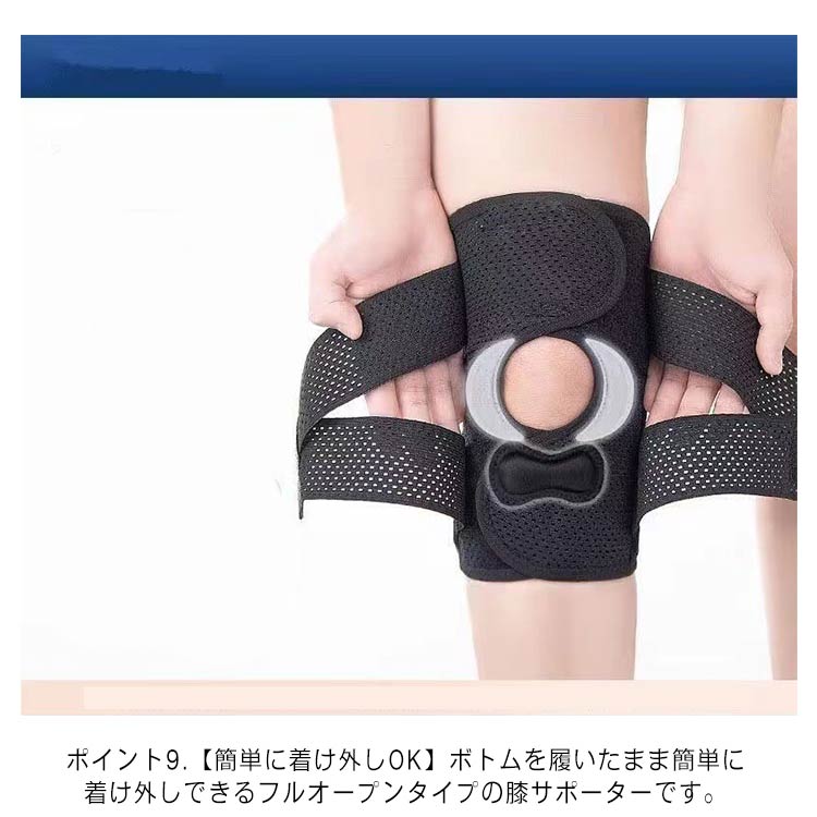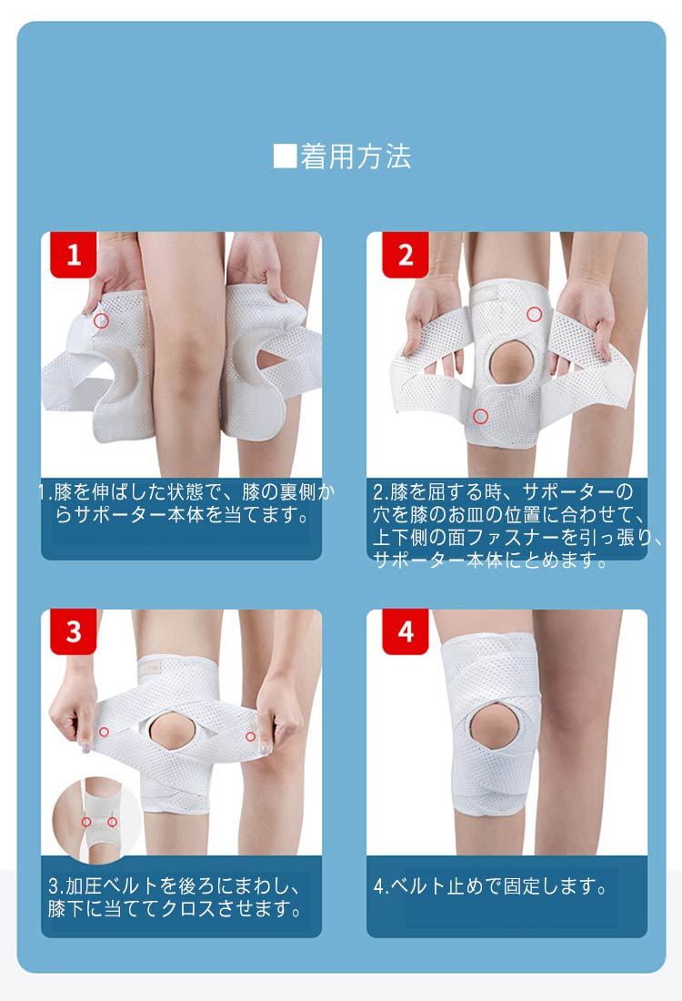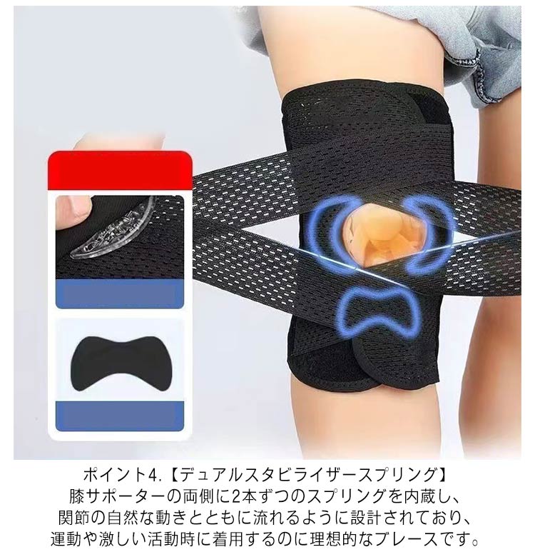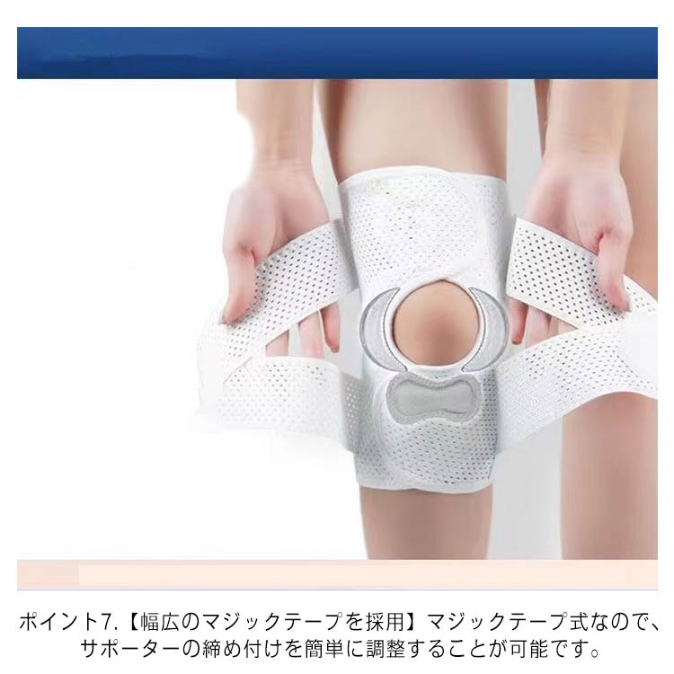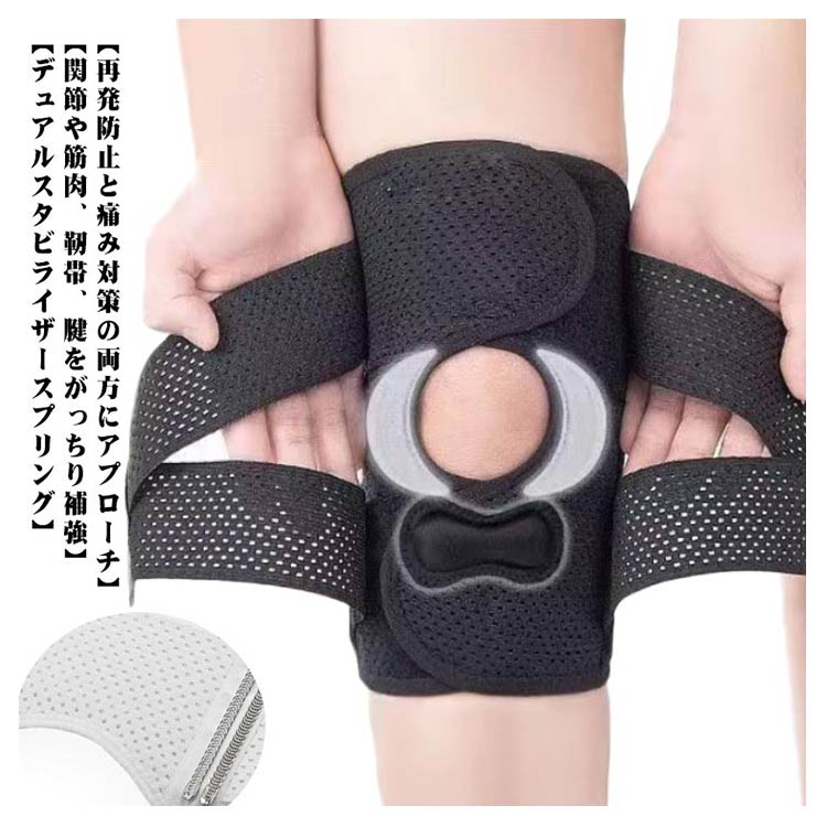 ポイント1.【再発防止と痛み対策の両方にアプローチ】傷ついた筋肉、靭帯、腱にテーピングやサポーターを用いることで、その部位の補強ができ、怪我の再発防止や悪化防止につながります。ポイント2.【効果的な保護をしてくれる膝用 サポーター】膝の皿の両側に月形パッドにより、膝関節の圧力が大幅に低減し、半月板損傷を緩和できます。ポイント3.【関節や筋肉、靭帯、腱をがっちり補強】膝に巻くV型マジックテープを2本追加し、膝の上下に交差して、膝蓋骨の安定に役立ちます。左右のぐらつきも防止しながら、今までにない最高のホールド感を体験できる膝サポーター。ポイント4.【デュアルスタビライザースプリング】膝サポーターの両側に2本ずつのスプリングを内蔵し、関節の自然な動きとともに流れるように設計されており、運動や激しい活動時に着用するのに理想的なブレースです。ポイント5.【人間工学的なひざ用サポーター】曲げ伸ばしの多い膝頭や裏側は、食い込みを防いでカーブカット構造になっています。メッシュ生地採用ですので、ムレにくいのもポイントです。ポイント6.【フロントオープンのデザイン】膝蓋骨のカーブに360°完全にフィットし、損傷の回復とスポーツによる怪我に。ポイント7.【幅広のマジックテープを採用】マジックテープ式なので、サポーターの締め付けを簡単に調整することが可能です。ポイント8.【いつでも快適な着用感】このひざサポーターは通気性、吸汗速乾性に優れ、汗をかいてもサラッと快適です。ポイント9.【簡単に着け外しOK】ボトムを履いたまま簡単に着け外しできるフルオープンタイプの膝サポーターです。ポイント10.【様々なシーンに最適】ランニング、ジョギング、ジム、ウェイトリフティング、バスケットボールなど、数多くのスポーツで幅広く使用されている膝用サポーターです。また、手術後の回復のために運動する方や、長時間立ったり歩いたりする方にもお勧めです。日常生活で使用すると、24時間一日中サポートが受けられます。サイズの選び方普通に立った状態でメジャーでヒザのお皿の中心から、10cm上の太ももの太さに合わせ計測■着用方法1.膝を伸ばした状態で、膝の裏側からサポーター本体を当てます。2.膝を屈する時、サポーターの穴を膝のお皿の位置に合わせて、上下側の面フ