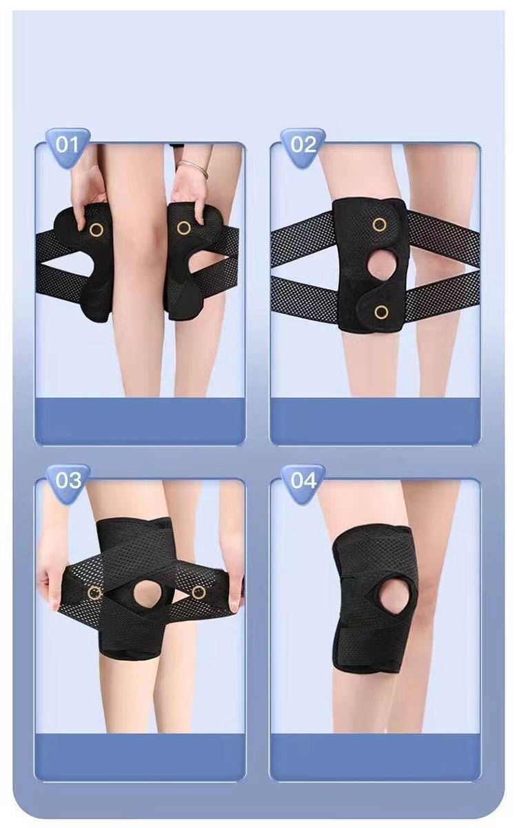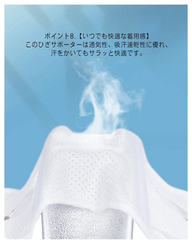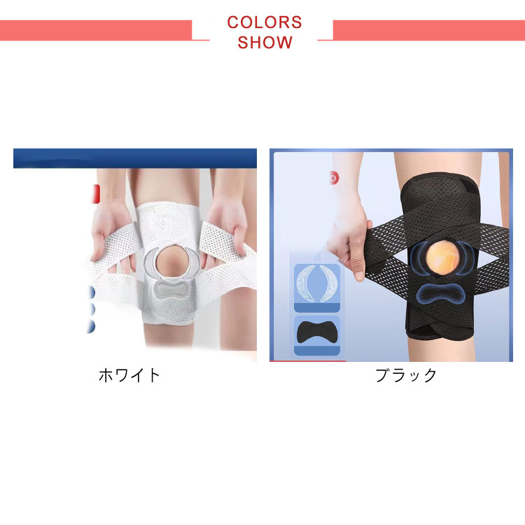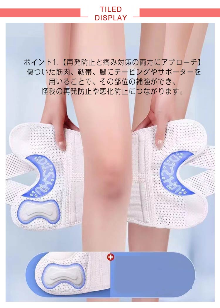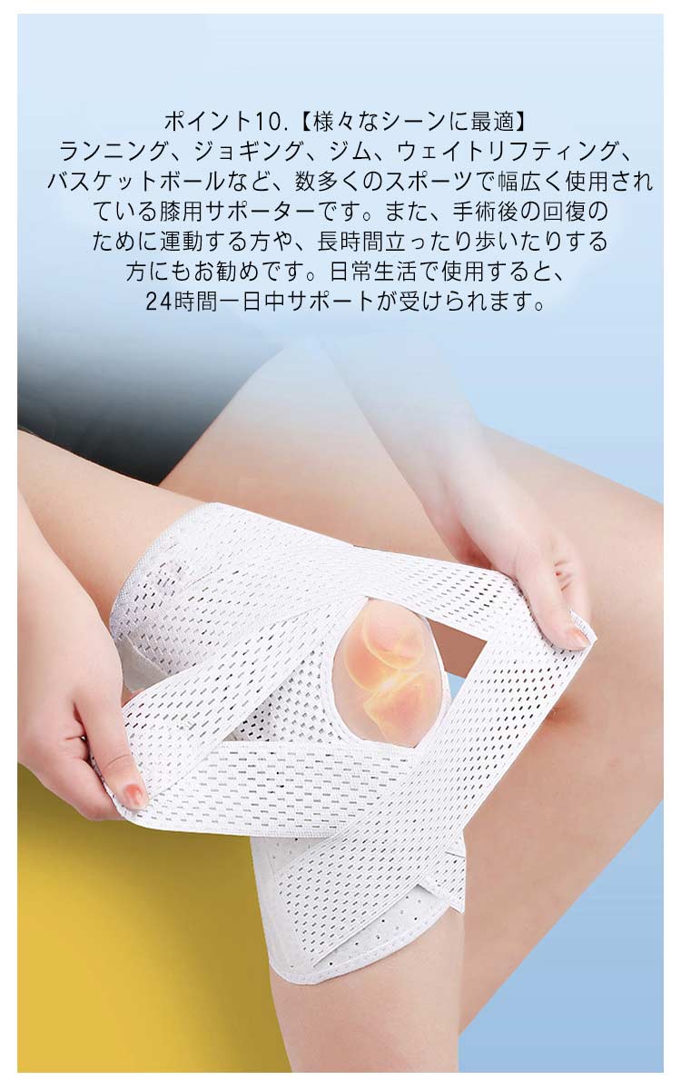 ポイント1.【再発防止と痛み対策の両方にアプローチ】傷ついた筋肉、靭帯、腱にテーピングやサポーターを用いることで、その部位の補強ができ、怪我の再発防止や悪化防止につながります。ポイント2.【効果的な保護をしてくれる膝用 サポーター】膝の皿の両側に月形パッドにより、膝関節の圧力が大幅に低減し、半月板損傷を緩和できます。ポイント3.【関節や筋肉、靭帯、腱をがっちり補強】膝に巻くV型マジックテープを2本追加し、膝の上下に交差して、膝蓋骨の安定に役立ちます。左右のぐらつきも防止しながら、今までにない最高のホールド感を体験できる膝サポーター。ポイント4.【デュアルスタビライザースプリング】膝サポーターの両側に2本ずつのスプリングを内蔵し、関節の自然な動きとともに流れるように設計されており、運動や激しい活動時に着用するのに理想的なブレースです。ポイント5.【人間工学的なひざ用サポーター】曲げ伸ばしの多い膝頭や裏側は、食い込みを防いでカーブカット構造になっています。メッシュ生地採用ですので、ムレにくいのもポイントです。ポイント6.【フロントオープンのデザイン】膝蓋骨のカーブに360°完全にフィットし、損傷の回復とスポーツによる怪我に。ポイント7.【幅広のマジックテープを採用】マジックテープ式なので、サポーターの締め付けを簡単に調整することが可能です。ポイント8.【いつでも快適な着用感】このひざサポーターは通気性、吸汗速乾性に優れ、汗をかいてもサラッと快適です。ポイント9.【簡単に着け外しOK】ボトムを履いたまま簡単に着け外しできるフルオープンタイプの膝サポーターです。ポイント10.【様々なシーンに最適】ランニング、ジョギング、ジム、ウェイトリフティング、バスケットボールなど、数多くのスポーツで幅広く使用されている膝用サポーターです。また、手術後の回復のために運動する方や、長時間立ったり歩いたりする方にもお勧めです。日常生活で使用すると、24時間一日中サポートが受けられます。サイズの選び方普通に立った状態でメジャーでヒザのお皿の中心から、10cm上の太ももの太さに合わせ計測■着用方法1.膝を伸ばした状態で、膝の裏側からサポーター本体を当てます。2.膝を屈する時、サポーターの穴を膝のお皿の位置に合わせて、上下側の面フ