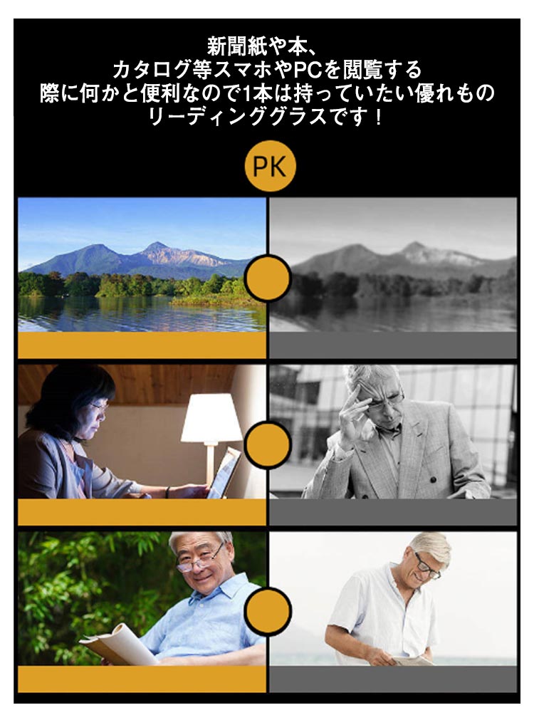 | おしゃれな!目に優しいブルーライトカットを採用。パソコンやスマートフォンを長時間使用するにも最適。 度数:1.00 、1.50 、2.00 、2.50 、3.00 、3.50 、4.00をご用意しております。 ピントグラスとは、独自設計の累進多焦点レンズを搭載する(老眼鏡)です。レンズの中心からやや下部、主に手元を見る時の視点の位置に最も度数の強いレンズを配置し、外側に向かい同心円状に度数が滑らかに減少していく累進設計を採用。自然な焦点(ピント)移動を可能にしました。さらに複数の度数を持った多焦点レンズを採用することにより、このピントグラスひとつで幅広い老眼の方にクリアな視界と広い視野を提供してくれる優れものの 超軽量設計なので、長時間かけても疲れません!新聞紙や本、カタログ等スマホやPCを閲覧する際に何かと便利なので1本は持っていたい優れものリーディンググラスです! | |