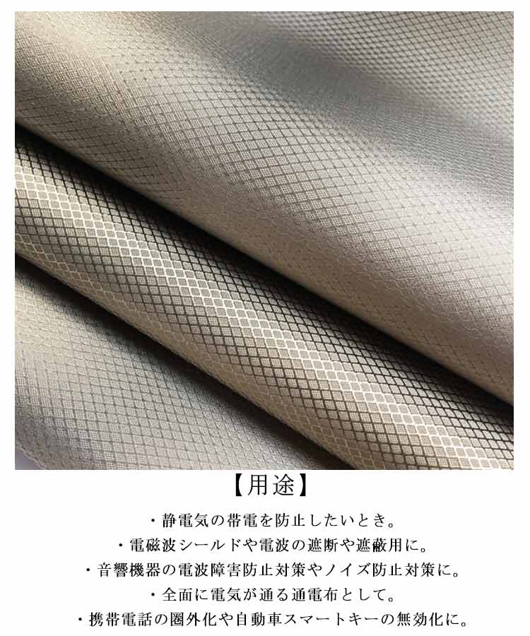 ・電磁波シールド生地 ・ターゲットを包むだけで簡単に遮蔽することができます。 ・柔軟性に富み、布と同様にご使用可能です。 ・包む・被せる・覆うなど自由にご使用いただけます。 【用途】・静電気の帯電を防止したいとき。・電磁波シールドや電波の遮断や遮蔽用に。・音響機器の電波障害防止対策やノイズ防止対策に。・全面に電気が通る通電布として。・携帯電話の圏外化や自動車スマートキーの無効化に。