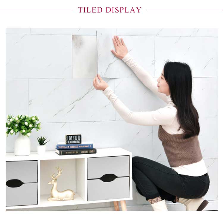 | ?シールを剥がして貼るだけのタイルシート ?キッチンや洗面所、食器棚、カウンターなどに貼ってもおしゃれ。 ?貼るだけ簡単、美しい仕上がりになります。 ?強粘着タイプのリメイクシート ?ホテルライクなきれいめ大理石、マーブルデザイン。 ?本物のタイルのような立体感をプリントで表現しました。(※シート自体はフラットで立体感はありません。) ?お部屋、玄関、台所、床のリフォームや模様替えに! ?水に強いPVC素材で、キッチン?洗面所?トイレはもちろん、土足OKなので、玄関にも使えます。 ?キズを隠すための補修としてもお使いいただけます。 【使用できる場所 】フラット面(凹凸の少ない壁紙、コンクリート面、表面処理のある木部、鉄部、鏡、ガラス)、水回り(水が時々かかる程度の場所、洗面所?トイレ?キッチンなど) | |
