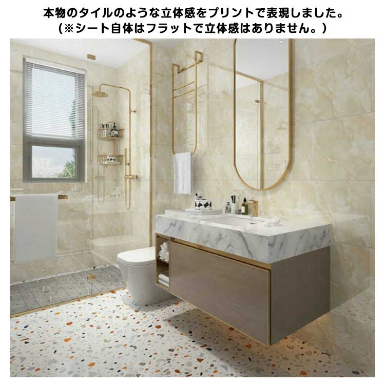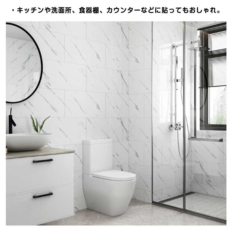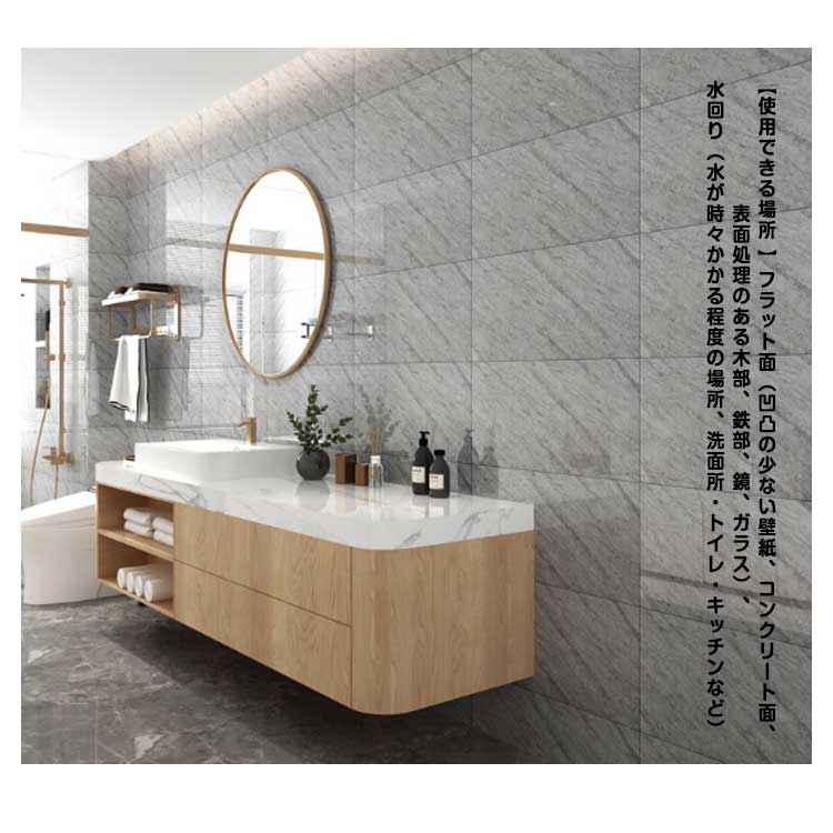 ・シールを剥がして貼るだけのタイルシート・キッチンや洗面所、食器棚、カウンターなどに貼ってもおしゃれ。・貼るだけ簡単、美しい仕上がりになります。・強粘着タイプのリメイクシート・ホテルライクなきれいめ大理石、マーブルデザイン。・本物のタイルのような立体感をプリントで表現しました。(※シート自体はフラットで立体感はありません。)・お部屋、玄関、台所、床のリフォームや模様替えに!・水に強いPVC素材で、キッチン・洗面所・トイレはもちろん、土足OKなので、玄関にも使えます。・キズを隠すための補修としてもお使いいただけます。【使用できる場所 】フラット面(凹凸の少ない壁紙、コンクリート面、表面処理のある木部、鉄部、鏡、ガラス)、水回り(水が時々かかる程度の場所、洗面所・トイレ・キッチンなど)