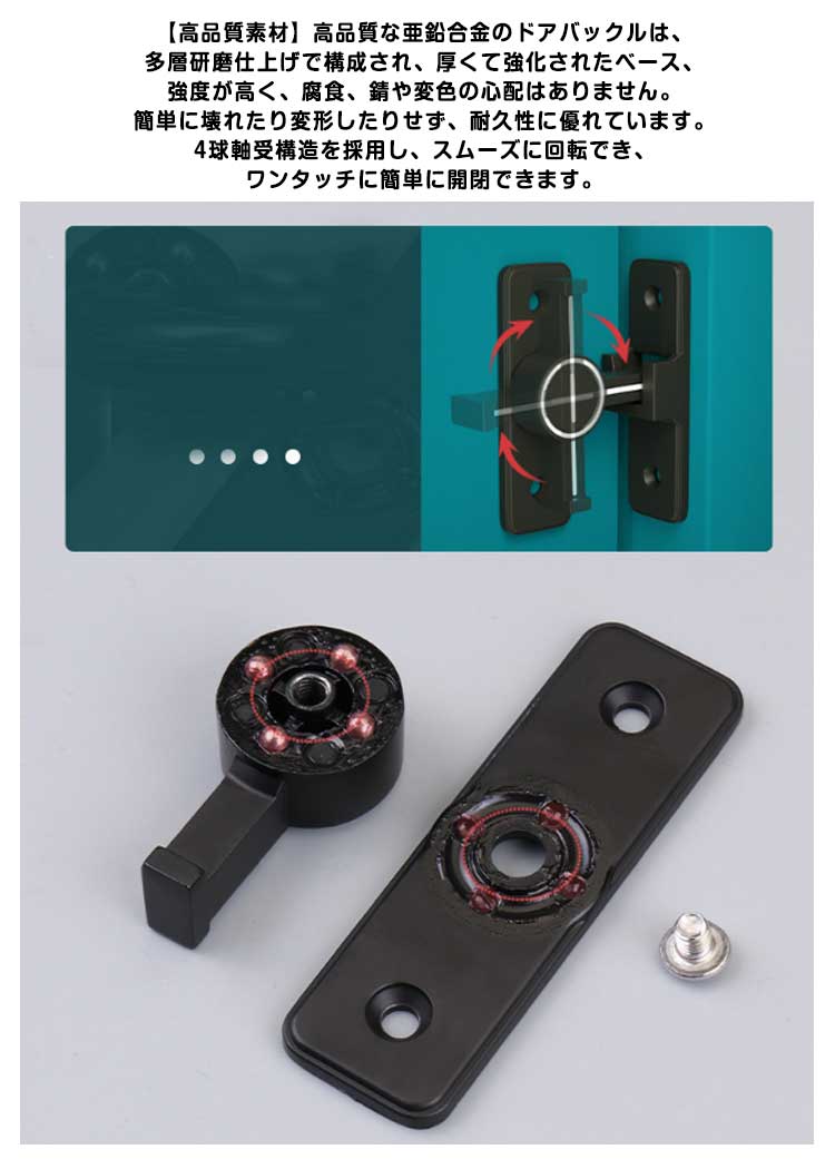 【高品質素材】高品質な亜鉛合金のドアバックルは、多層研磨仕上げで構成され、厚くて強化されたベース、強度が高く、腐食、錆や変色の心配はありません。簡単に壊れたり変形したりせず、耐久性に優れています。4球軸受構造を採用し、スムーズに回転でき、ワンタッチに簡単に開閉できます。【便利でシンプル】便利なフリップデザイン、プライバシーロック、フラップは、より快適な生活環境のためにさらなるセキュリティを提供します。【取付けも簡単】取り付け用のネジが付属しているため、留め具をすぐに設置する事ができます。左または右にインストールすることを選択できます。特殊タイプで90度の角度で取り付けられるため、ドアや窓の安全を確保するために使用できます。【安全保護】子供ケガ防止だけでなく、部屋の外に出ていかないようにしたり、様々な危険を防止できます。簡単施錠でスライドドアの防犯対策ができます。猫の脱走防止用としてもお使いいただけます。※接着剤と固定シール付いておりません。ネジの設置手順1.設置位置をあらかじめ設定し、 マークを付けます。2.記号に従ってネジを締めます。3.距離を左右に調整し、 写真のように端に寄せます。4.位置を繰り返し調整します。5.同じように穴の位置を合わせ、 ネジを締めて固定します。6.使用しないときは、写真のように垂直に吊るしてください。釘なし接着剤の設置手順:1.設置位置をあらかじめ設定し、 マークを付けます。2.台座に釘なし接着剤を塗ります。3.留め具をしぼって接着し、 脱落防止の補助シールを 貼ります。4.位置を繰り返し調整します。5.同様に接着剤を塗ります。 (ネジは塗布しない)6.補助シールを貼った後、 72時間静置します。 (冬はもっと長い)