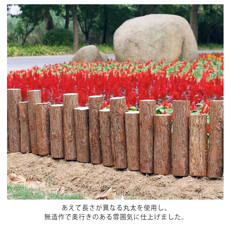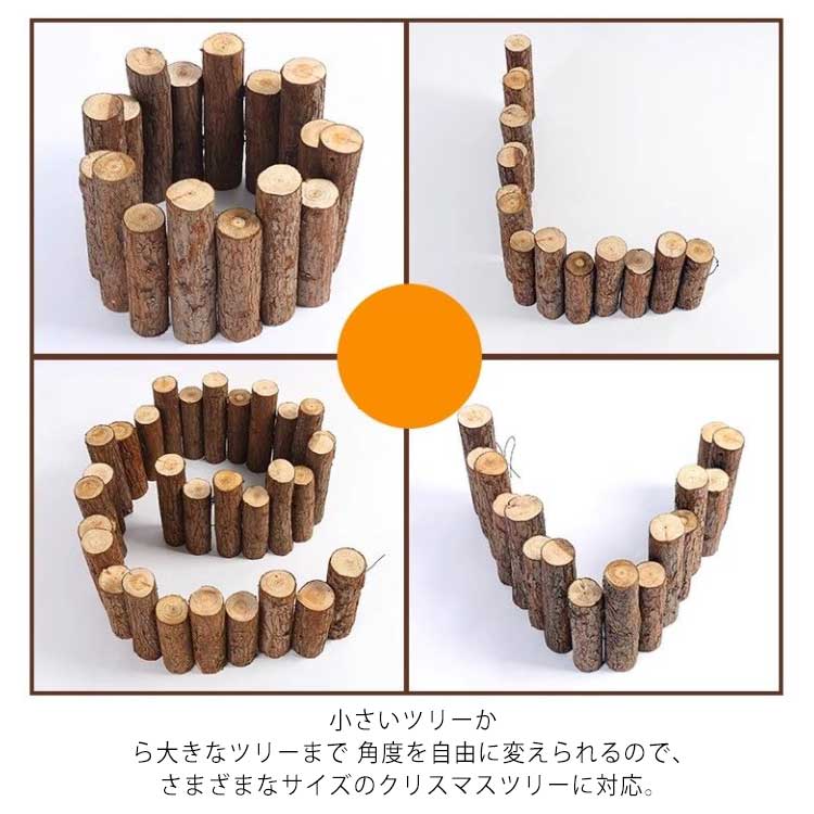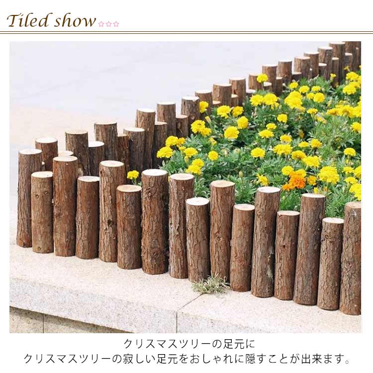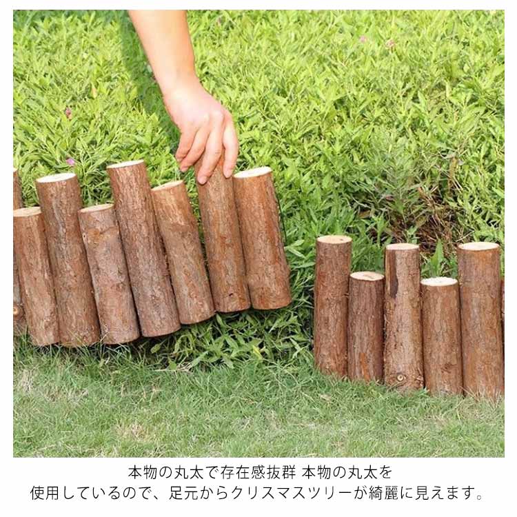 クリスマスツリーの足隠しに。足元をカバーするフェンス。皮付きの天然木を使ったタイプです。クリスマスツリーの足元にクリスマスツリーの寂しい足元をおしゃれに隠すことが出来ます。本物の丸太で存在感抜群 本物の丸太を使用しているので、足元からクリスマスツリーが綺麗に見えます。ウッドフェンスひとつで、簡単に北欧風ツリーの雰囲気が味わえます。あえて長さが異なる丸太を使用し、無造作で奥行きのある雰囲気に仕上げました。小さいツリーから大きなツリーまで 角度を自由に変えられるので、さまざまなサイズのクリスマスツリーに対応。
