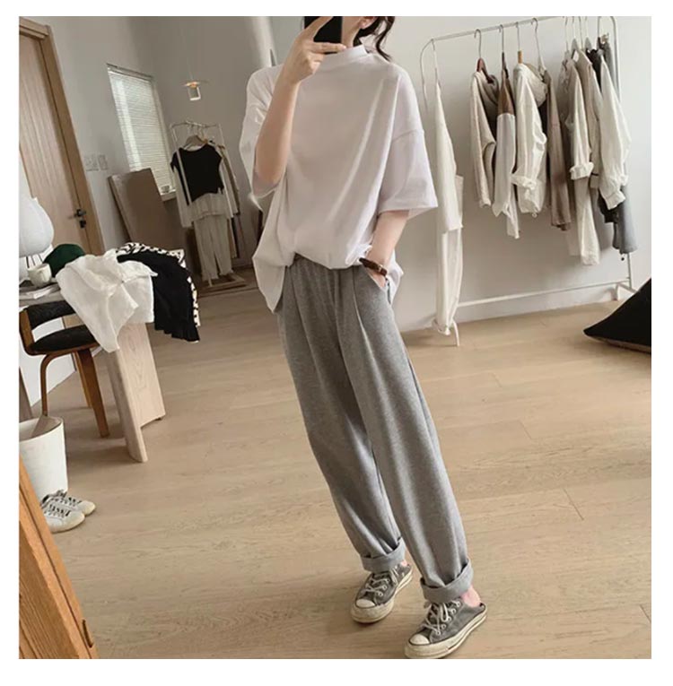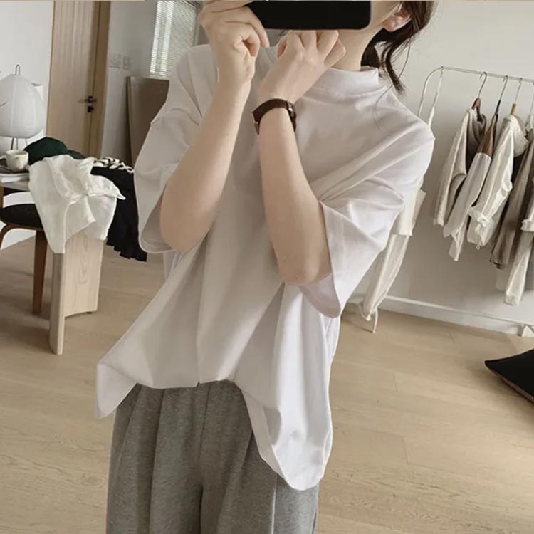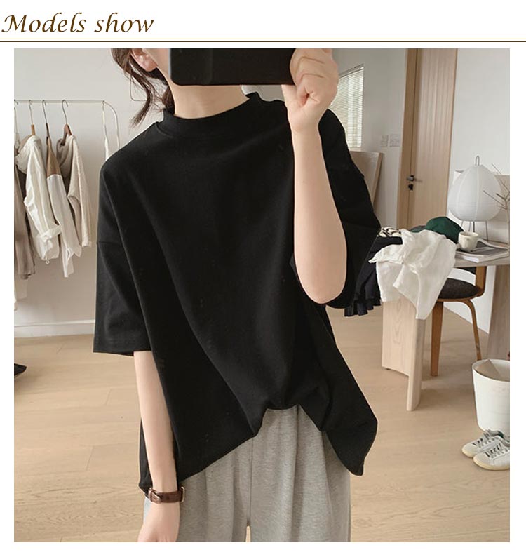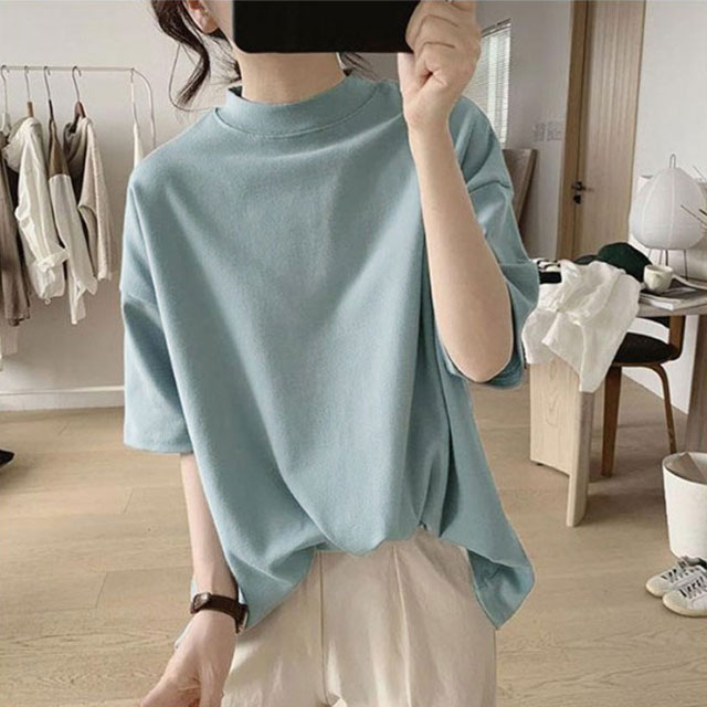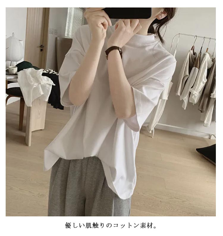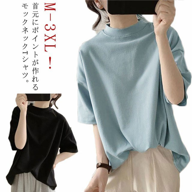 M-3XL!首元にポイントが作れるモックネックTシャツ。首を隠しすぎないプチハイネックで夏もすっきりと着られます。シンプルなデザインながら大人な雰囲気をプラスしてくれる一枚。優しい肌触りのコットン素材。程よいゆとり感で気になる身体のラインはカバーしつつ、リラクシーな着心地◎おうち時間のルームウェアにもぴったりです。インでもアウトでもバランスの良い着丈感で着こなしの幅も広がります。