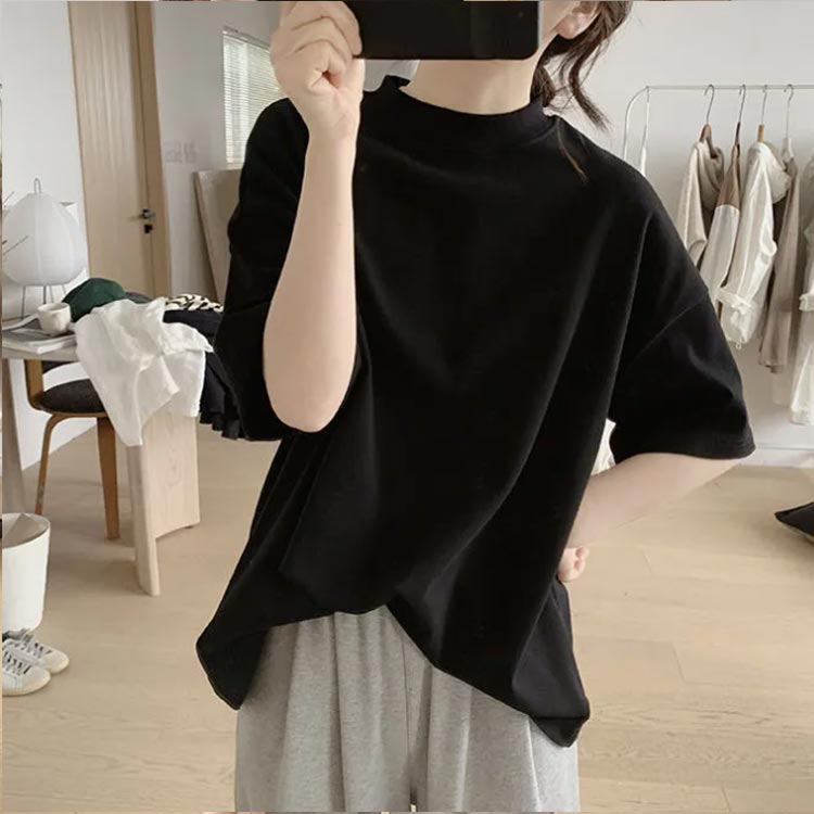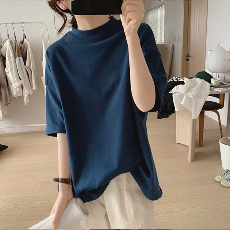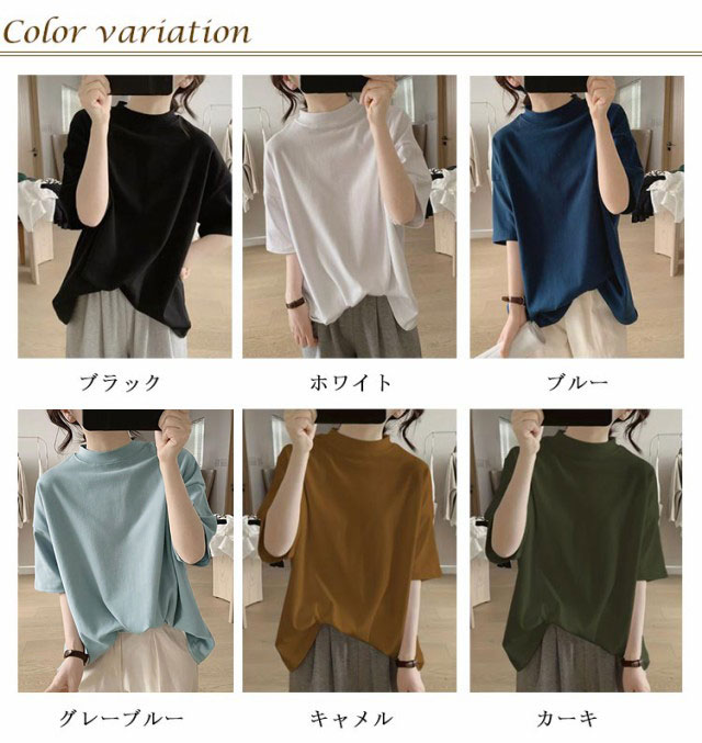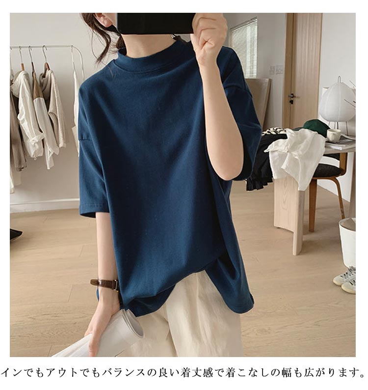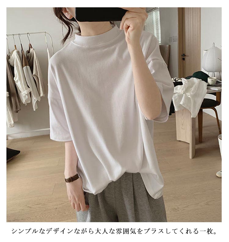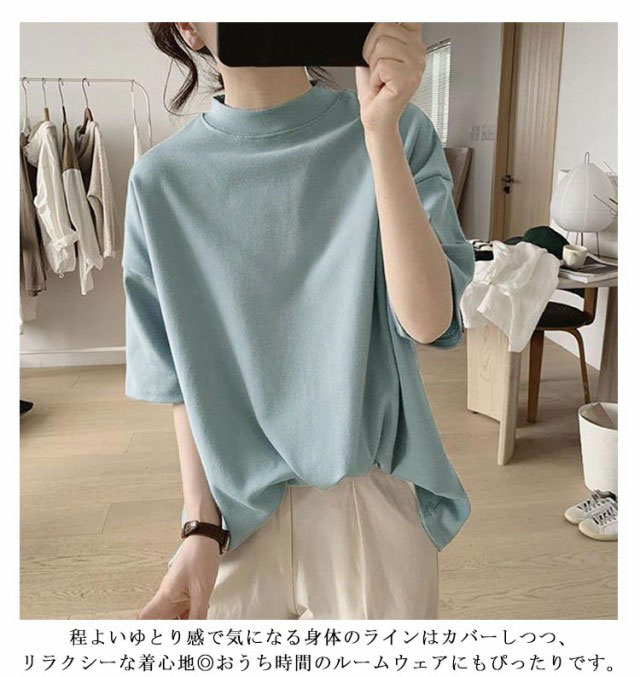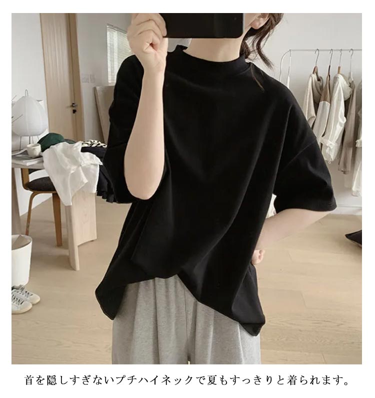 ハイネック 5分袖 レディース カットソー Tシャツ プチハイネック 半袖 tシャツ カットソー ドロップショルダー トップス 綿 夏 モックネック ゆったり 体型カバー 着瘦せ 大きいサイズ 無地 シンプル 通勤 薄手 大人 女性 送料無料