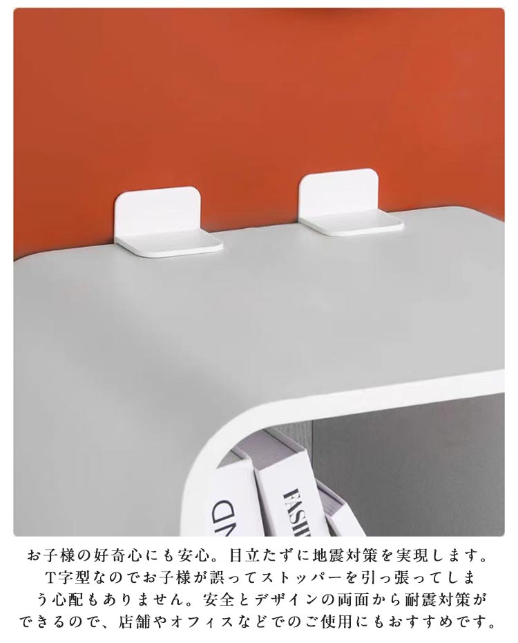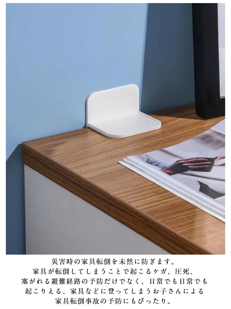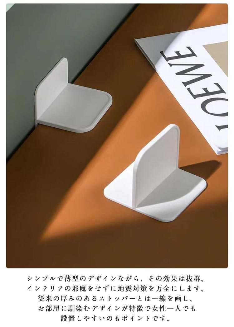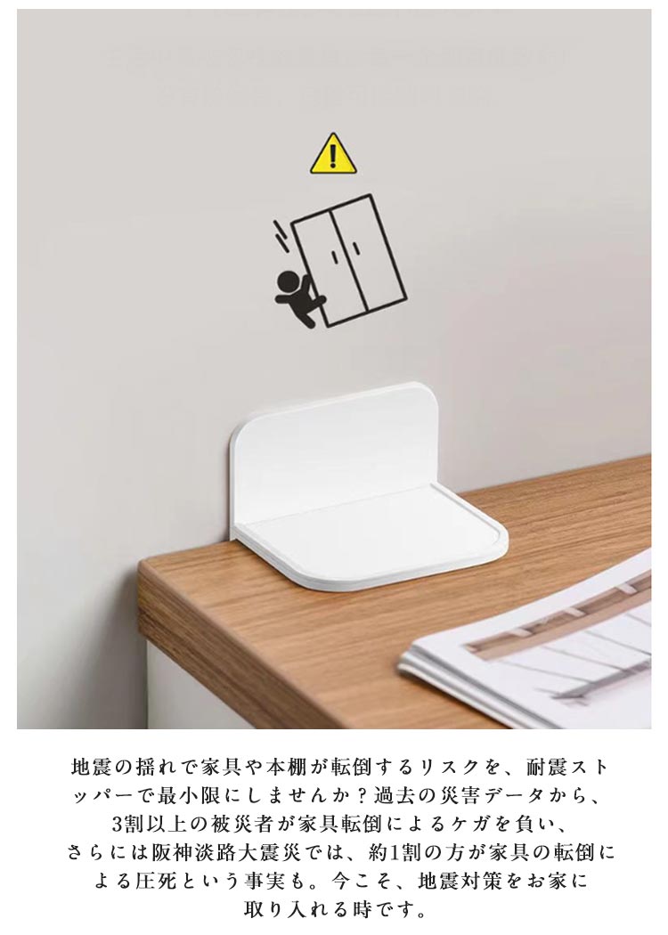 地震対策の家具ストッパーで、安心の暮らしを。地震の揺れで家具や本棚が転倒するリスクを、耐震ストッパーで最小限にしませんか?過去の災害データから、 3割以上の被災者が家具転倒によるケガを負い、さらには阪神淡路大震災では、約1割の方が家具の転倒による圧死という事実も。今こそ、地震対策をお家に取り入れる時です。災害時の家具転倒を未然に防ぎます。家具が転倒してしまうことで起こるケガ、圧死、塞がれる避難経路の予防だけでなく、日常でも日常でも起こりえる、家具などに登ってしまうお子さんによる家具転倒事故の予防にもぴったり。シンプルで薄型のデザインながら、その効果は抜群。インテリアの邪魔をせずに地震対策を万全にします。従来の厚みのあるストッパーとは一線を画し、お部屋に馴染むデザインが特徴で女性一人でも設置しやすいのもポイントです。お子様の好奇心にも安心。目立たずに地震対策を実現します。T字型なのでお子様が誤ってストッパーを引っ張ってしまう心配もありません。安全とデザインの両面から耐震対策ができるので、店舗やオフィスなどでのご使用にもおすすめです。