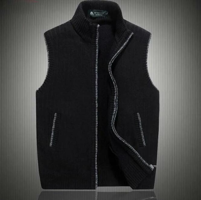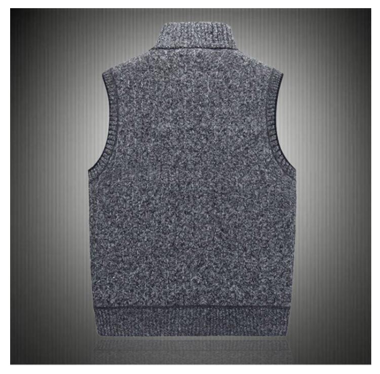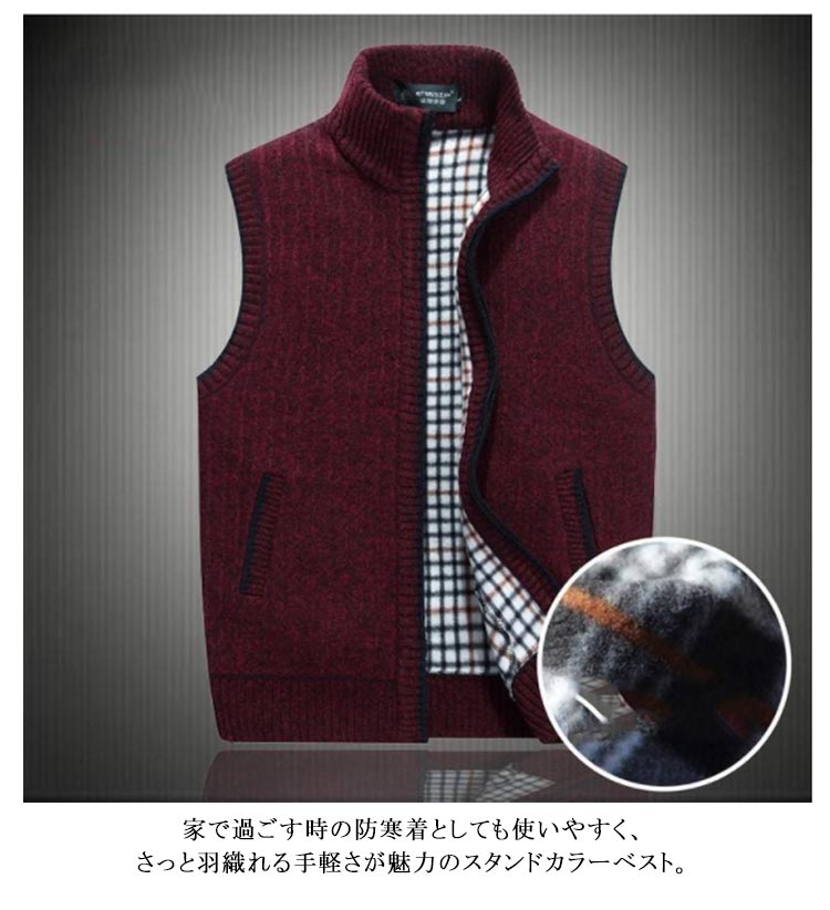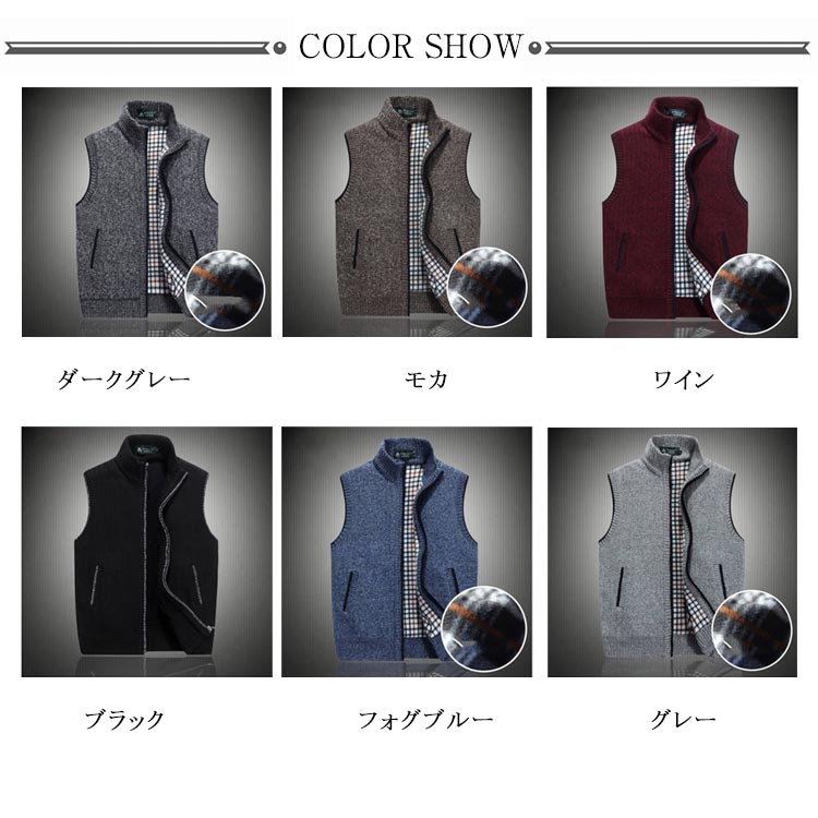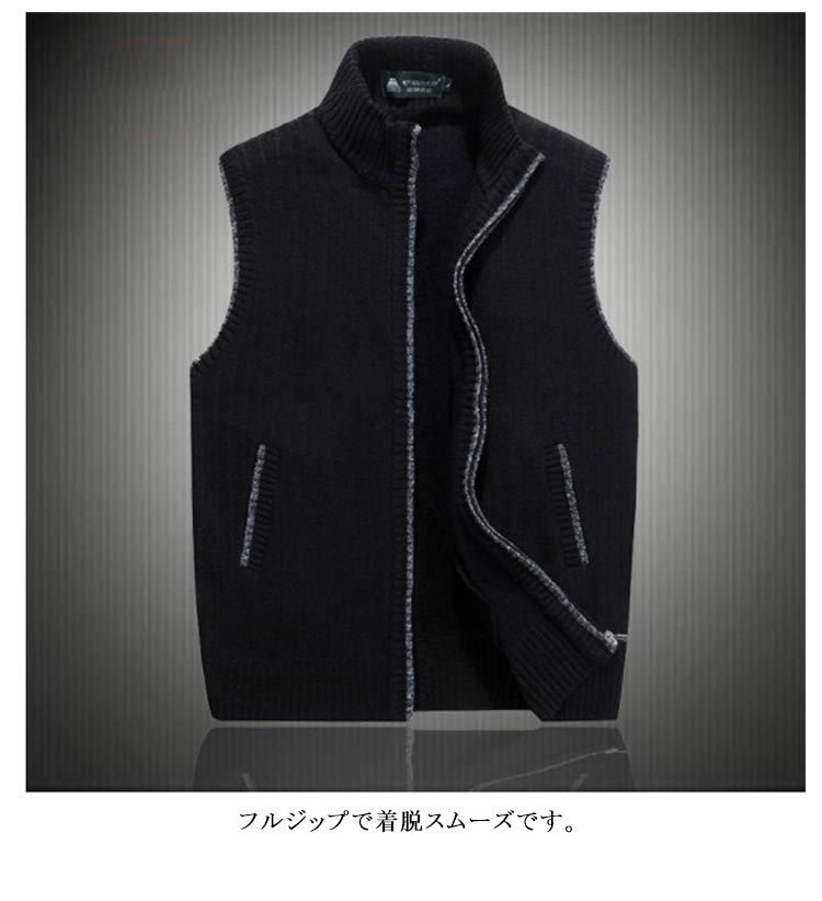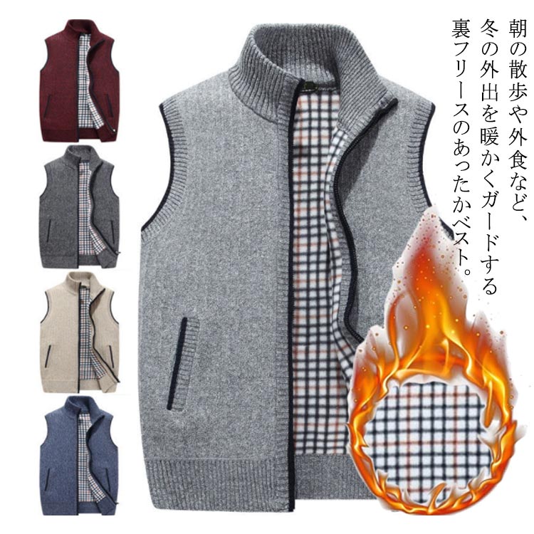 ニットベスト メンズ 男性 裏地フリース 厚手 前開き ファスナー 袖なし ノースリーブ 立ち襟 スタンドカラー ポケット付き あたたかい おしゃれ かっこいい シニアファッション 高齢者 普段着 部屋着 ホームウェア 入所 入院 外出着 秋 冬 全6色