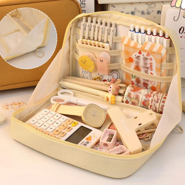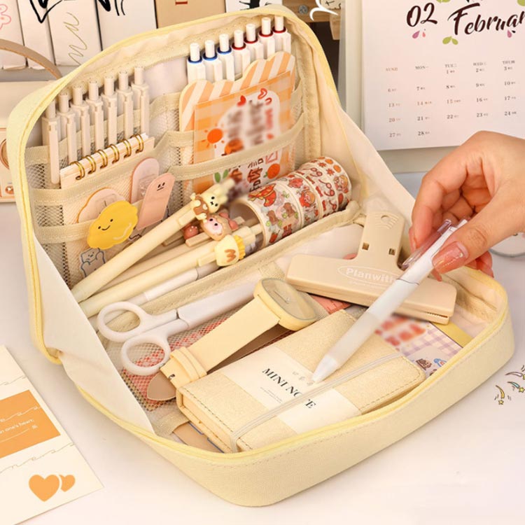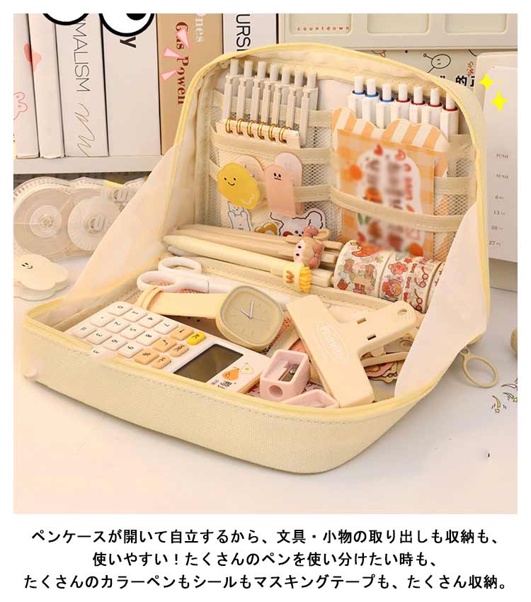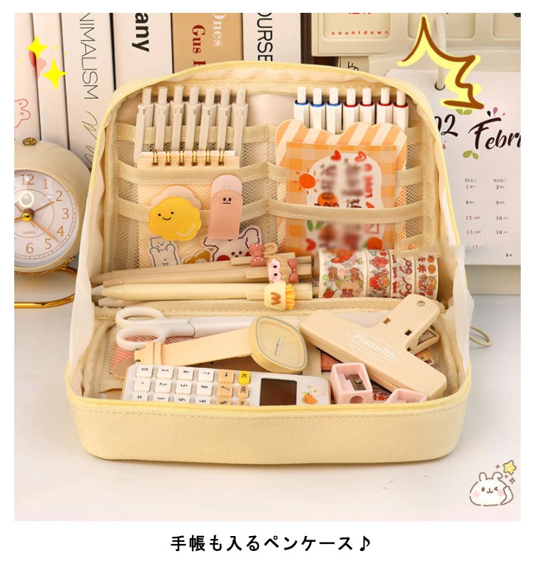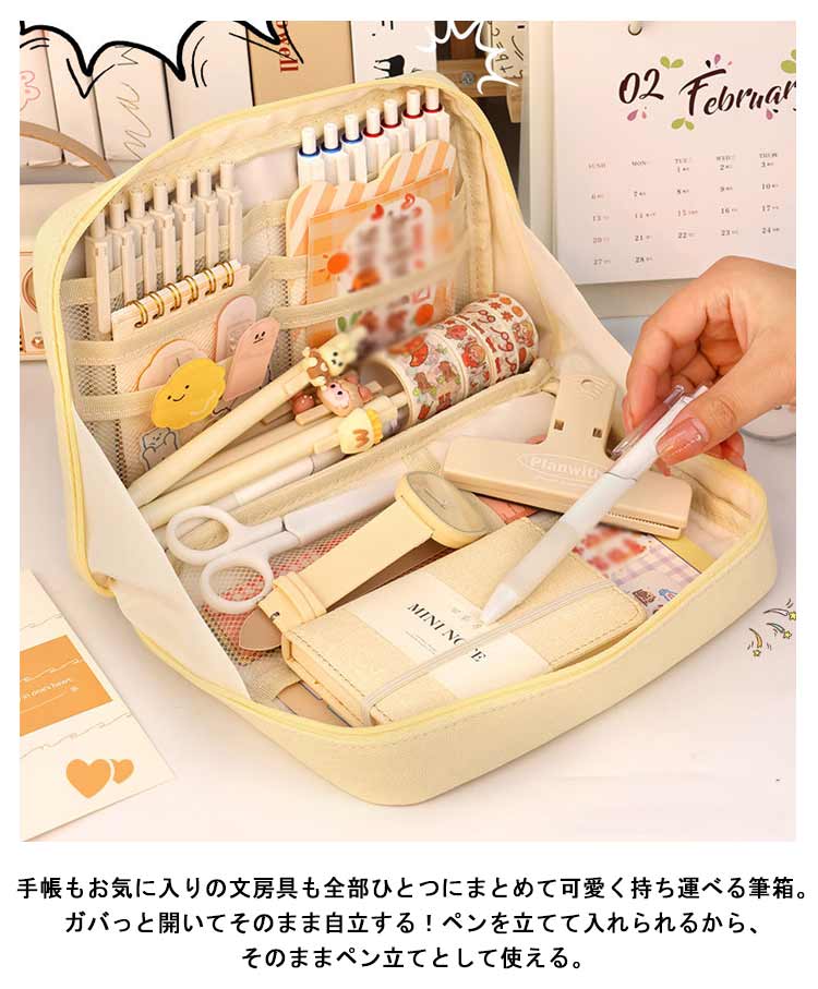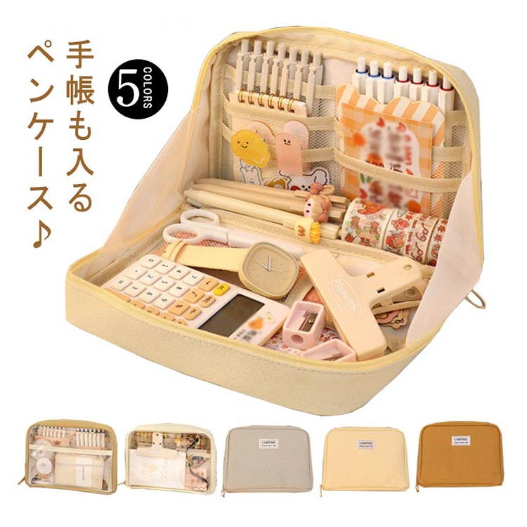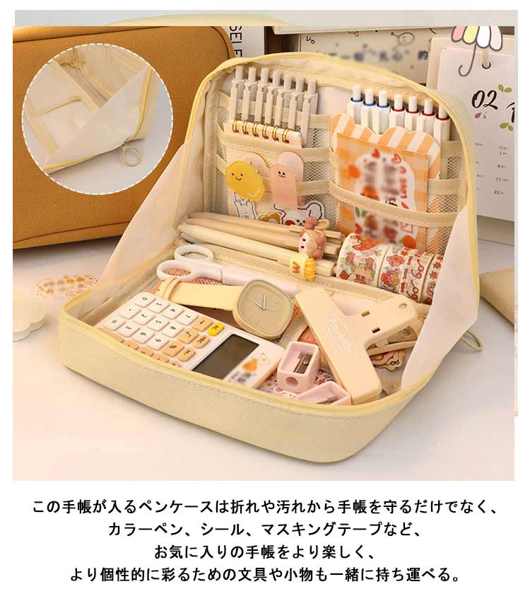 手帳も入るペンケース♪手帳もお気に入りの文房具も全部ひとつにまとめて可愛く持ち運べる筆箱。ガバっと開いてそのまま自立する!ペンを立てて入れられるから、そのままペン立てとして使える。ペンケースが開いて自立するから、文具・小物の取り出しも収納も、使いやすい!たくさんのペンを使い分けたい時も、たくさんのカラーペンもシールもマスキングテープも、たくさん収納。この手帳が入るペンケースは折れや汚れから手帳を守るだけでなく、カラーペン、シール、マスキングテープなど、お気に入りの手帳をより楽しく、より個性的に彩るための文具や小物も一緒に持ち運べる。カフェやオフィス、外出先などいつでも、どこでも、手帳やノートの時間がもっと楽しくなる。ペンケースのほか、マザーズポーチ、通帳ケース、メイクポーチ、推しポーチなど様々な用途でご利用できるマルチポーチ。丈夫なキャンバス生地、シンプルなデザインなので、男女問わずお使いいただけます。