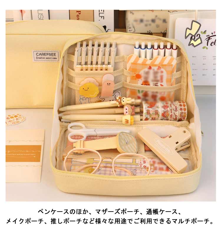 | 手帳も入るペンケース? 手帳もお気に入りの文房具も全部ひとつにまとめて可愛く持ち運べる筆箱。 ガバっと開いてそのまま自立する!ペンを立てて入れられるから、そのままペン立てとして使える。 ペンケースが開いて自立するから、文具?小物の取り出しも収納も、使いやすい!たくさんのペンを使い分けたい時も、たくさんのカラーペンもシールもマスキングテープも、たくさん収納。 この手帳が入るペンケースは折れや汚れから手帳を守るだけでなく、カラーペン、シール、マスキングテープなど、お気に入りの手帳をより楽しく、より個性的に彩るための文具や小物も一緒に持ち運べる。 カフェやオフィス、外出先などいつでも、どこでも、手帳やノートの時間がもっと楽しくなる。 ペンケースのほか、マザーズポーチ、通帳ケース、メイクポーチ、推しポーチなど様々な用途でご利用できるマルチポーチ。 丈夫なキャンバス生地、シンプルなデザインなので、男女問わずお使いいただけます。 | |