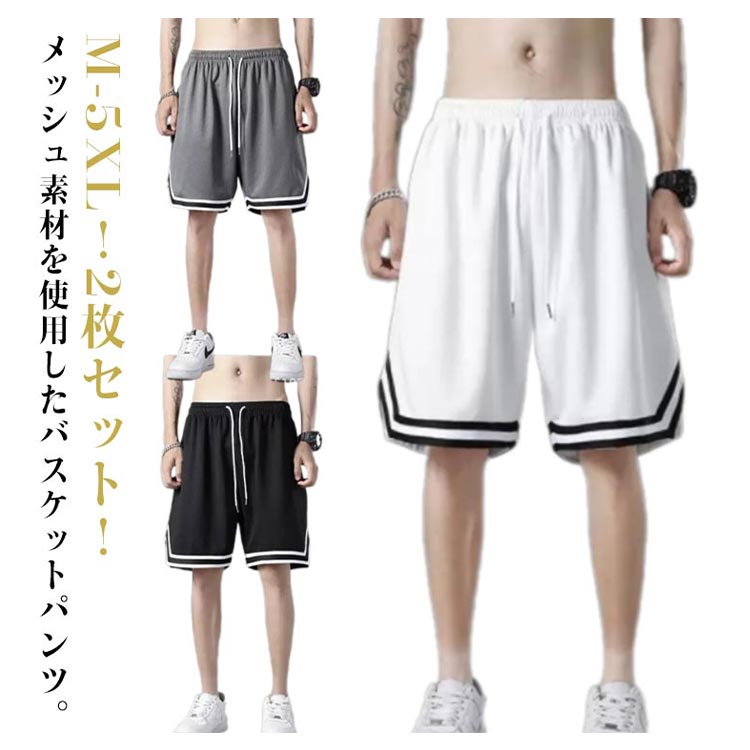 M-5XL!2枚セット!メッシュ素材を使用したバスケットパンツ。触れた瞬間ひんやりと感じる冷感素材は、スポーツ時にも涼し気に着られる一着。汗をすばやく吸収発散、肌面に汗を残しません。汗の吸収・拡散・蒸発が早いため、あらゆるスポーツシーンに最適です。軽量速乾なのでお洗濯も楽々!練習にぴったりです!ウエストにゴム・紐が入っているのでズリ落ちません。