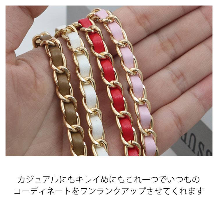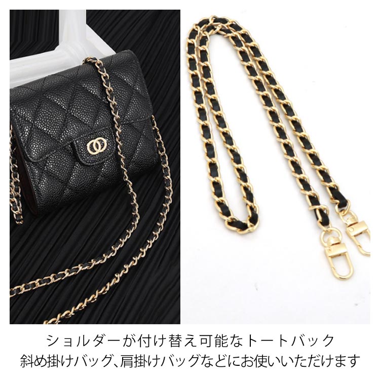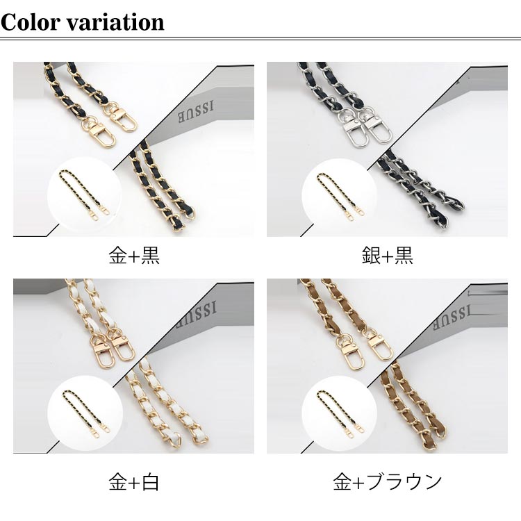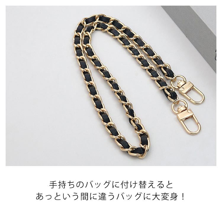 | バッグを着せ替えて楽しめるショルダーチェーンです。 チェーンの間にPUレザーを編み込んだお洒落で華やかなデザイン。 手持ちのバッグに付け替えるとあっという間に違うバッグに大変身! ショルダーが付け替え可能なトートバック、斜め掛けバッグ、肩掛けバッグなどにお使いいただけます。 カジュアルにもキレイめにもこれ一つでいつものコーディネートをワンランクアップさせてくれます。 | |