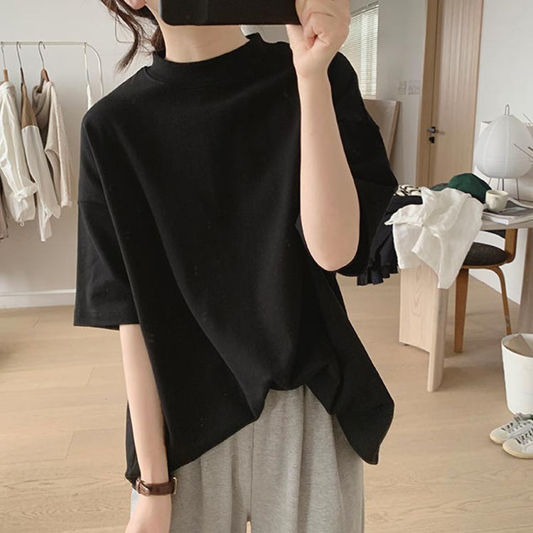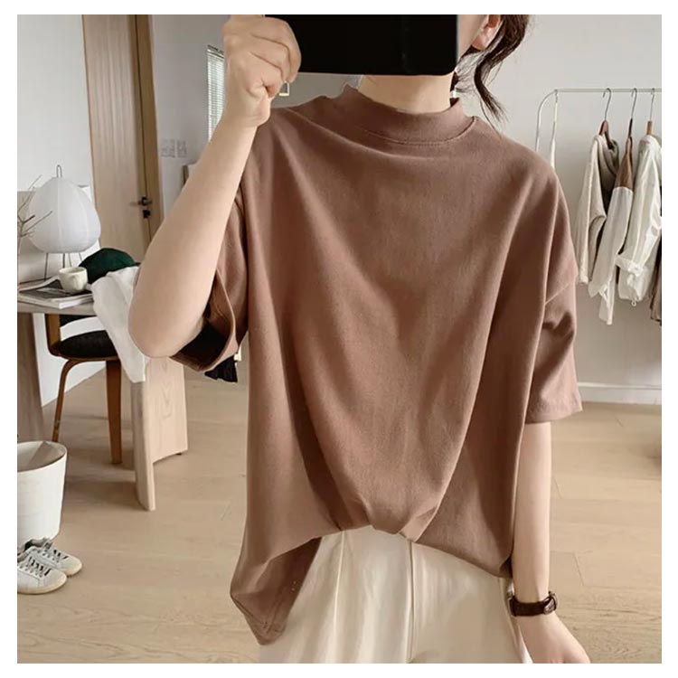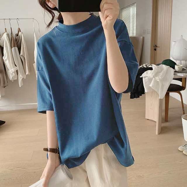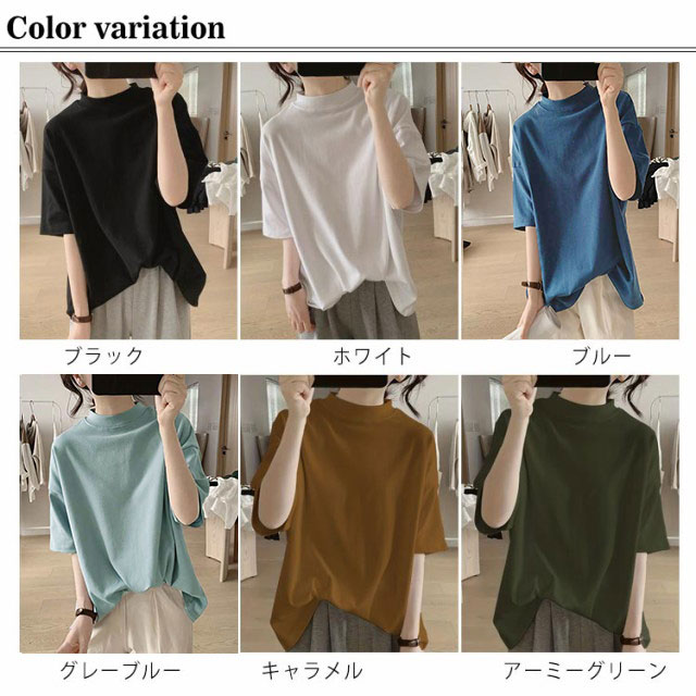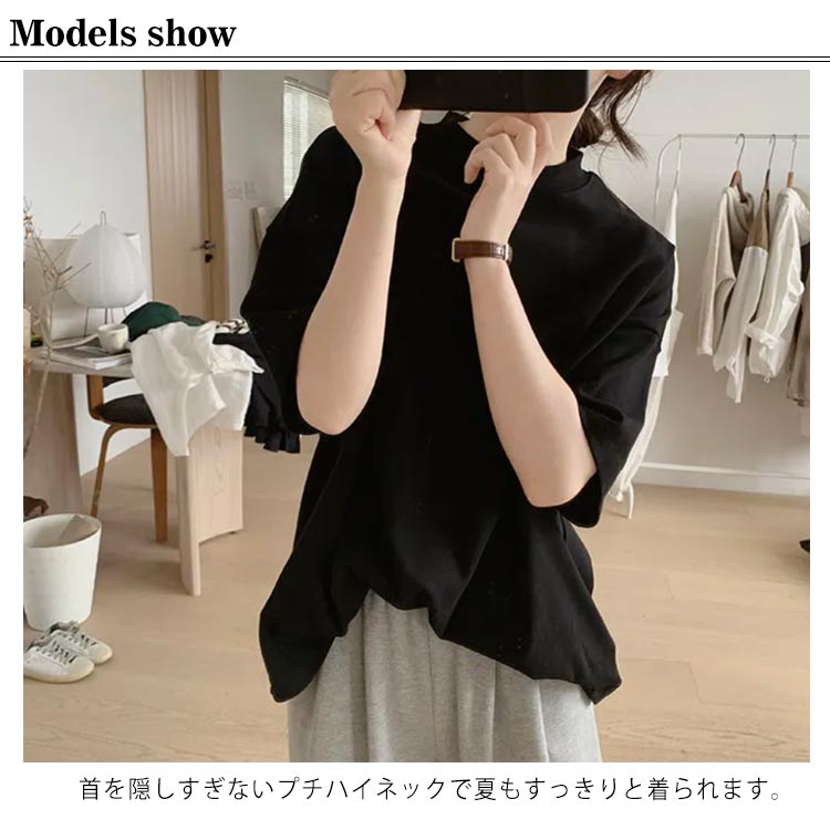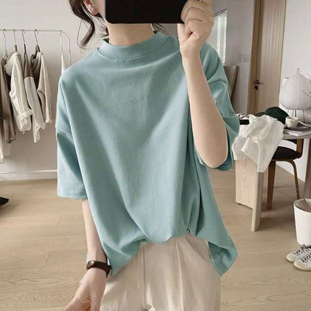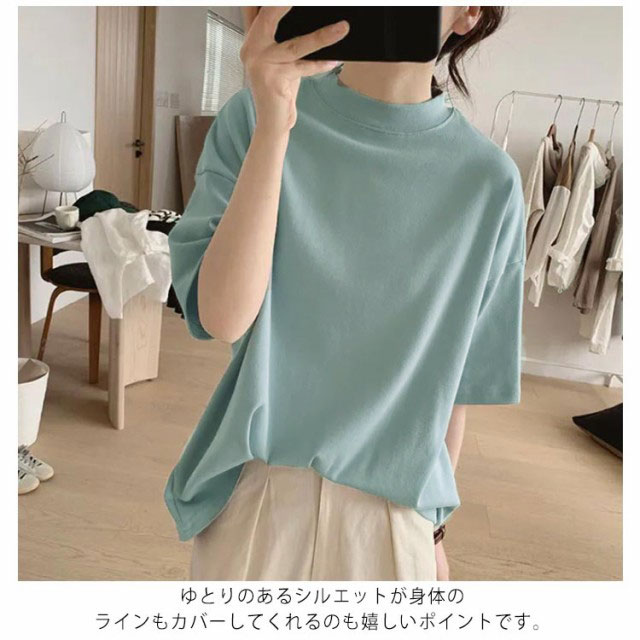 ハイネック 5分袖 レディース カットソー Tシャツ プチハイネック 半袖 tシャツ カットソー ドロップショルダー トップス 半袖ハイネックカットソー 夏 モックネック ゆったり 体型カバー 着瘦せ 大きいサイズ 無地 シンプル 通勤 薄手 大人 女性 送料無料