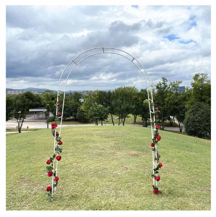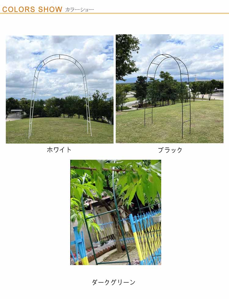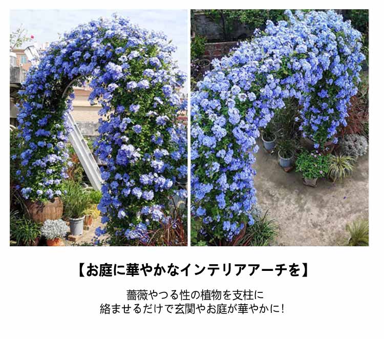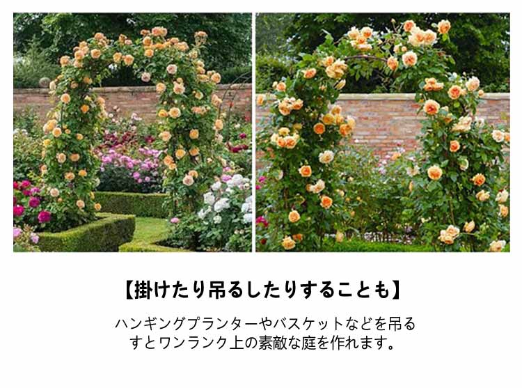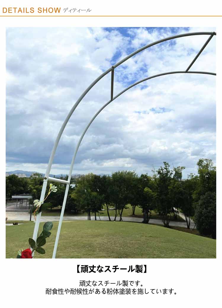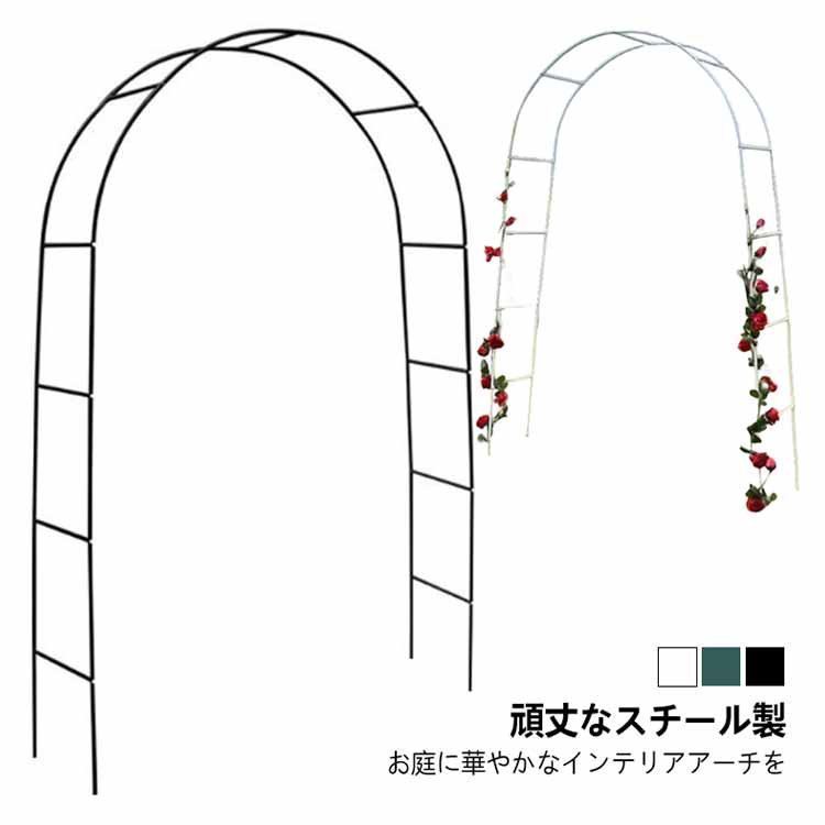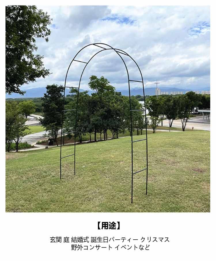 【お庭に華やかなインテリアアーチを】薔薇やつる性の植物を支柱に絡ませるだけで玄関やお庭が華やかに!シンプルなデザインと対照的な丸み曲線でどの角度から見てもお花を綺麗に魅せられます。【頑丈なスチール製】頑丈なスチール製です。耐食性や耐候性がある粉体塗装を施しています。【掛けたり吊るしたりすることも】ハンギングプランターやバスケットなどを吊るすとワンランク上の素敵な庭を作れます。【組立方法】支柱と支柱をネジで合わせて留めるだけの簡単組み立て!【幅も高さも、置き場所に合わせて調節可能!】140x240cm、180x200cm、200x220cmの3サイズでの設置が可能。【用途】玄関 庭 結婚式 誕生日パーティー クリスマス 野外コンサート イベントなど