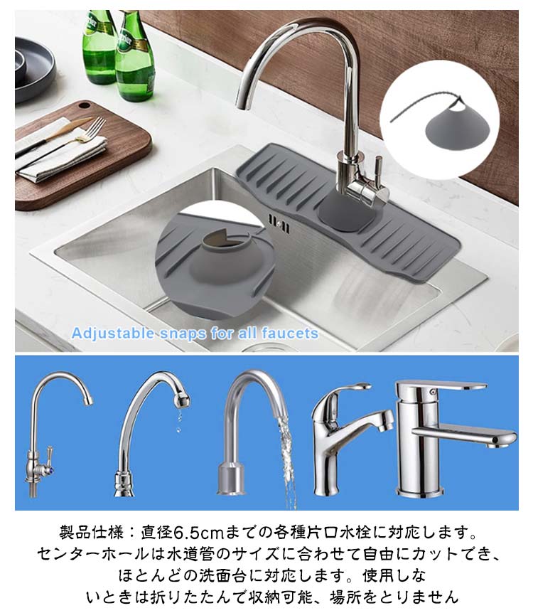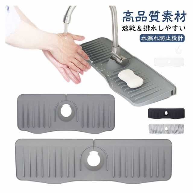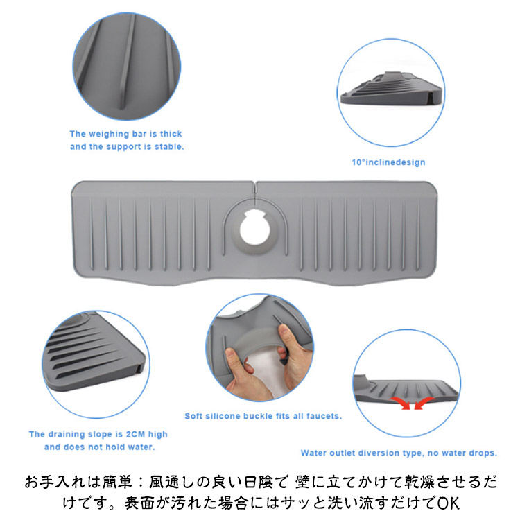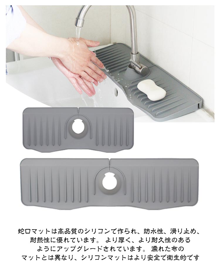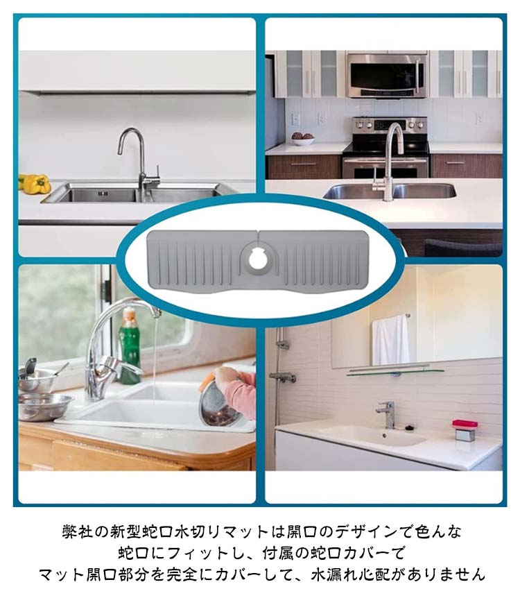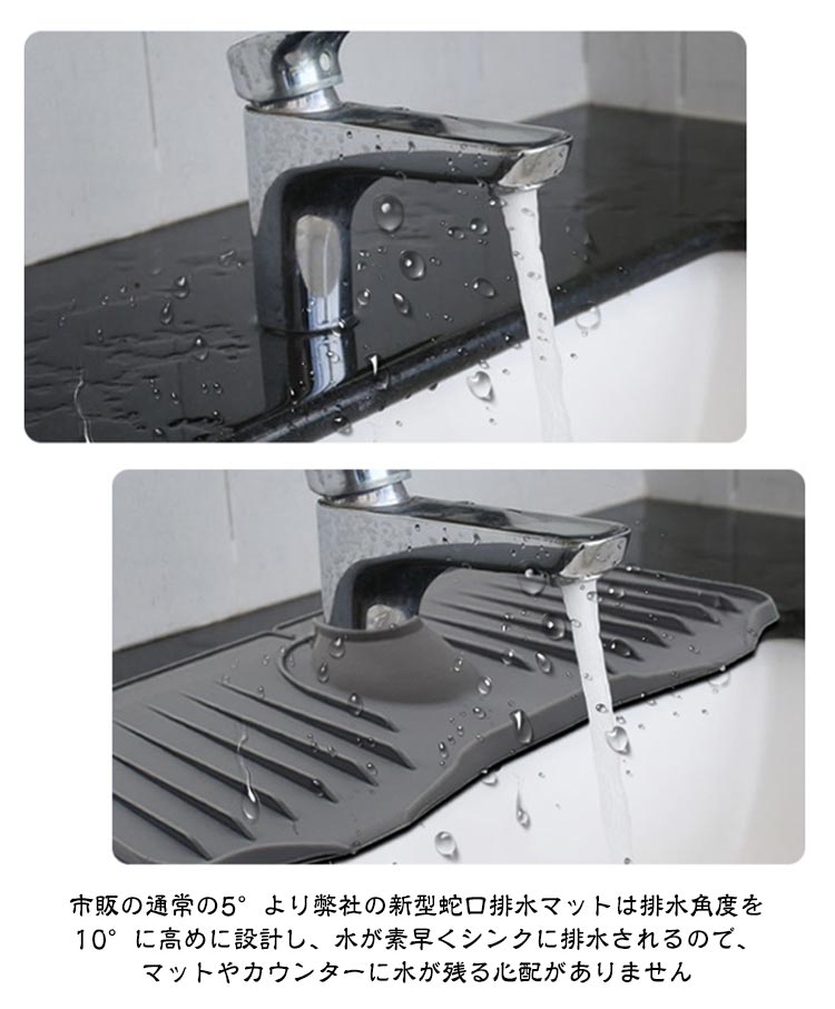 高品質素材:蛇口マットは高品質のシリコンで作られ、防水性、滑り止め、耐熱性に優れています。 より厚く、より耐久性のあるようにアップグレードされています。 濡れた布のマットとは異なり、シリコンマットはより安全で衛生的です速乾&排水しやすい:市販の通常の5°より弊社の新型蛇口排水マットは排水角度を10°に高めに設計し、水が素早くシンクに排水されるので、マットやカウンターに水が残る心配がありません水漏れ防止設計:通常のシリコン蛇口水切りマットを取り付けても、マット開口から水が溜まってしまって細菌が繁殖しやすい。弊社の新型蛇口水切りマットは開口のデザインで色んな蛇口にフィットし、付属の蛇口カバーでマット開口部分を完全にカバーして、水漏れ心配がありません製品仕様:直径6.5cmまでの各種片口水栓に対応します。 センターホールは水道管のサイズに合わせて自由にカットでき、ほとんどの洗面台に対応します。使用しないときは折りたたんで収納可能、場所をとりませんお手入れは簡単:風通しの良い日陰で 壁に立てかけて乾燥させるだけです。表面が汚れた場合にはサッと洗い流すだけでOK