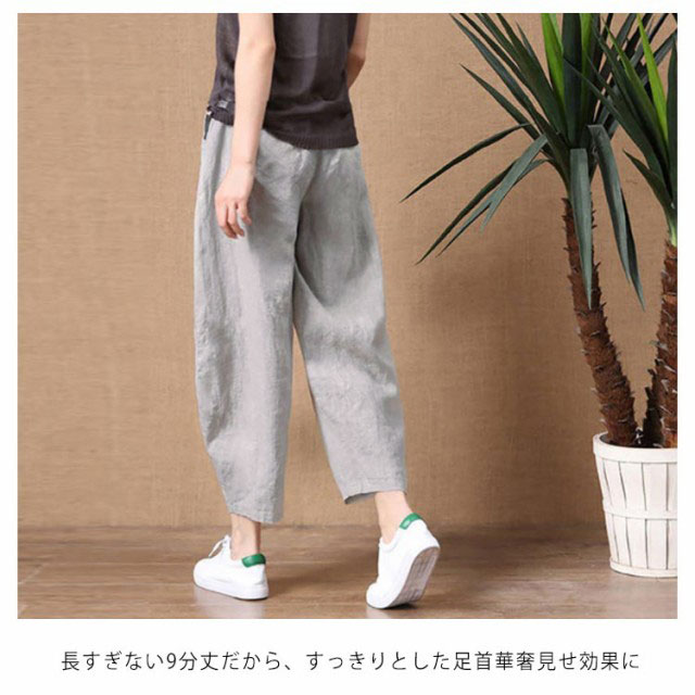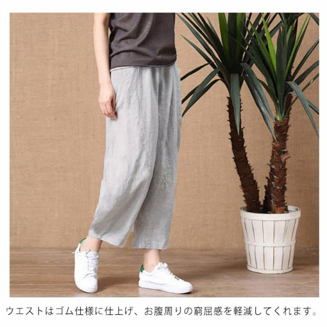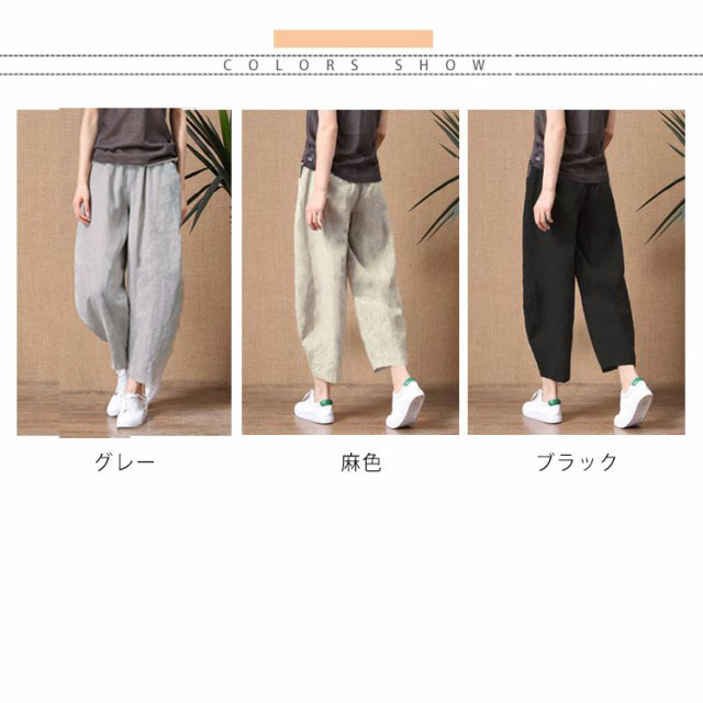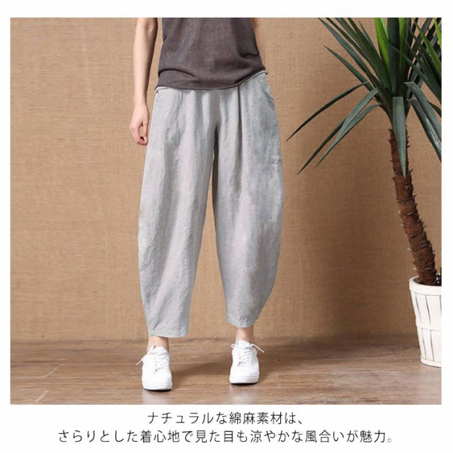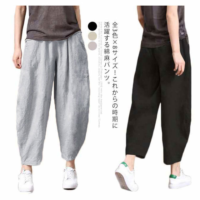 全3色×8サイズ!これからの時期に活躍する綿麻パンツ。ナチュラルな綿麻素材は、さらりとした着心地で見た目も涼やかな風合いが魅力。体形を気にせず気軽に履くだけで、オシャレ上級者コーデになるのもポイントです!!ウエストはゴム仕様に仕上げ、お腹周りの窮屈感を軽減してくれます。 長すぎない9分丈だから、すっきりとした足首華奢見せ効果に毎日の着こなしを彩る、ナチュラルな主役級綿麻ボトムスをぜひお試しくださいませ。
