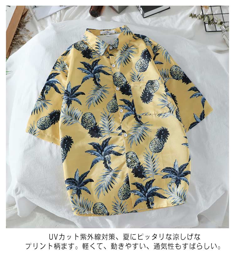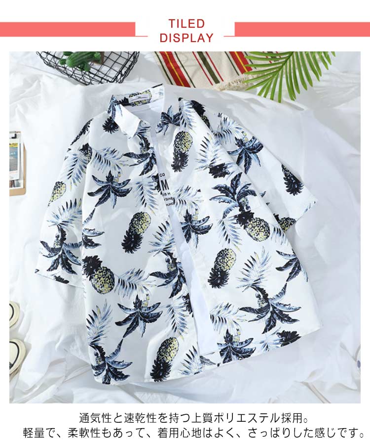 【ポリエステル】通気性と速乾性を持つ上質ポリエステル採用。軽量で、柔軟性もあって、着用心地はよく、さっぱりした感じです。【流行性】カジュアルで夏シーズンのコーデに絶対入れたい着心地のやさしいアロハシャツ。個性的流行の配色、華やかな柄でリゾート感がたっぷり。【UVカット】UVカット紫外線対策、夏にピッタリな涼しげなプリント柄ます。軽くて、動きやすい、通気性もすばらしい。【カジュアル 】オシャレなデザインで、コーディネートしやすく、スポーツ、バケーション、リゾート、ウェディング、ビーチ、結婚式、イベント、海外旅行、ハワイ、沖縄旅行など大幅カジュアルシーンにおすすめです。【通気】軽くて動きやすい、着心地が良くて、通気性もすばらしいメンズシャツ、汗を早く吸収して乾燥も早いので夏に快適に過ごせます。これ一枚だけ着ると炎天下でも涼しかったです。