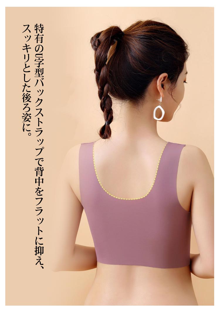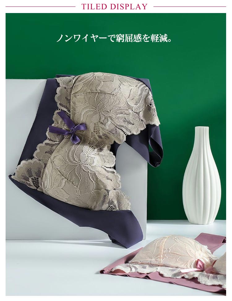| 着用感ゼロ!大きな胸を小さく見せるブラ。 やや薄手のカップで、ボリュームが出すぎないのも嬉しいポイント。 ノンワイヤーで窮屈感を軽減。 花柄レースがしっかり胸をつつんで綺麗なシルエットを作ります。 脇高仕様で脇のお肉をしっかりとおさえ、大きな胸のすっきり細見えを実現します。 ストラップも太目仕様なので、肩への食い込みも軽減されます。 特有のU字型バックストラップで背中をフラットに抑え、スッキリとした後ろ姿に。 | |