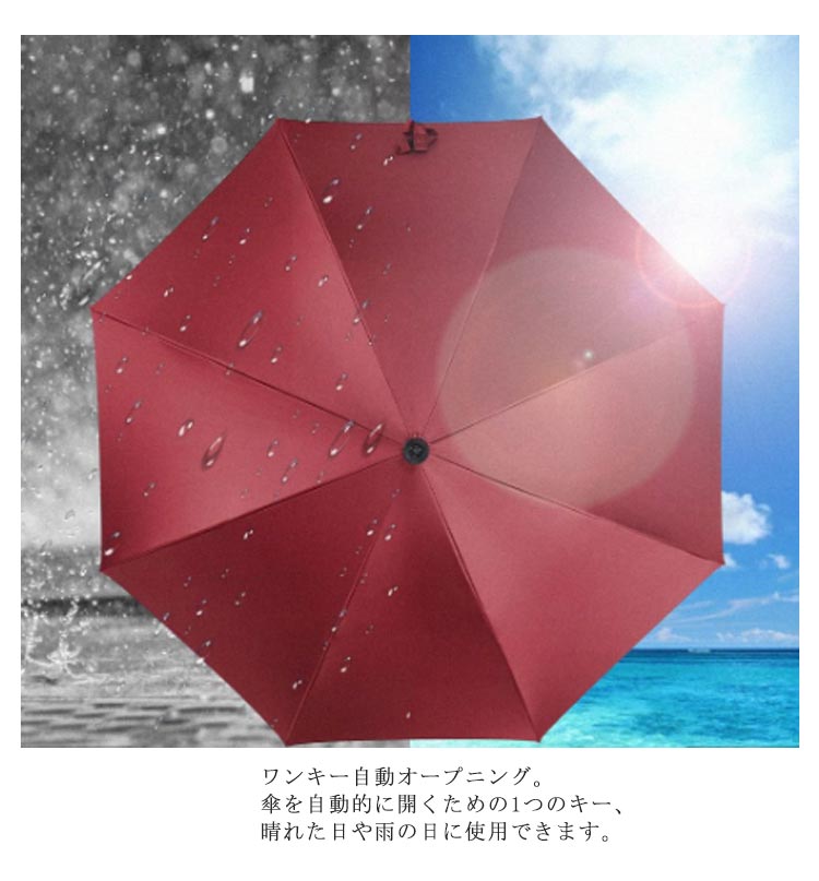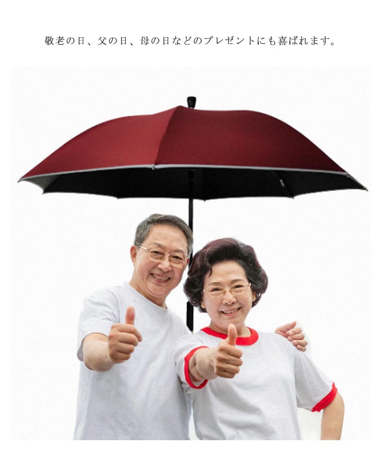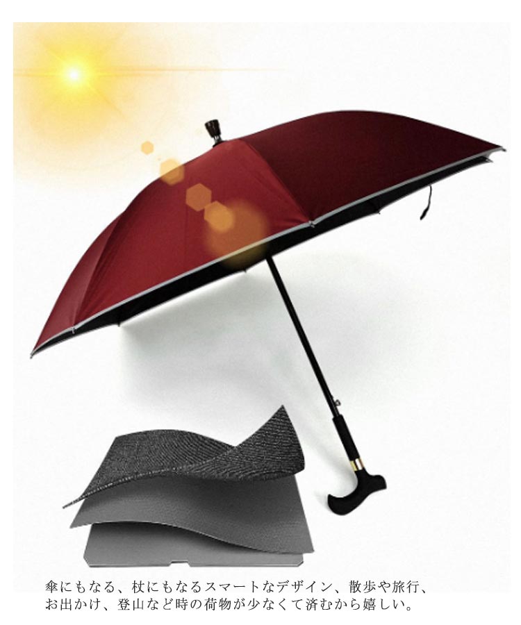 ステッキとしてご使用になれるステッキ傘。軽量でお年寄りの旅行に便利!ワンキー自動オープニング。傘を自動的に開くための1つのキー、晴れた日や雨の日に使用できます。杖タイプのハンドル。取っ手は持ちやすく、 傘は杖としても使えます。安全反射ストリップ。夜のより安全な旅行。安定した滑り止めベース。傘のキャップは丈夫でしっかりしていて、吸盤はグリップ力が強く、安定して滑りにくいです。傘にもなる、杖にもなるスマートなデザイン、散歩や旅行、お出かけ、登山など時の荷物が少なくて済むから嬉しい。敬老の日、父の日、母の日などのプレゼントにも喜ばれます。