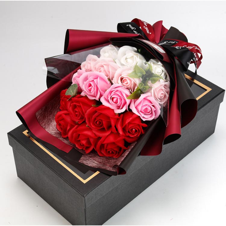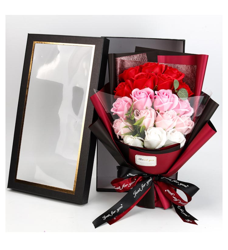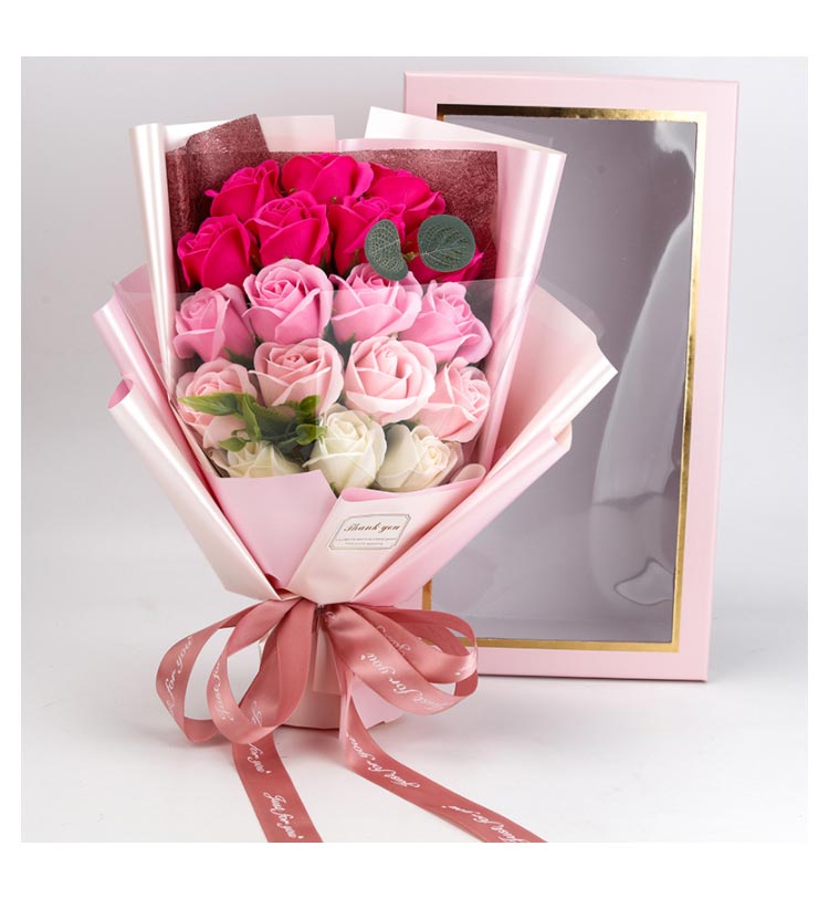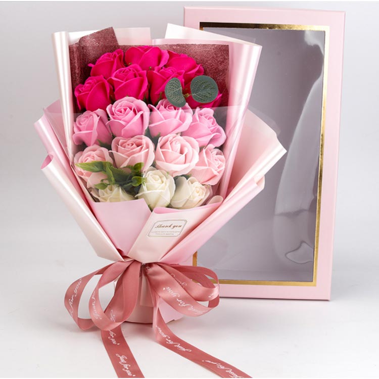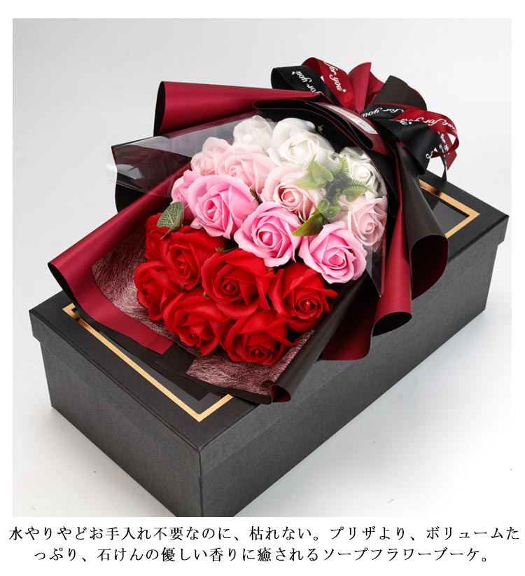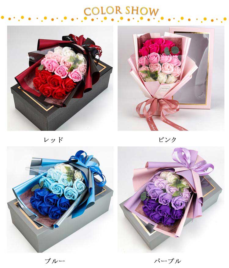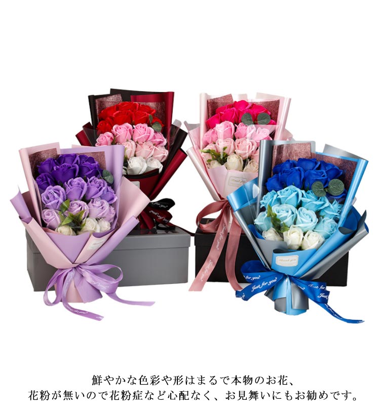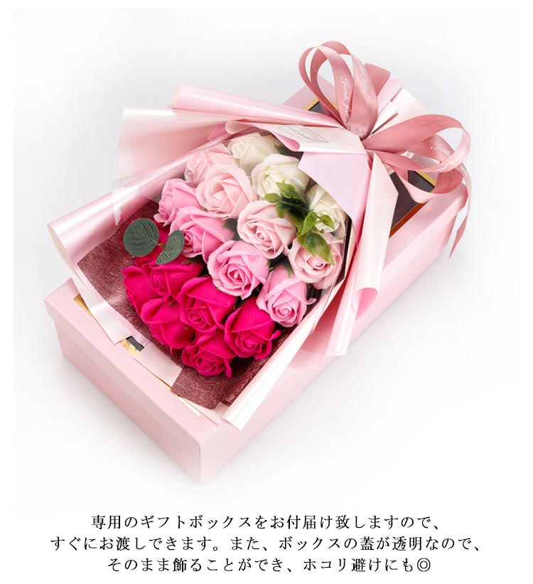 そのまま飾ることができる♪専用のギフトボックスをお付届け致しますので、すぐにお渡しできます。また、ボックスの蓋が透明なので、そのまま飾ることができ、ホコリ避けにも◎水やりやどお手入れ不要なのに、枯れない。プリザより、ボリュームたっぷり、石けんの優しい香りに癒されるソープフラワーブーケ。鮮やかな色彩や形はまるで本物のお花、花粉が無いので花粉症など心配なく、お見舞いにもお勧めです。お誕生日プレゼントや母の日、敬老の日の贈り物や結婚祝いや記念日のギフトなど大切な方への特別な贈り物に最適。
