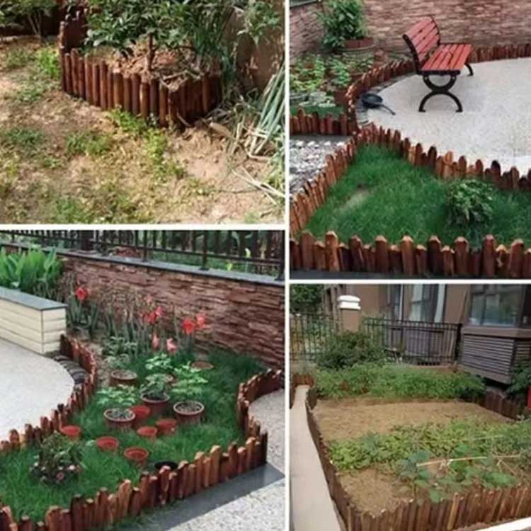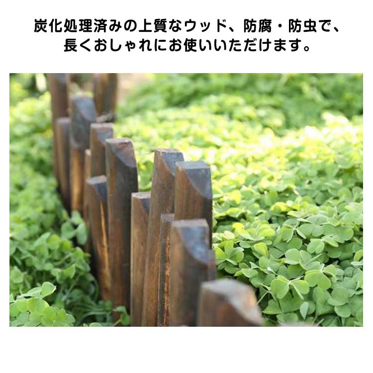 地面に差込むだけの簡単木製フェンスです。炭化処理済みの上質なウッド、防腐・防虫で、長くおしゃれにお使いいただけます。天然木の風合いとシンプルなデザインが、お庭のアクセントになります。お庭や玄関のプランターの周りに使ったカバー、花壇の仕切り、ガーデニングのアクセントになるアイテムです。