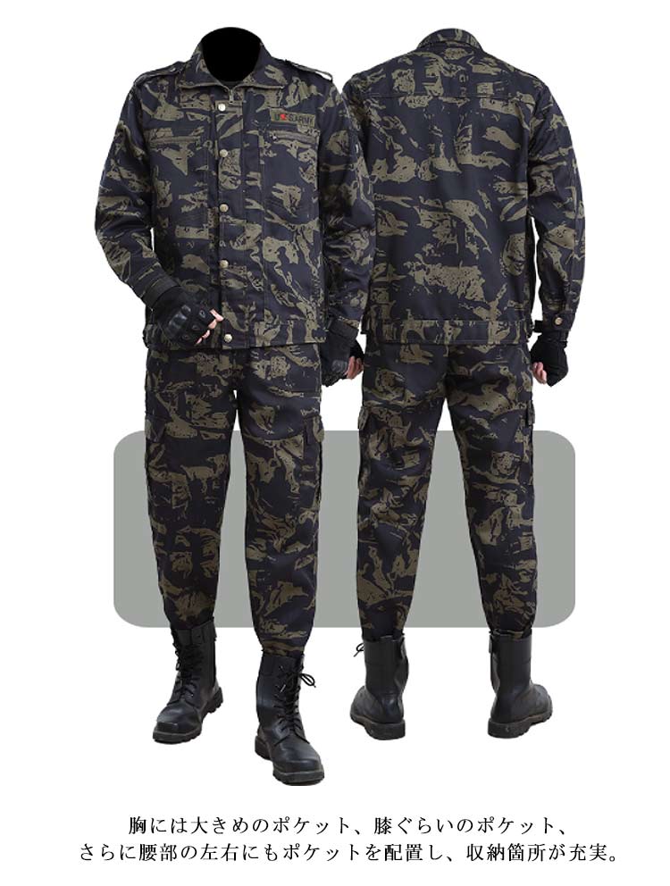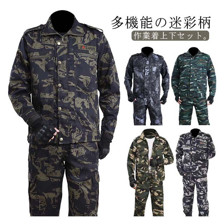 上下セット 作業服 迷彩柄 送料無料 メンズ ジャケット ロングパンツ ミリタリー カーゴパンツ ワーク 作業着 丈夫 アメカジ おしゃれ マルチポケット カジュアル お仕事 春 秋 農業 修理工場 物流 アウトドア