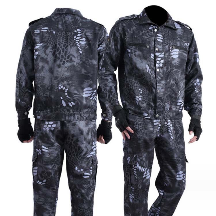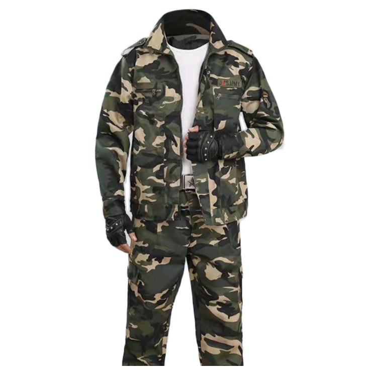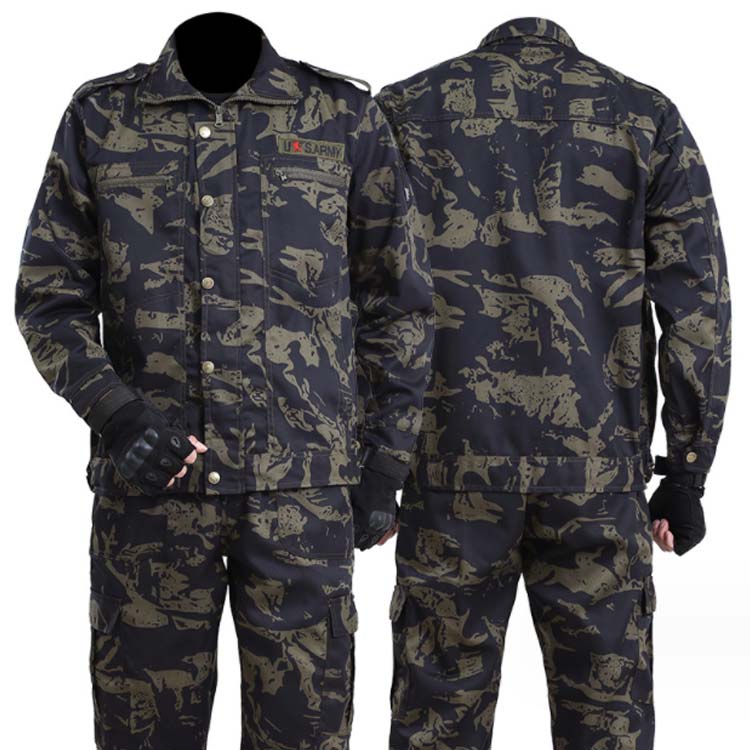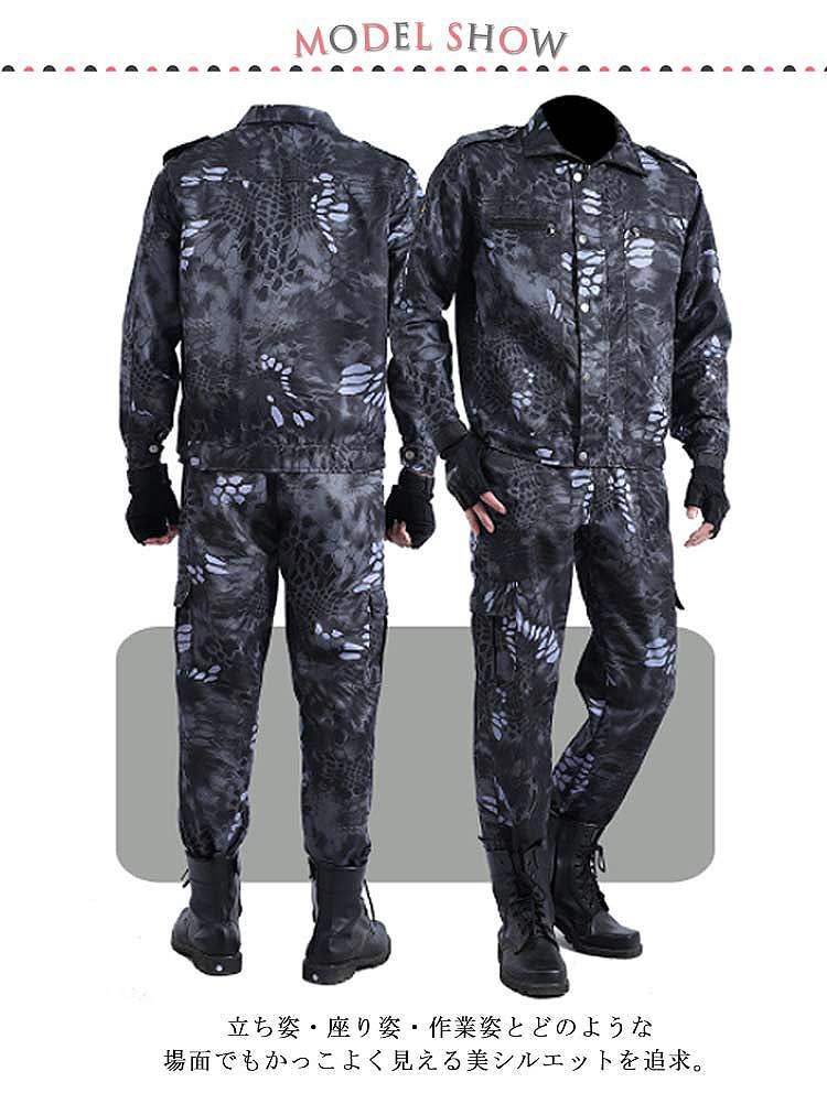多機能の迷彩柄作業着上下セット。立ち姿・座り姿・作業姿とどのような場面でもかっこよく見える美シルエットを追求。胸には大きめのポケット、膝ぐらいのポケット、さらに腰部の左右にもポケットを配置し、収納箇所が充実。シンプルな中に光るこだわりのデザイン。作業シーンを選ばないワークウェア!カジュアルから作業着まで使えて、長時間愛用できるアイテム。