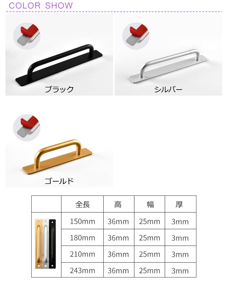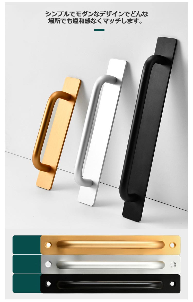 取り付け簡単!粘着タイプの取っ手。引き出しハンドルは、アルミニウム素材を使用します。表面が滑らかなので使い心地も良く、傷の心配もありません。安心してお使いいただけます。シンプルでモダンなデザインでどんな場所でも違和感なくマッチします。釘なし接着剤のの取り付け:①必要な釘なし接着剤を用意する。②釘なし接着剤を取手の底に均一に塗ります。③必要な取り付け位置に貼り、手で押します。④インストールが完了してから72時間で正常に使用できます。ネジの取り付け:①ねじ正面固定木戸用ドライバでねじを締め付ける。②ネジを締めて取り付け完了!
